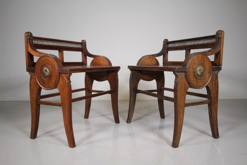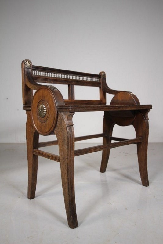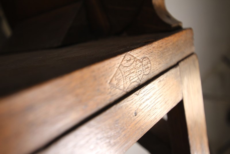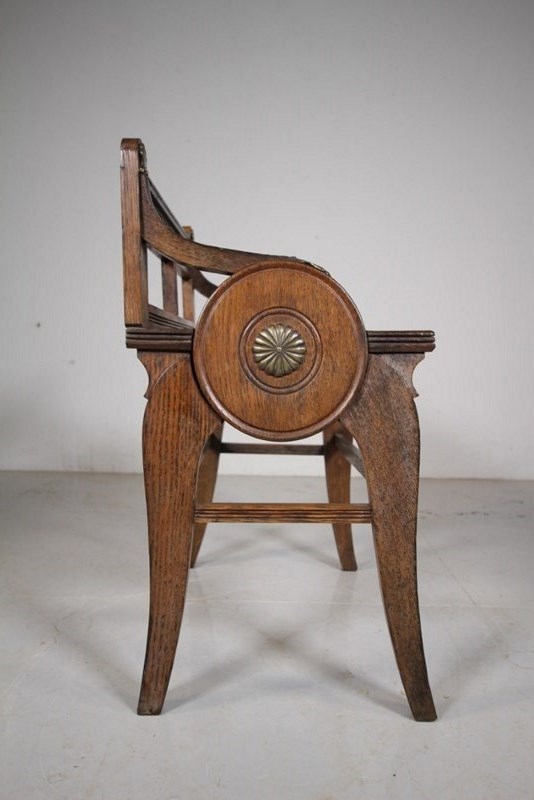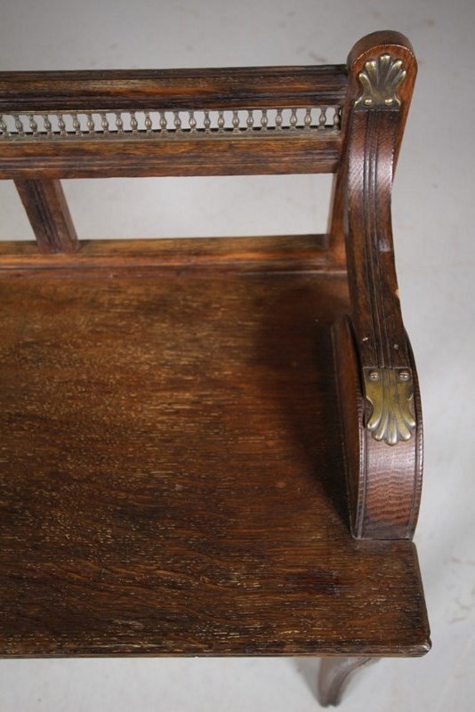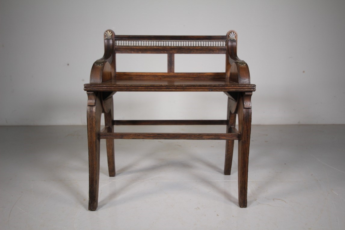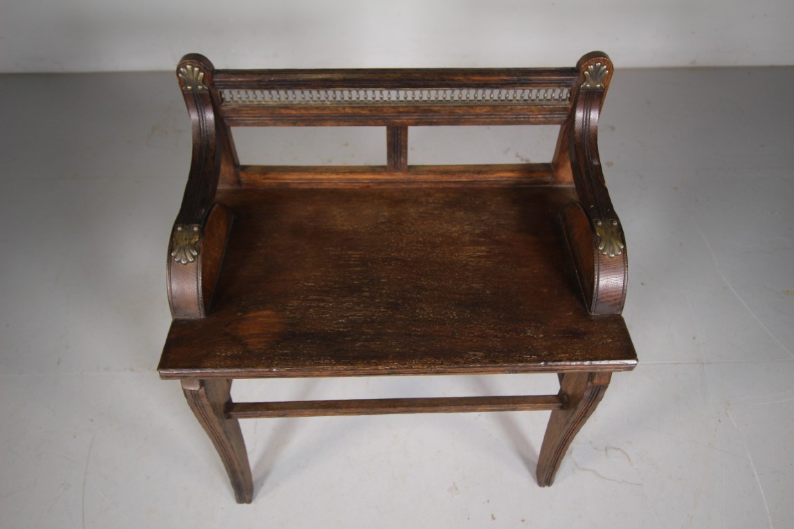 A superb quality English antique window seat /bench by JAS Shoolbred in 1890. This example is beautifully made in solid oak with decorative brass mounts. In excellent, original and strong condition, has the Shoolbred makers kite mark on the back. Stands very well on sabre front legs which are joined by stretchers. We also have another in walnut.