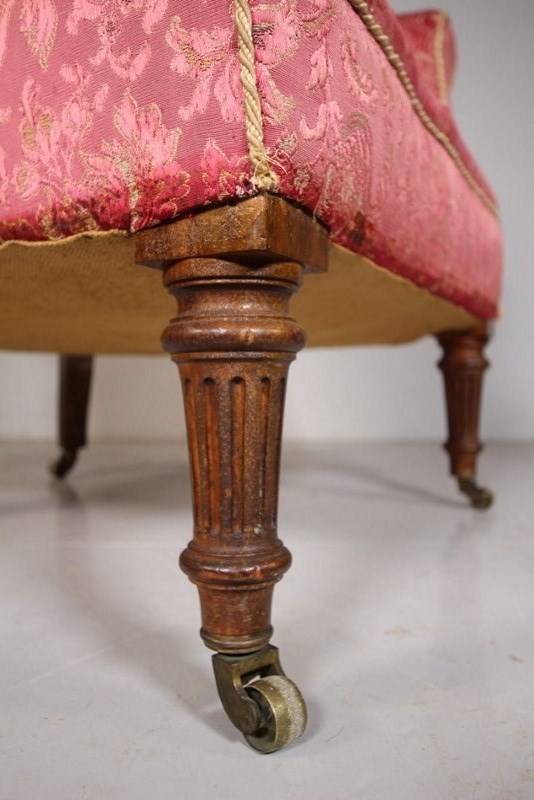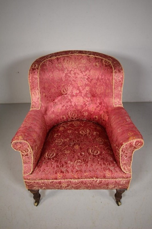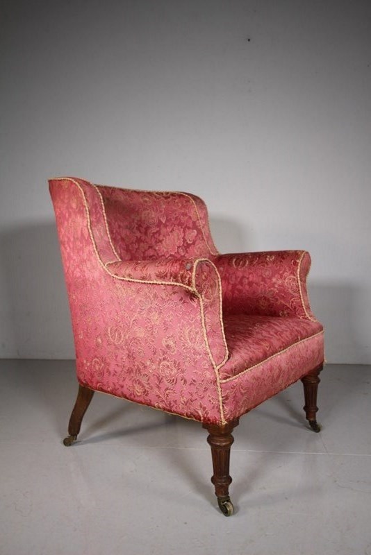 A superb quality, traditionally upholstered large scale and comfortable antique armchair that has a curved, barrel back and stands on quality, reeded and turned front legs. Larger proportions than usual, in excellent intact condition and the legs are complete with the original quality brass castors. English and dating to around 1840-50.