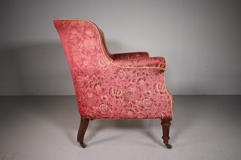 Ample English 19Th Century Antique Upholstered Barrel Back Armchair