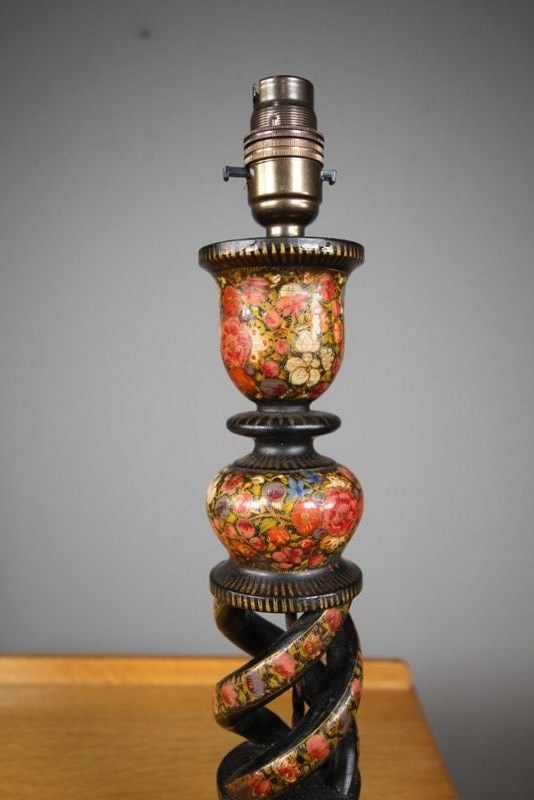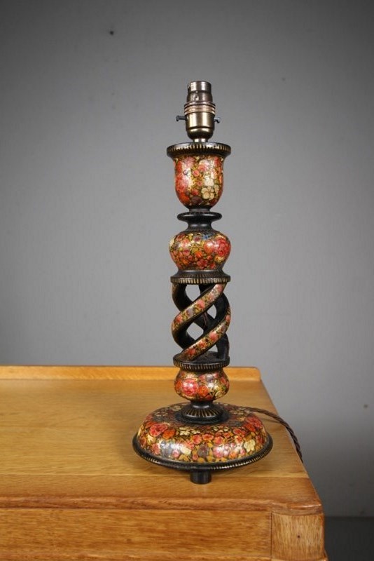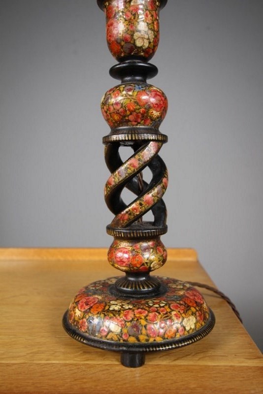 A beautiful hand painted Kashmiri decorated antique table lamp that is in superb condition. Stands on a circular base with three bun feet and an open twist stem. Newly rewired and tested, dates to 1920.