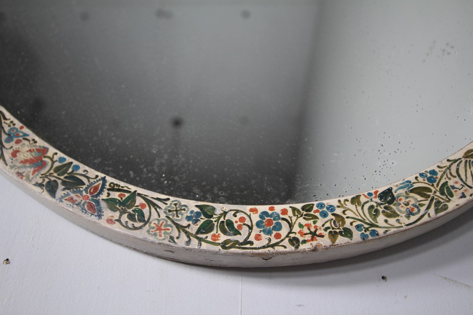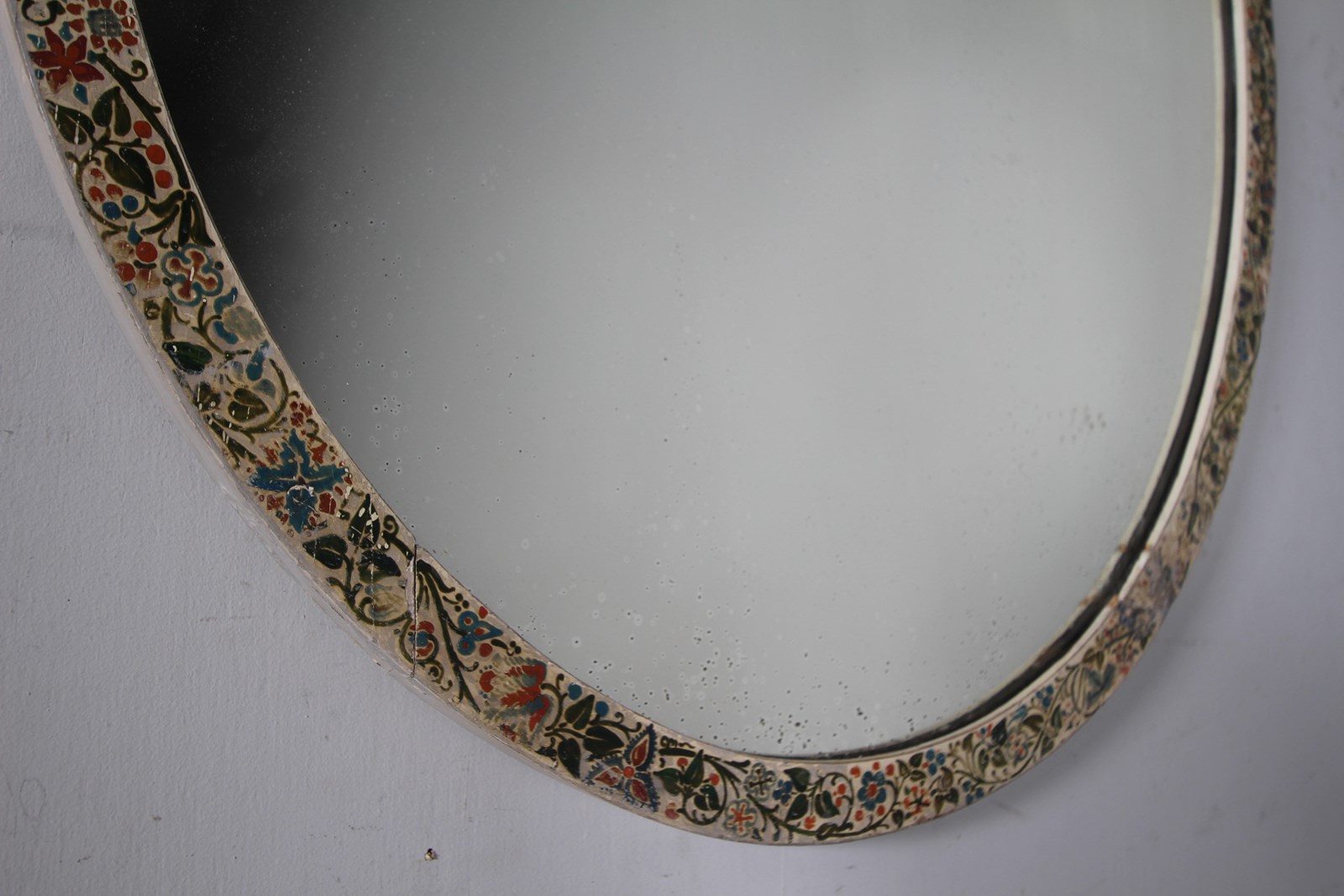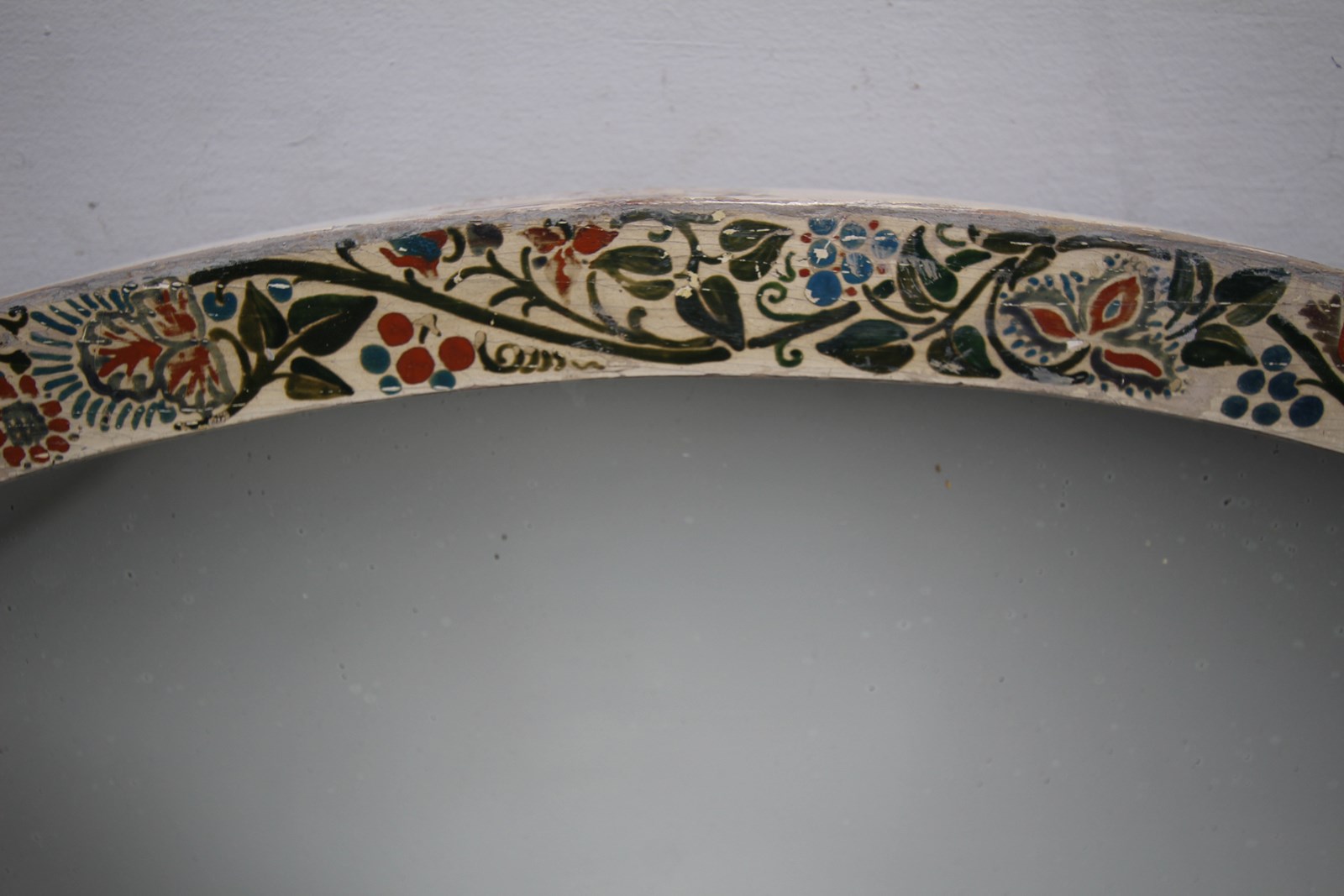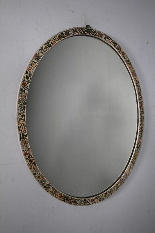 A wonderful hand painted antique large oval wall mirror that dates to around 1870. The colourful running hand painted work features flowers and foliage in an Arts & Crafts / Aesthetic manner. In superb condition and complete with the original mirror plate and pine backboards.