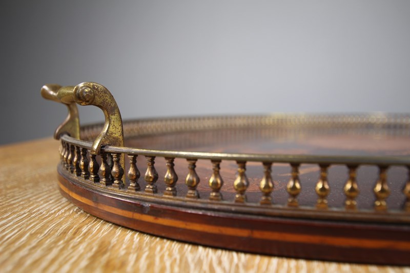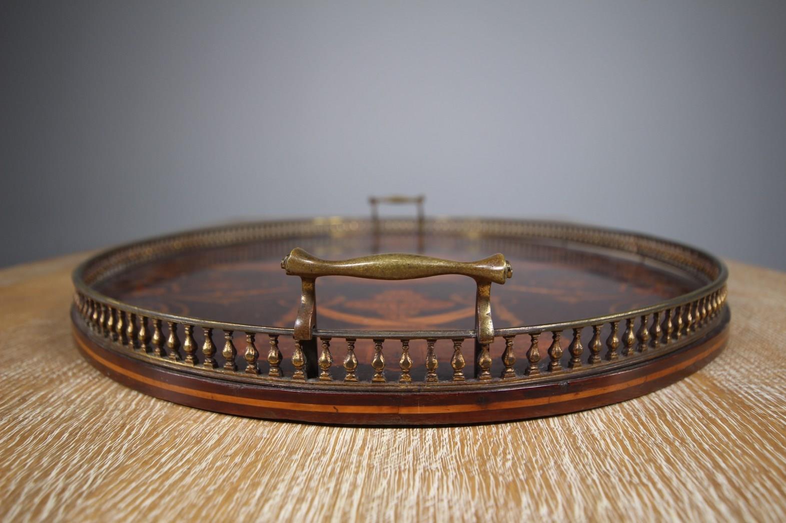 A superb, high quality English antique finely inlaid large oval Butler’s serving tray with a beautiful brass baluster gallery and carry handles. So completely original and a wonderful, original colour, as good a tray you will find anywhere. In such amazing condition, this large oval antique English serving tray is smothered with fine inlays of various coloured timbers along with classical urns, foliage, swags and flowers inlaid into the solid mahogany tray. A very beautiful piece that dates to around 1840.