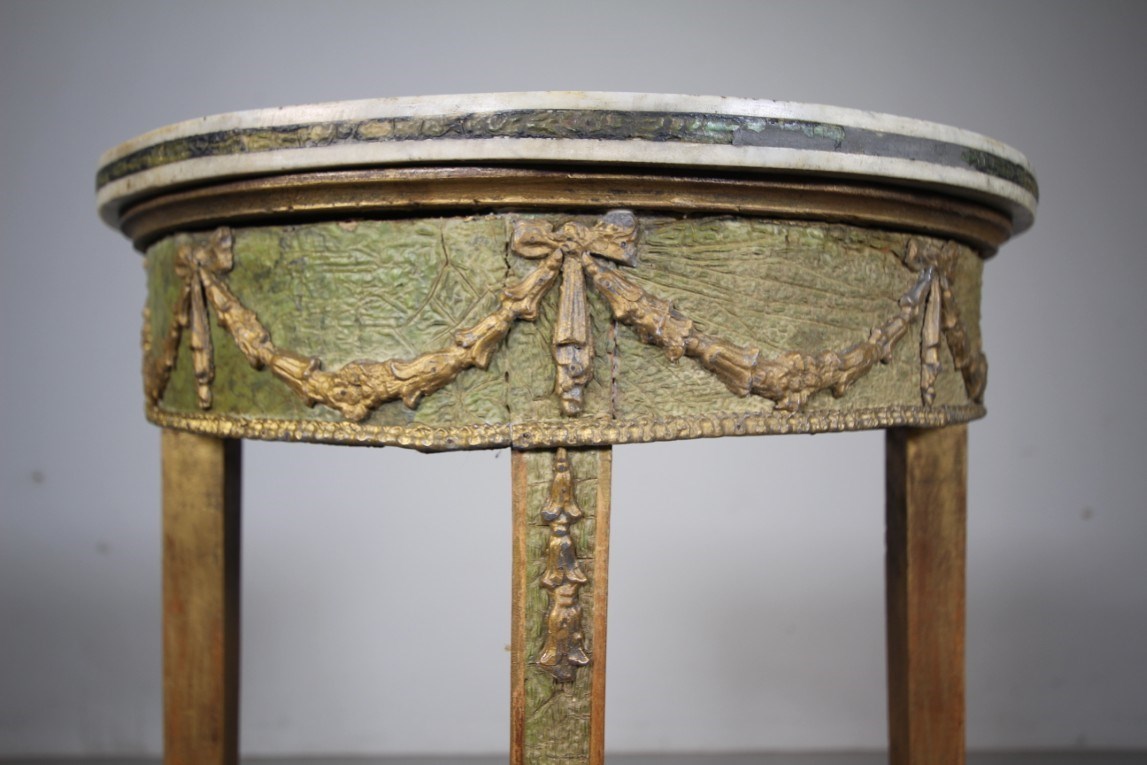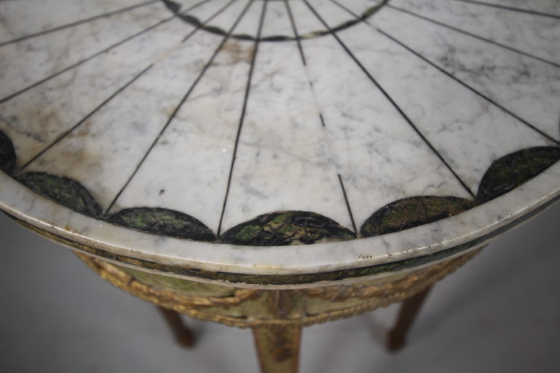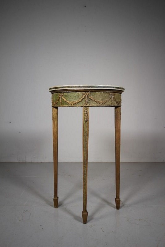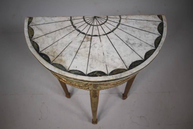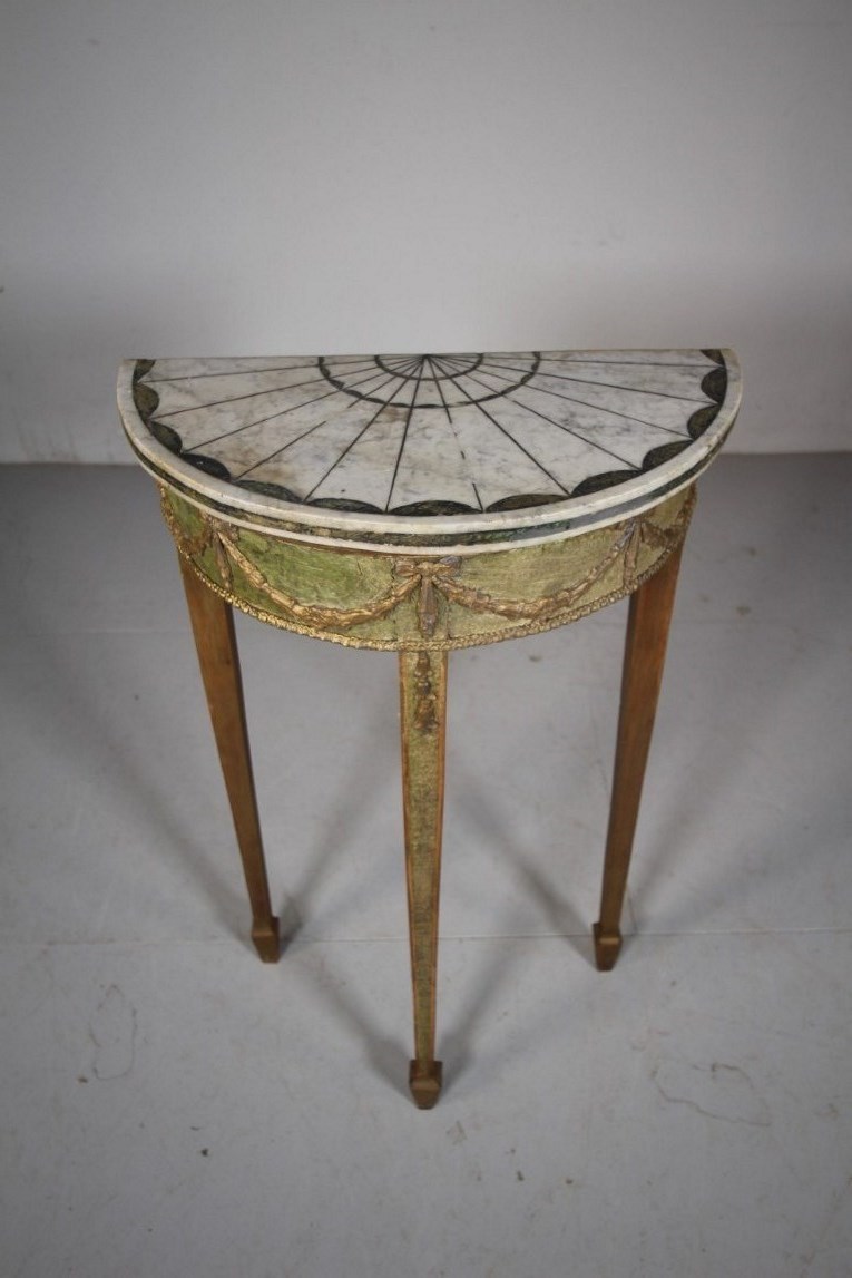 Beautiful Regency Antique Console with Amazing Marble Top This is a wonderful, early 19th century English antique demi lune console side table of high quality. The antique painted pine table base stands on square legs that finish with a spade foot and is decorated with original swags along the frieze. The original shaped marble table top has a fabulous, recessed design that is in filled with lead. A very decorative smaller Regency antique country house side table that dates to around 1820. DimensionsHeight: 76.5cm (30.36")Width: 47cm (18.65")Depth: 24cm (9.52")