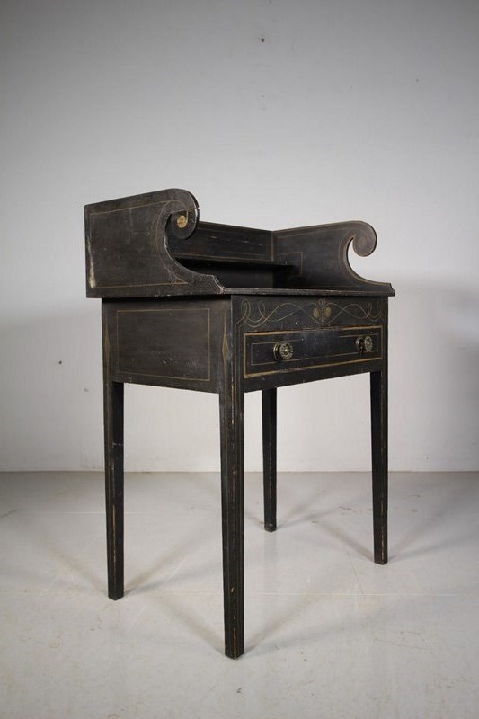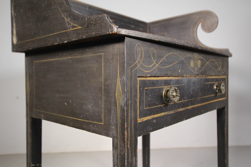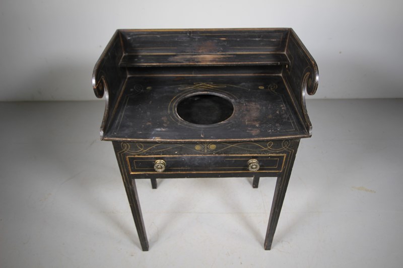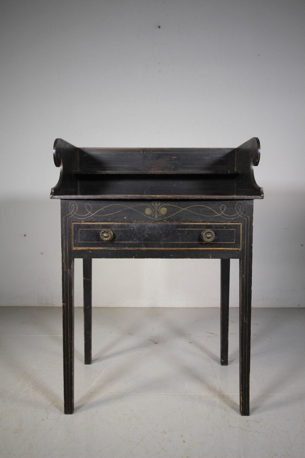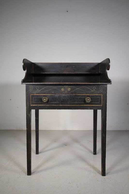 A fabulous, very decortaive English early 19th century origuinal painted pine washstand / side table with a fabulous shaped, gallery back and unusually, a working drawer to the front that has the original brass handles. In superb condition and with all the original lovely hand painted decorations intact. A rare survivor and a more unusual model with having the hole for a wash bowl and a working drawer beneath, usually the drawers are dummy. Lovely proportions, would be nice to find a bowl to fit, or easily could have the hole filled in. English and dating to 1815.