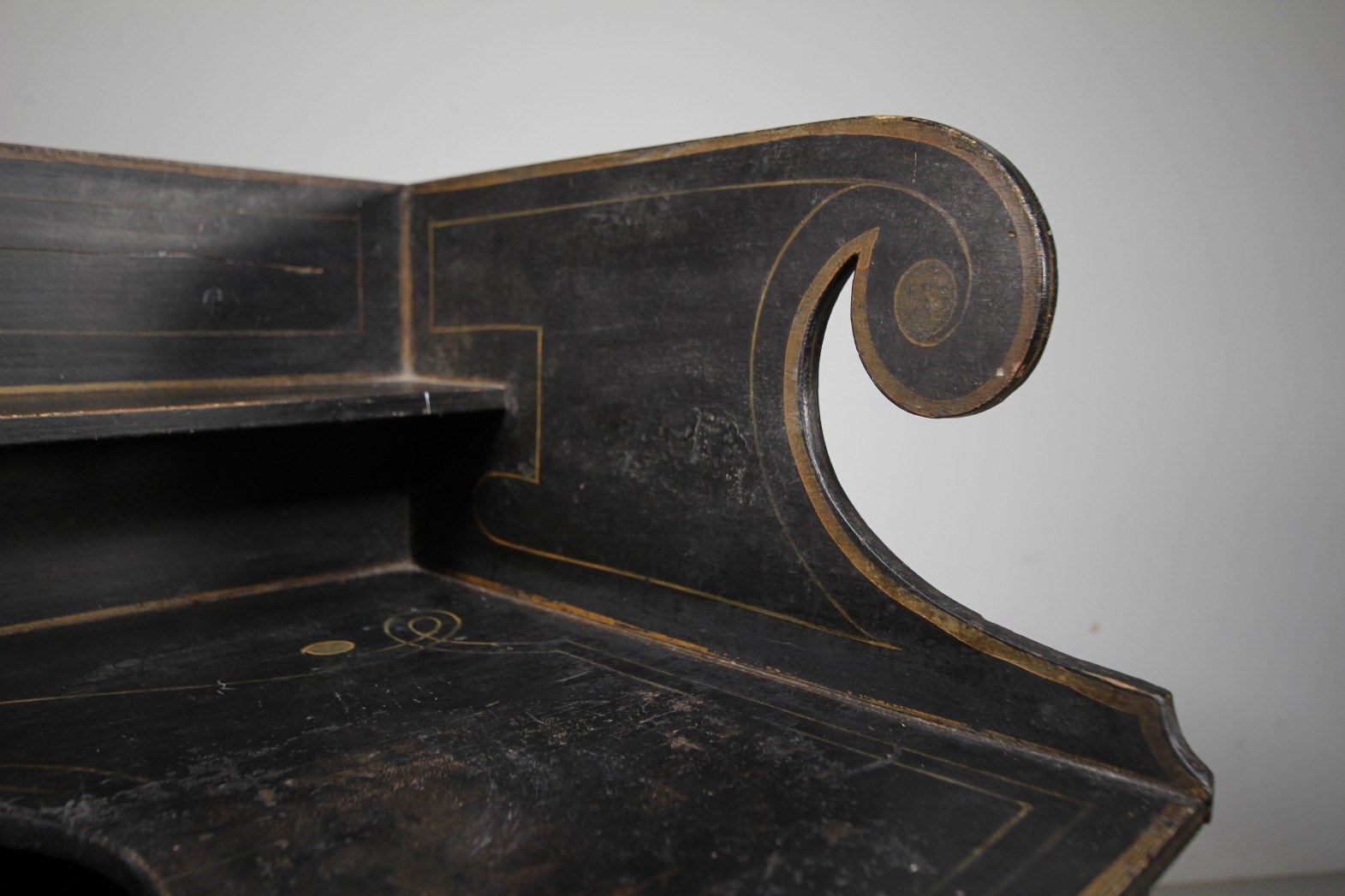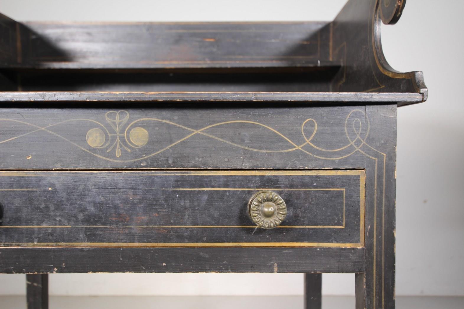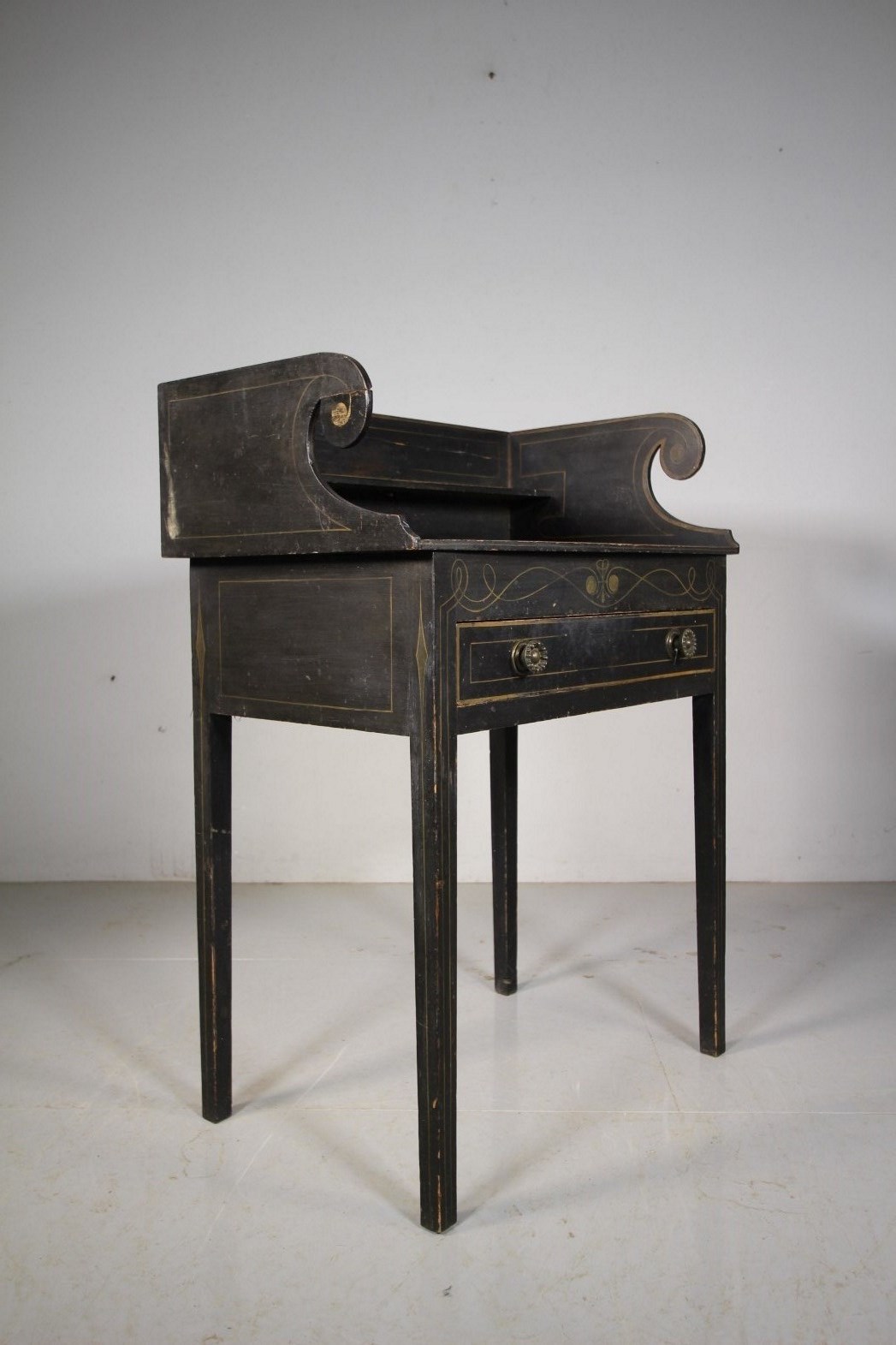 A fabulous, very decortaive English early 19th century origuinal painted pine washstand / side table with a fabulous shaped, gallery back and unusually, a working drawer to the front that has the original brass handles. In superb condition and with all the original lovely hand painted decorations intact. A rare survivor and a more unusual model with having the hole for a wash bowl and a working drawer beneath, usually the drawers are dummy. Lovely proportions, would be nice to find a bowl to fit, or easily could have the hole filled in. English and dating to 1815.