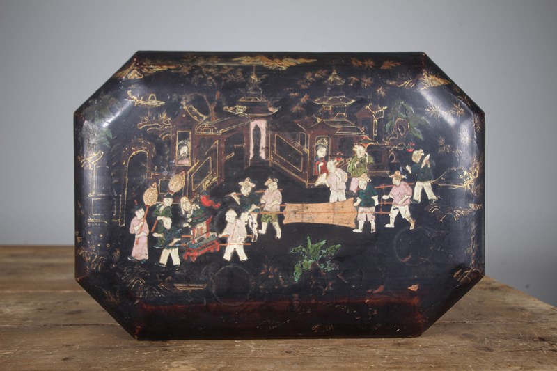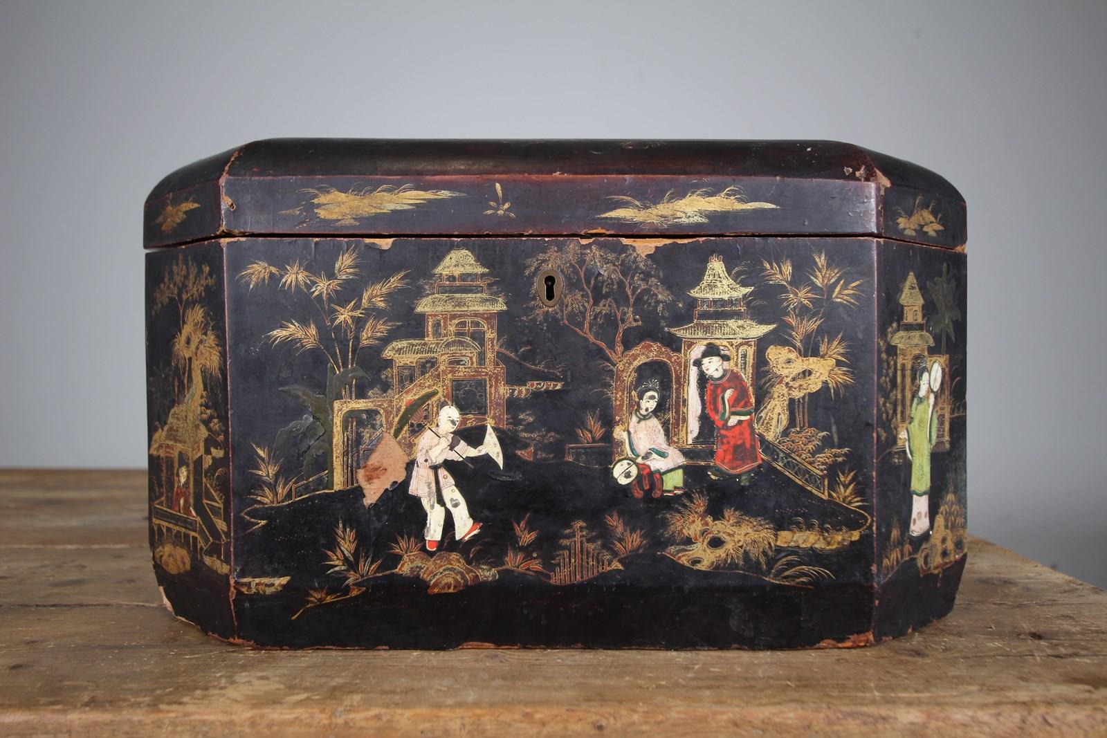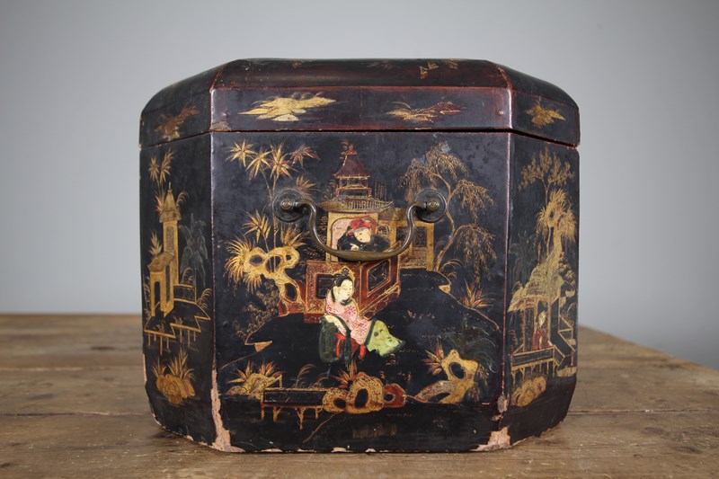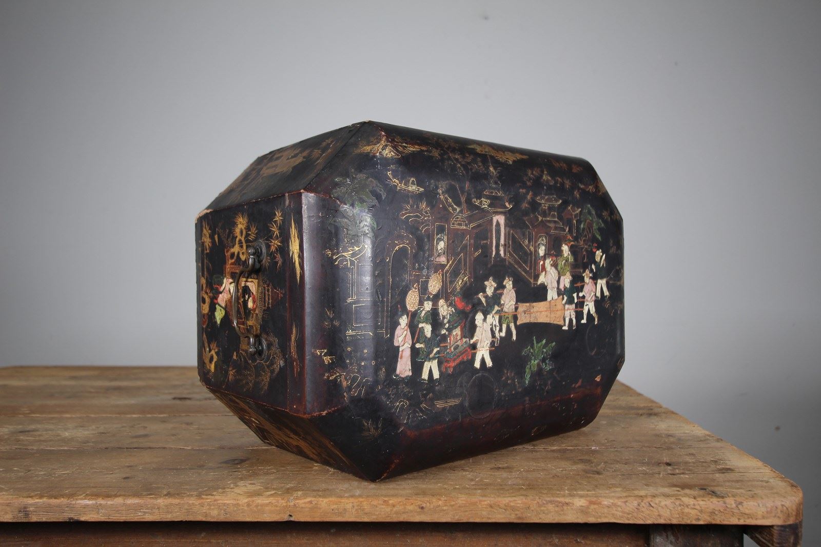 A beautiful Chinoiserie hand decorated and painted large octagonal in shape Chinese 18th century antique box. Lovely quality and with carry handles to each side. The shaped and decorated lid hinges up well to show an open storage space within. The original Chinese decorations are on all sides and are in excellent condition, as is the Georgian original lacquered box. A good larger size, so perfect for storing pieces inside. Dates to around 1750.