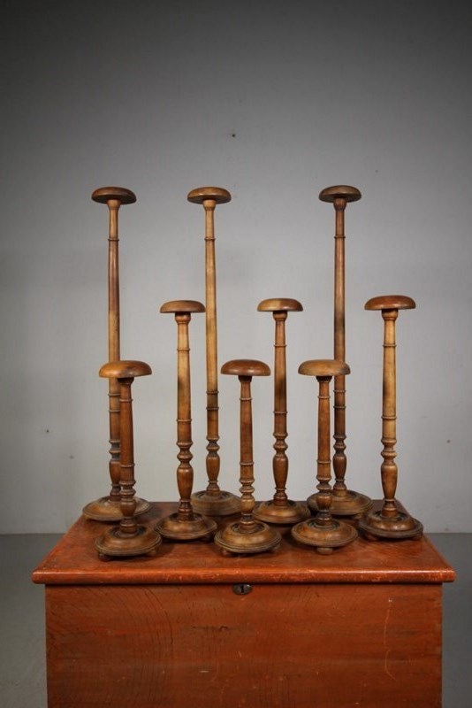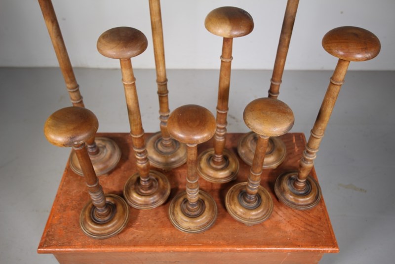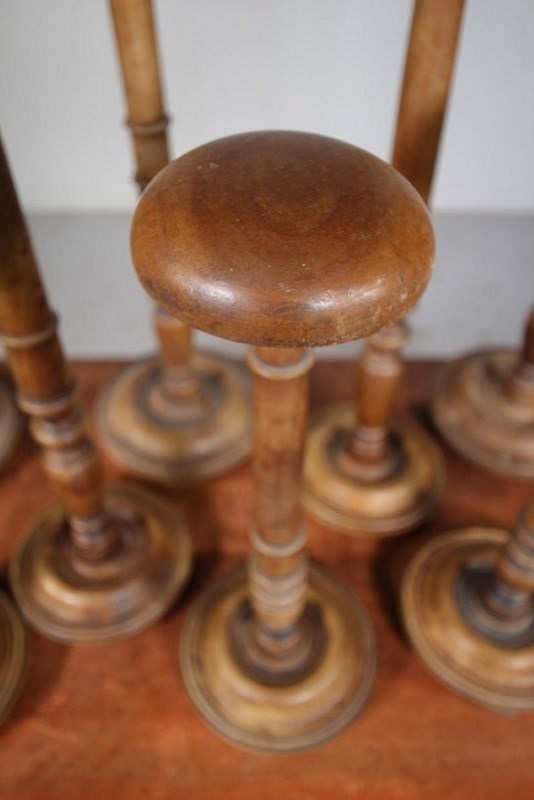 A lovely long collection of nine, 19th century antique hat / display stands that are beautifully turned in solid fruit woods. There are three sizes, the tallest being 82cm high, the the middle three, 54cm high and then the lowest three being 41cm high. All nine have well turned stems and finish on circular moulded bases. The tops are nicely domed and all nine are a superb, original colour. Each antique hat stand is in excellent condition, a rare find!