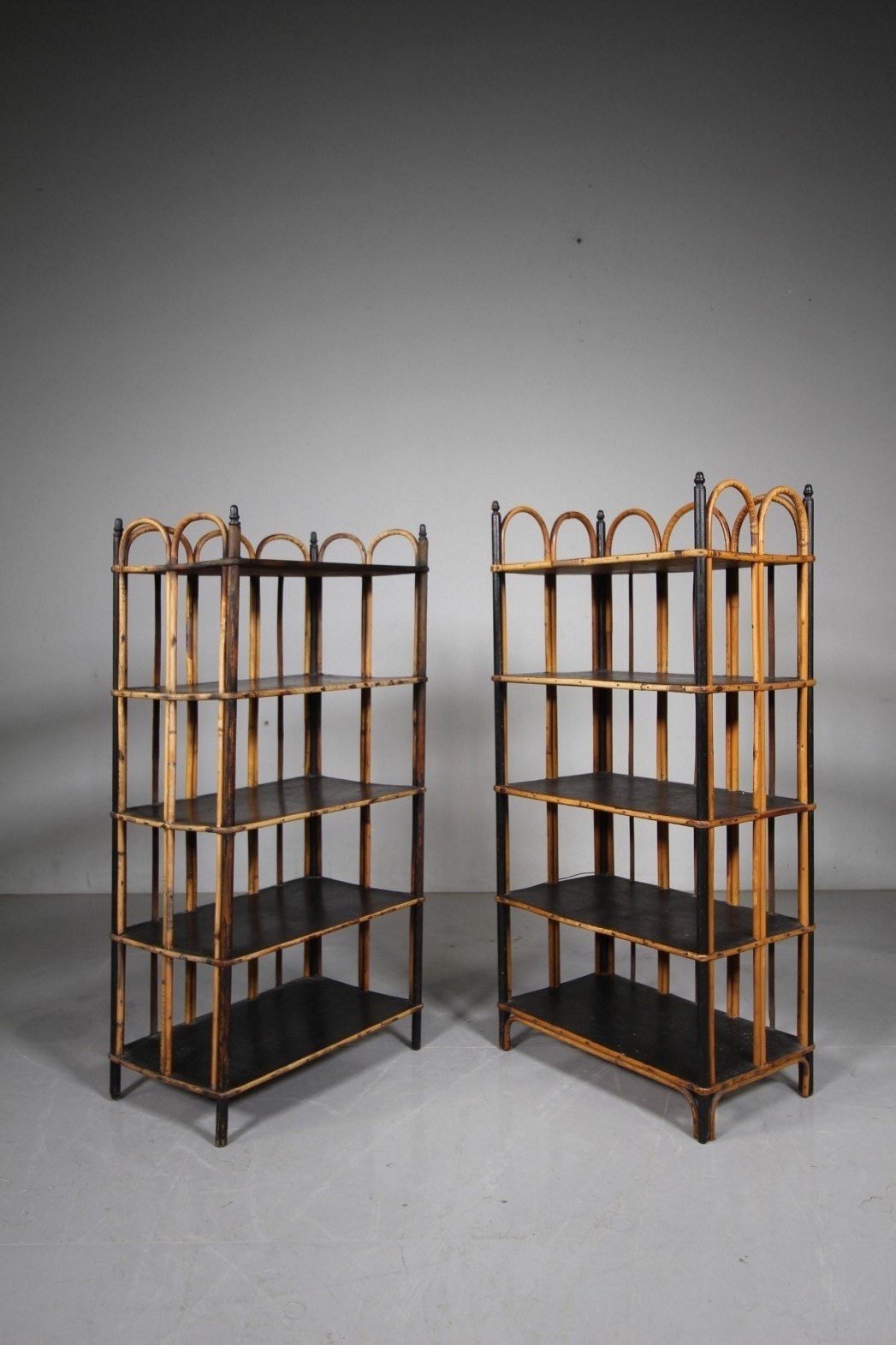 A lovely set of antique bamboo and pine lacquered shelves, often called slipper shelves. We have two available, a very close pair, only difference is the height, 96cm and 94cm. In excellent clean condition with no damage at all, they date to around 1915.