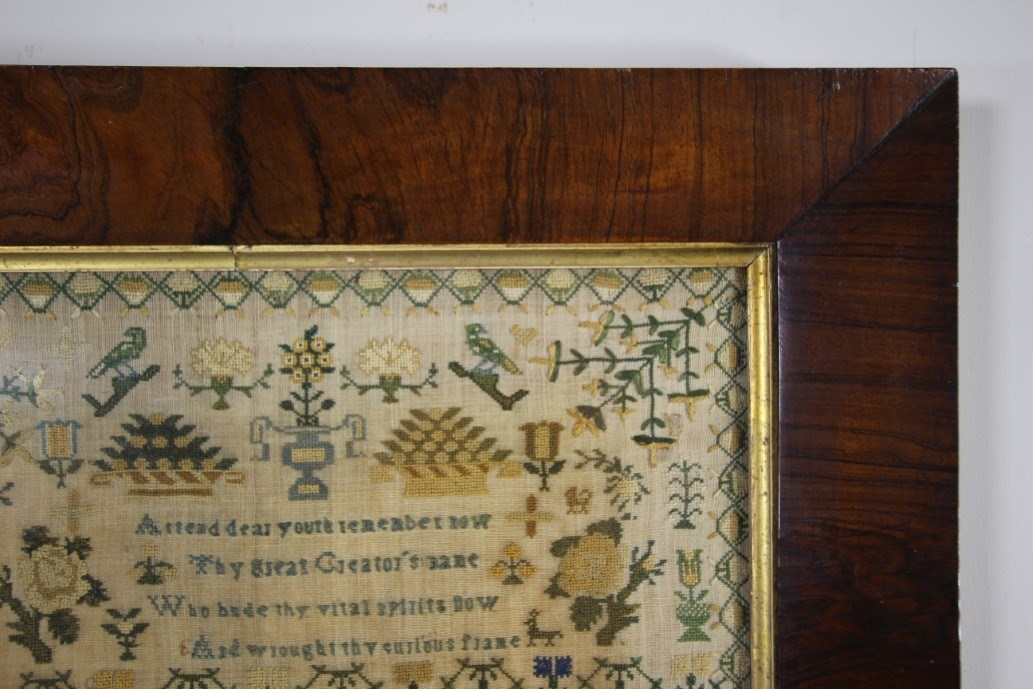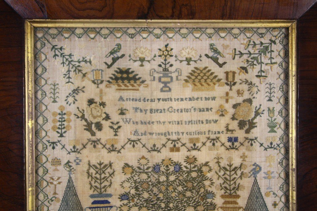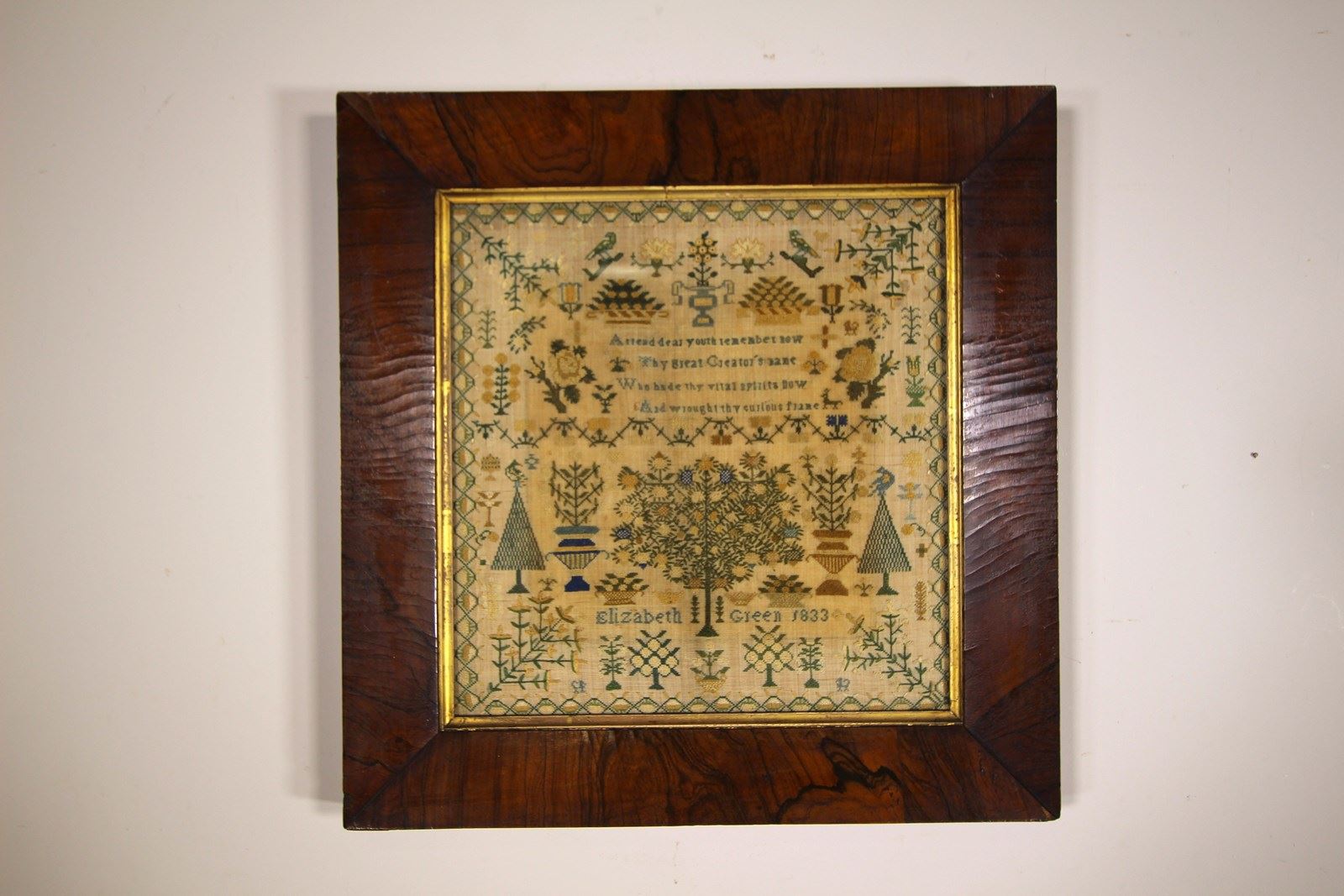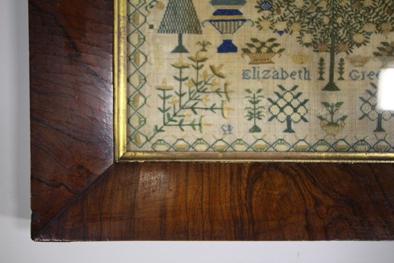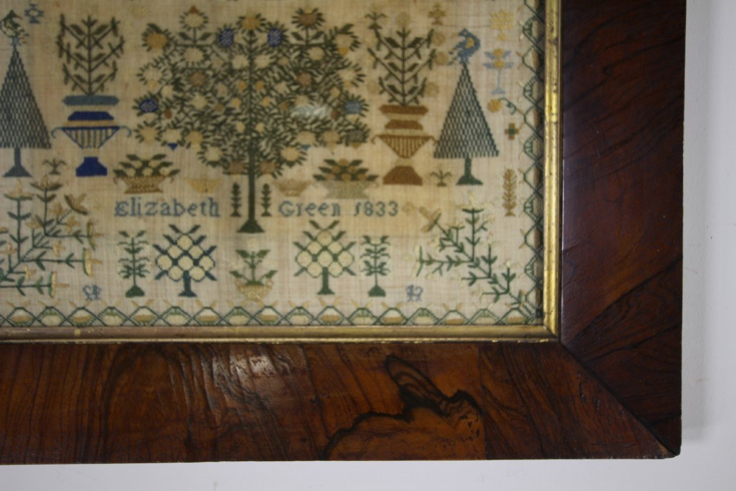 A beautifully worked, English antique fine needlework sampler that is in super condition with no holes or damage. The colours are still bright and the lovely English country garden scene includes topiary trees, flowers and foliage along with planted garden urns and birds. Dated 1833 by Elizabeth Green, mounted in the original antique rosewood frame with the original gilt inner slip. A lovely, non- Religious example.