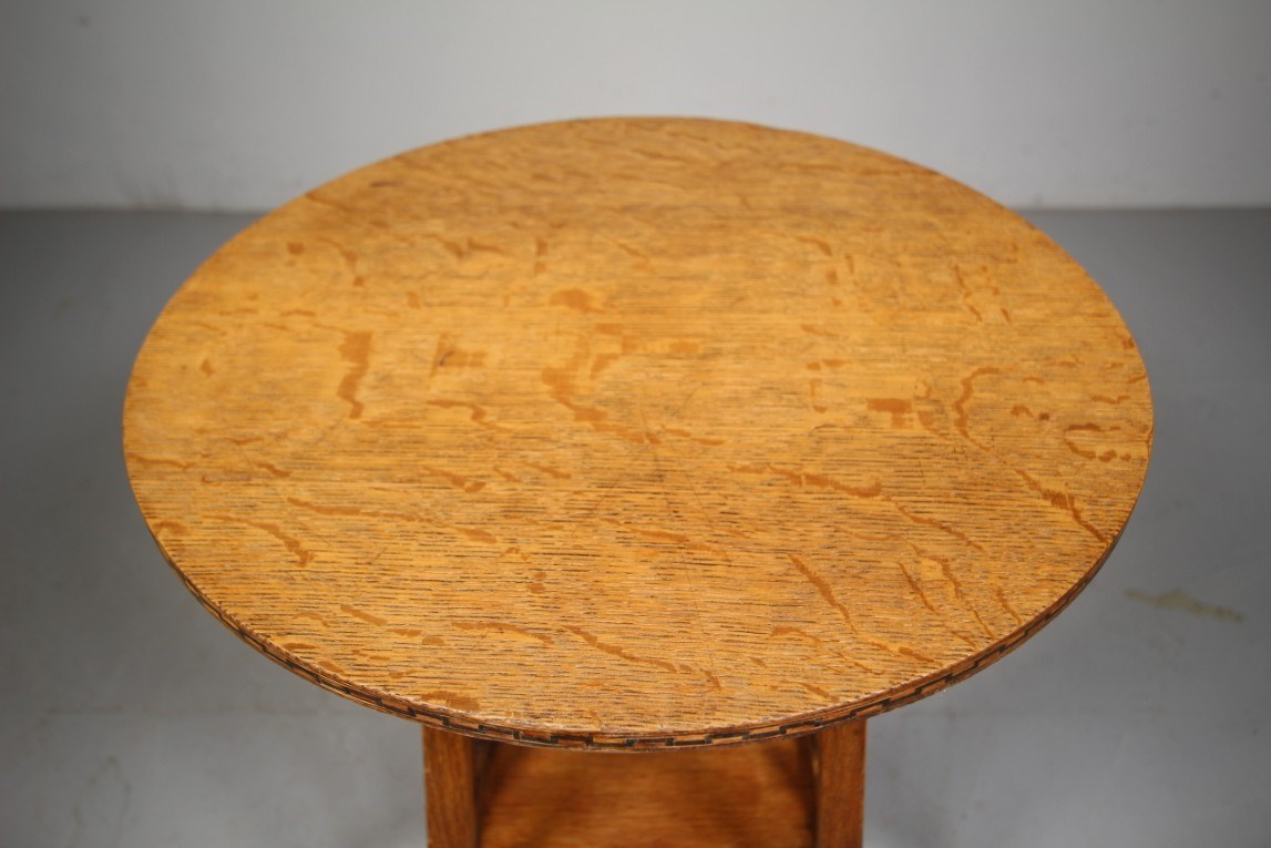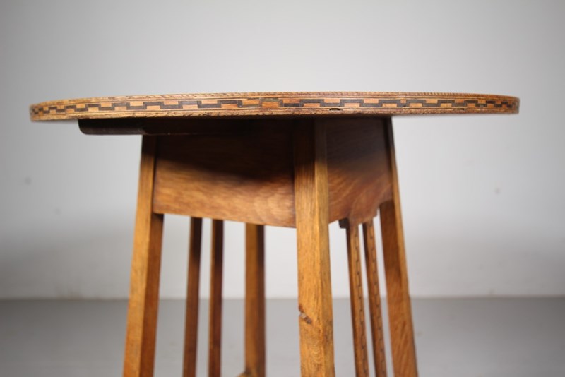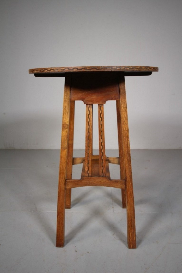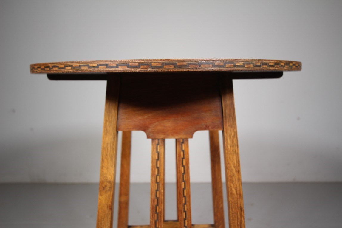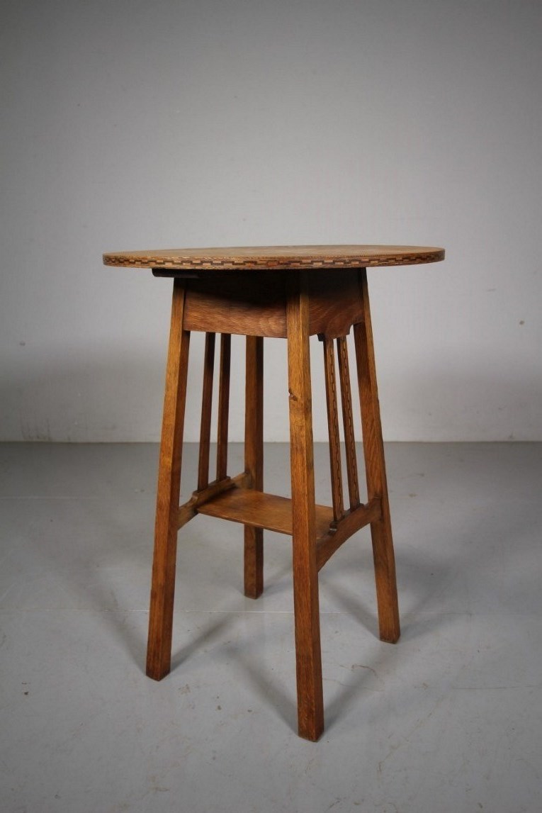 Early Heals Antique Oak Chequer Inlay Side Table This is a fabulous, early Heals antique oak side table, a design by Ambrose Heal himself. It has been many years since we have had one of these Heals side tables into stock. They are so useful as side tables by armchairs and sofas. The round oak table top has a lovely chequer inlay around the edge with four, reverse taping legs that are joined by a flat stretcher. To two sides are twin oak slats with the matching decorative chequer inlays. A super example in very good condition. Dates to around 1900. DimensionsHeight: 70cm (27.78")Width: 51cm (20.24")Depth: 51cm (20.24")