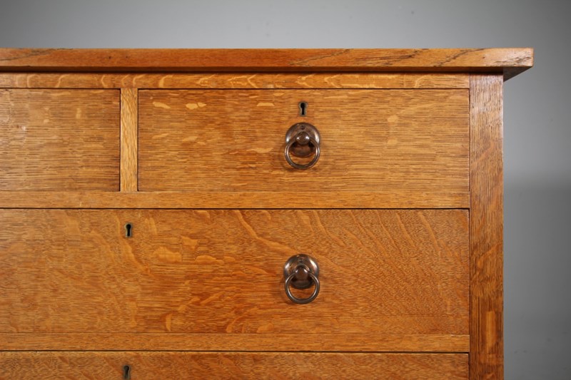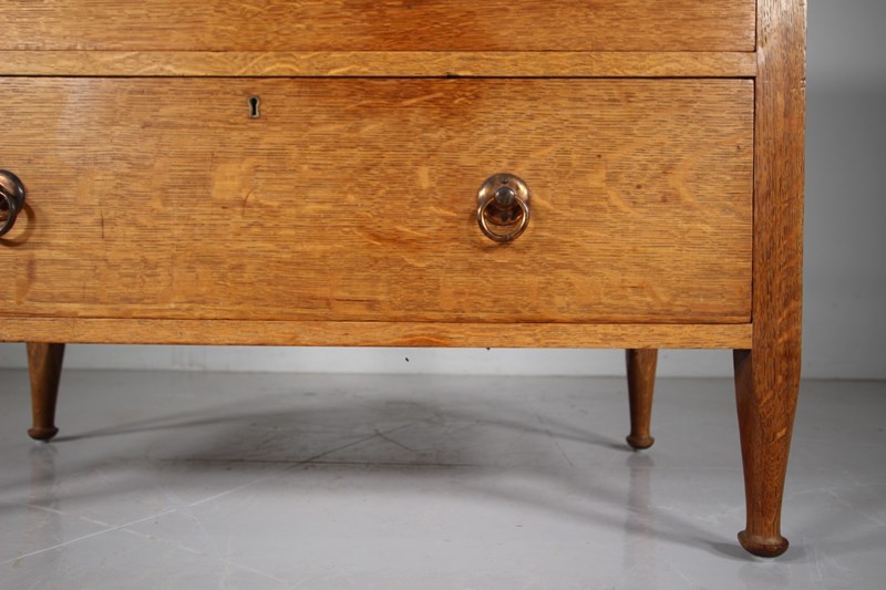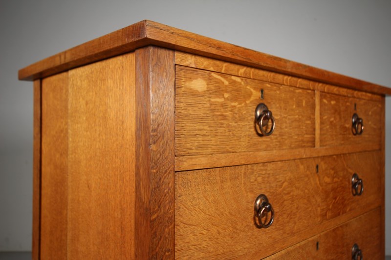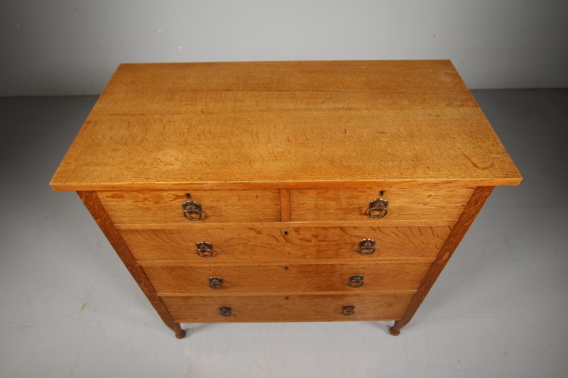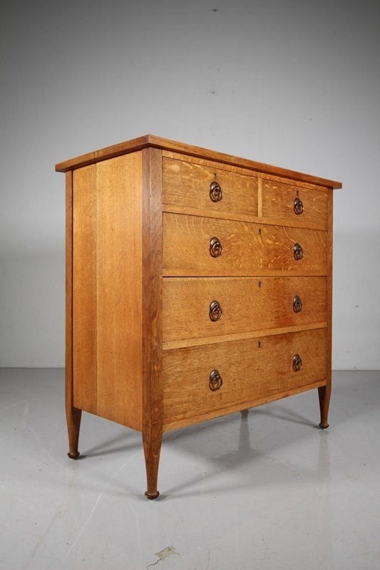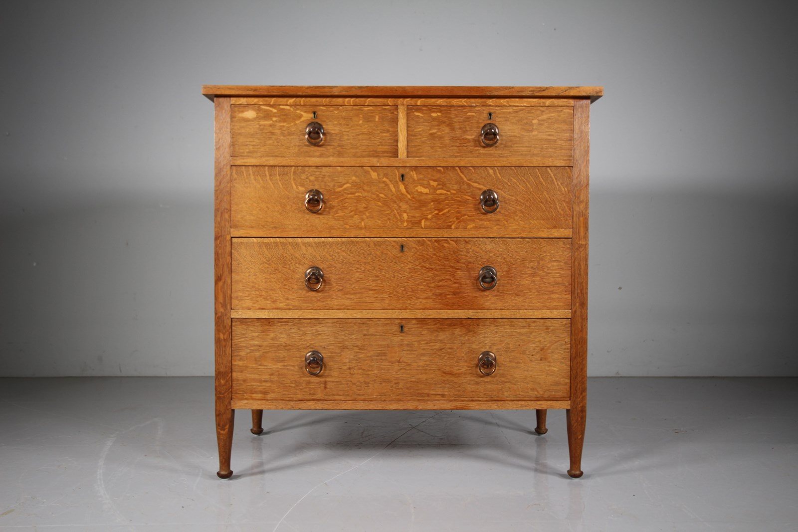 A very good quality solid antique oak chest of drawers, an early Ambrose Heal design, part of the St.Ives range around 1900. A lovely clean and original example that has two short drawers over three long and graduating drawers, all are cedar wood lined, run smoothly and have the original copper ring handles. An ample model that stands on chamfered legs that finish on pad feet. Quite a rare Heals model.