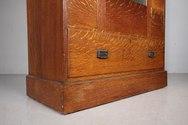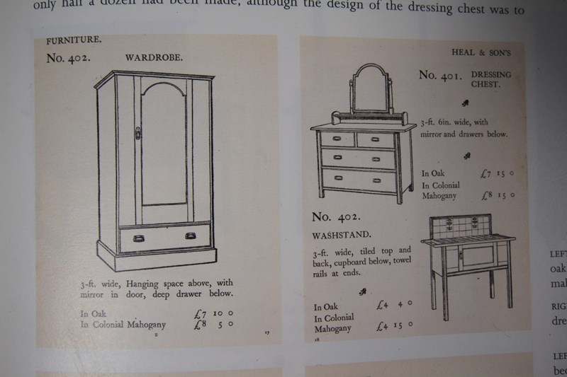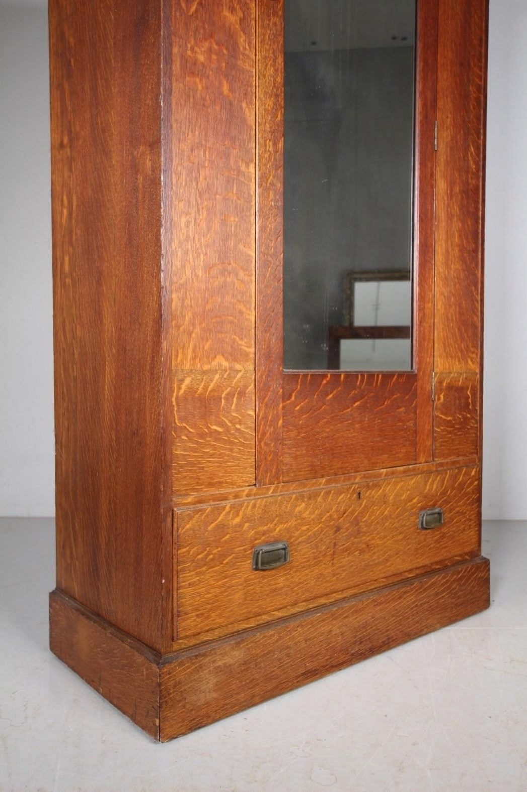 A super quality, solid oak wardrobe by Heals of London around 1900. An early model, only a handful of these were ever made, this Heals wardrobe model is listed in the original Heals catalogues, please see the images, and this piece is also stamped by the maker. In excellent, clean and very honest condition, made is quarter sawn oak that has a wonderful grain and the wardrobe is the original colour / finish. To the top is a simple moulded cornice with a shaped full length mirror door beneath, ideal for dressing. To the bottom is a deep long storage drawer that runs smoothly and is clean inside. Complete with all the original handles and the locks which are stamped by Heals. Inside are the original brass hanging hooks and a hanging clothes rail, inside the door is also a hanging rail, perfect for smaller items. A lovely example, quite a rare model.