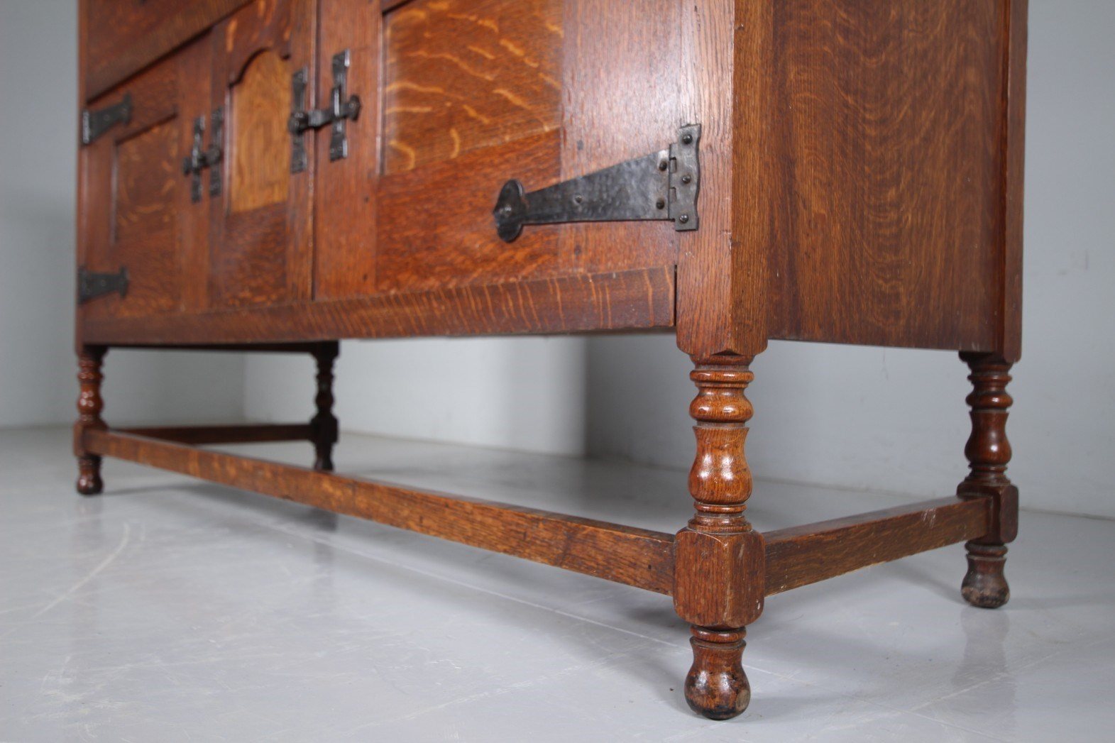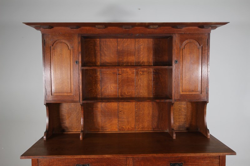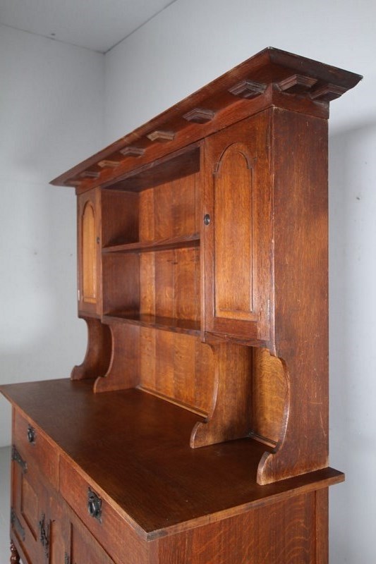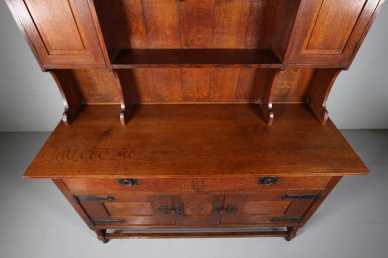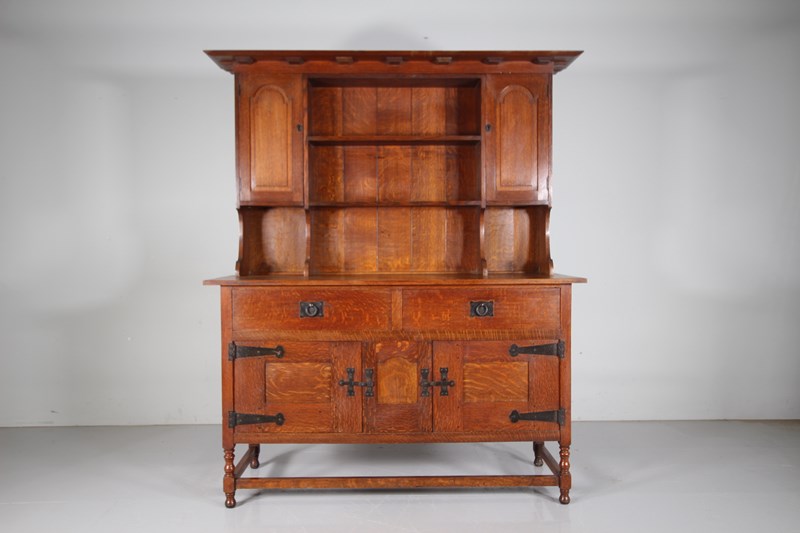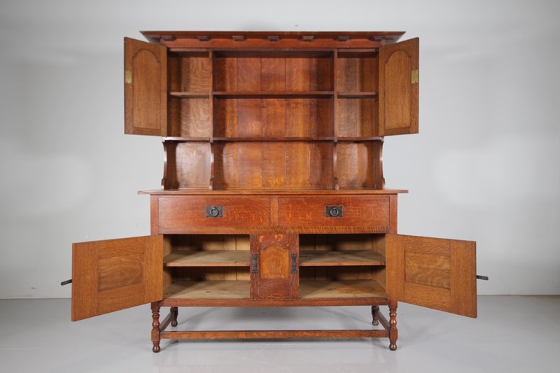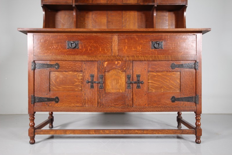 Dating from around 1890, this is an early piece of Heals solid antique oak furniture, a large scale dresser that splits into three sections, the architectural lift off cornice, the open rack with panelled door cupboards to each side, and then the dresser base that stands on a stretchered base with turned legs and having two drawers over two cupboards. In superb condition throughout, stamped twice with the makers label and by the maker into a drawer. Complete with all the original iron work and all a very good original colour. Only a handful of these dressers where ever made, this is one of Ambrose Heals earliest designs.