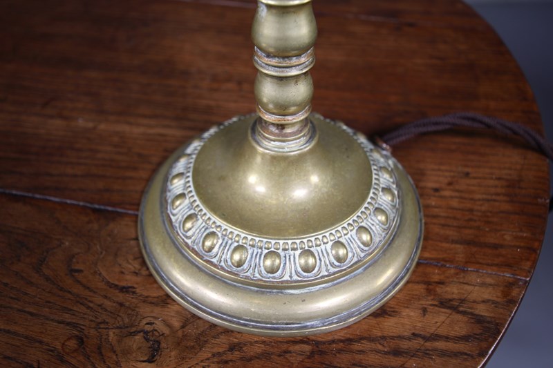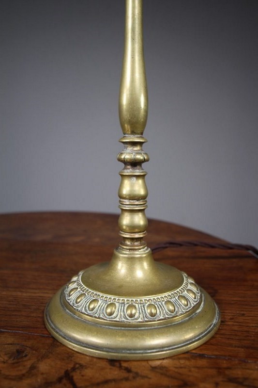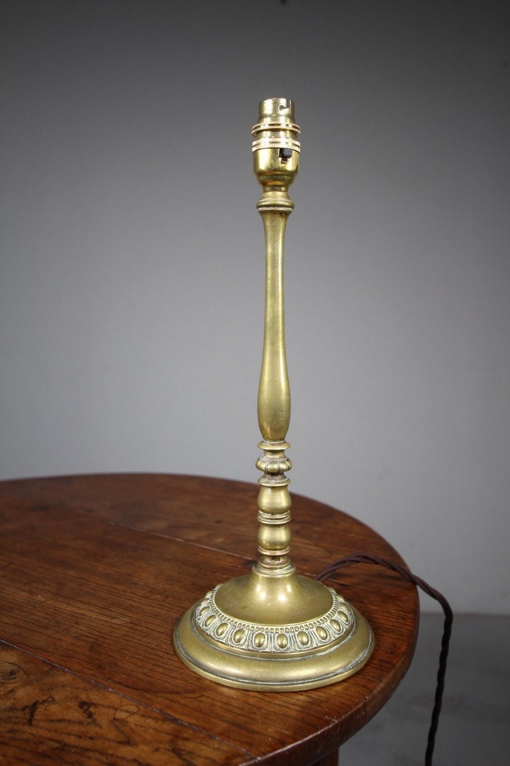 A lovely quality English antique table lamp in brass with a turned stem and a decorative circular base. Stands firmly, in excellent condition and newly rewired with braided flex and tested. Dates to 1910.