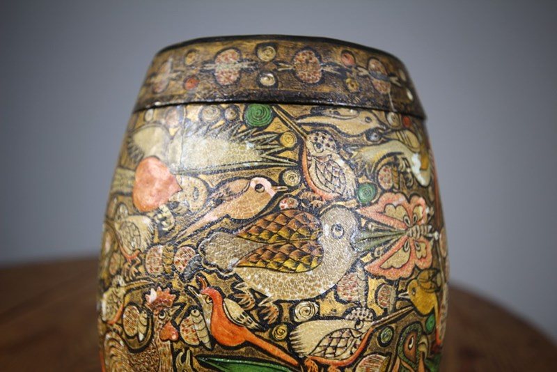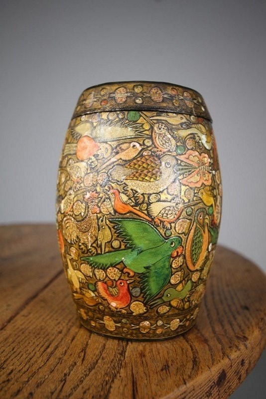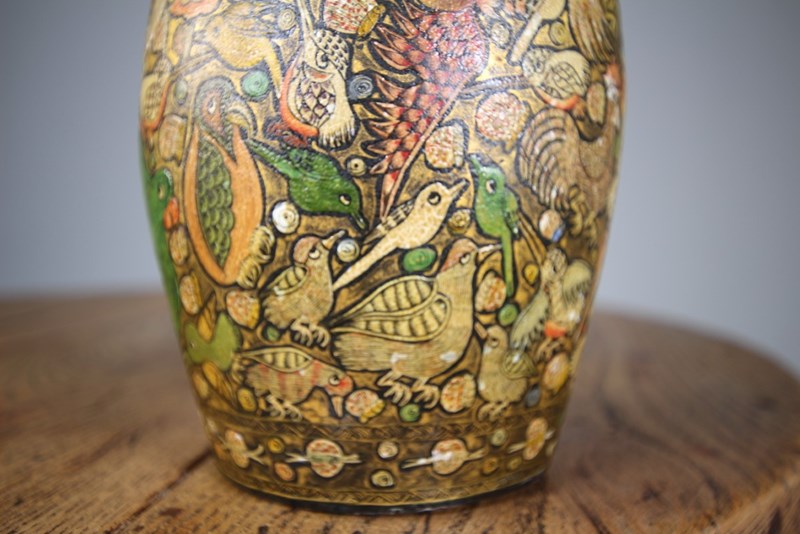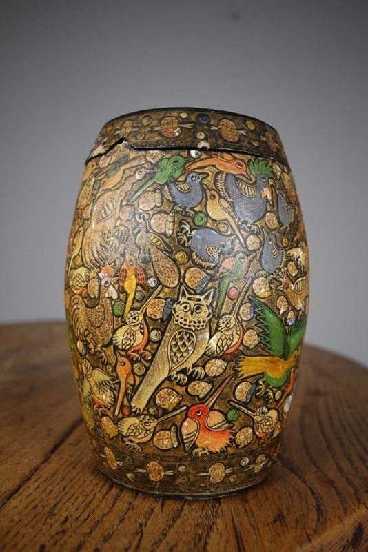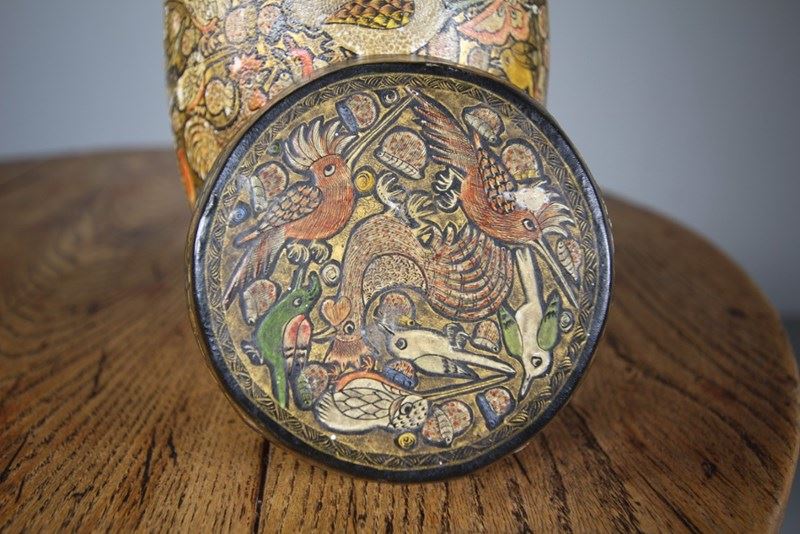 This early 20th century antique lidded Kashmiri jar is so wonderfully decorated with masses of beautiful birds and insects. Very, very detailed and in superb condition. A very lovely piece of decorative Kashmiri work. Spot the Owl! Dates to around 1910.