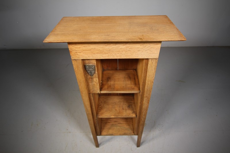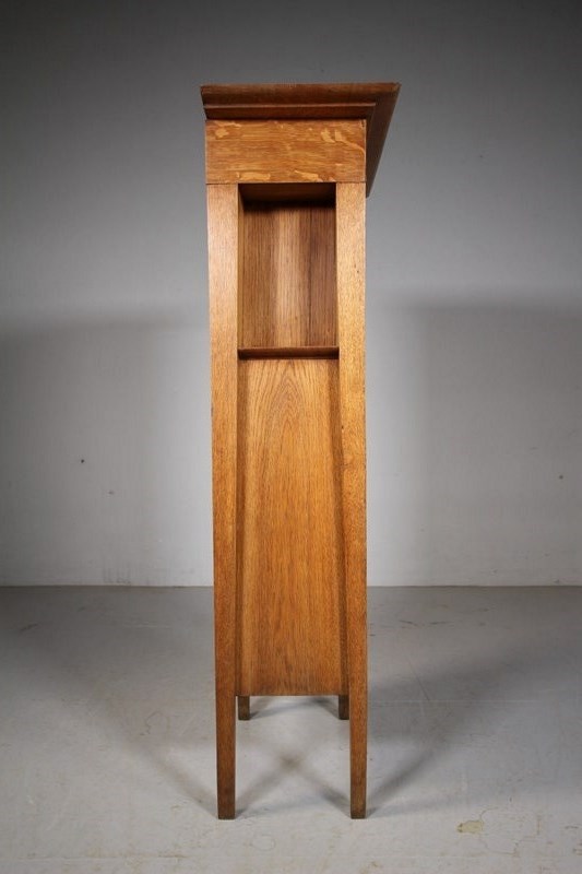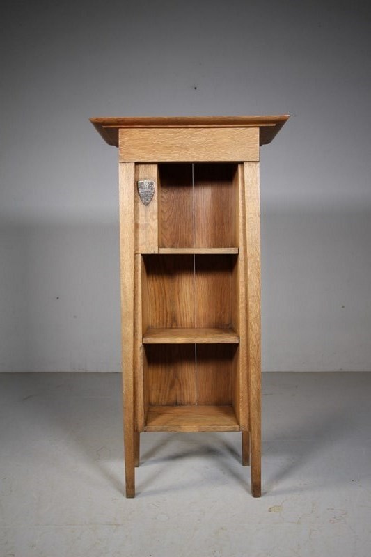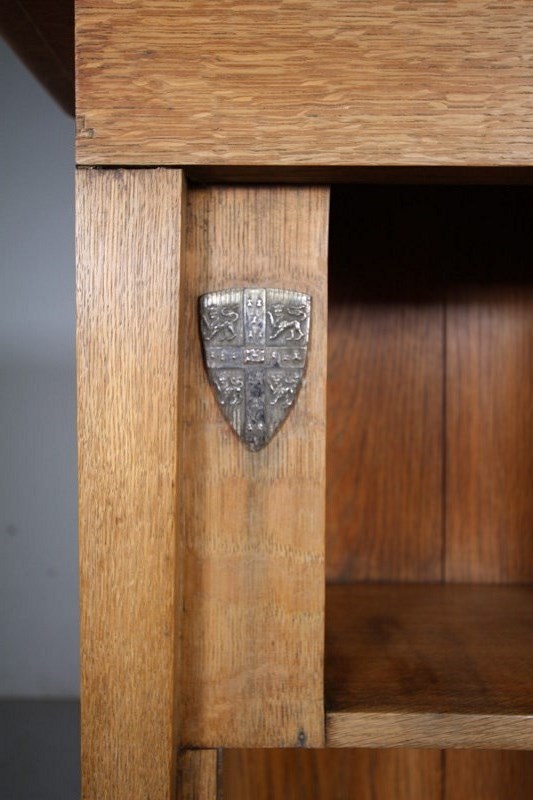 A good quality solid English antique oak open bookcase from Cambridge University around 1900-10. A tall antique open bookcase that has a wide flat top with a small open bookcase to one side, three fixed oak shelves to the front along with the original metal shield shaped plaque. In excellent, clean and original condition.