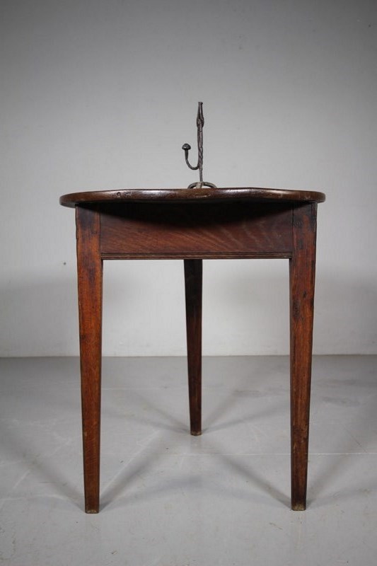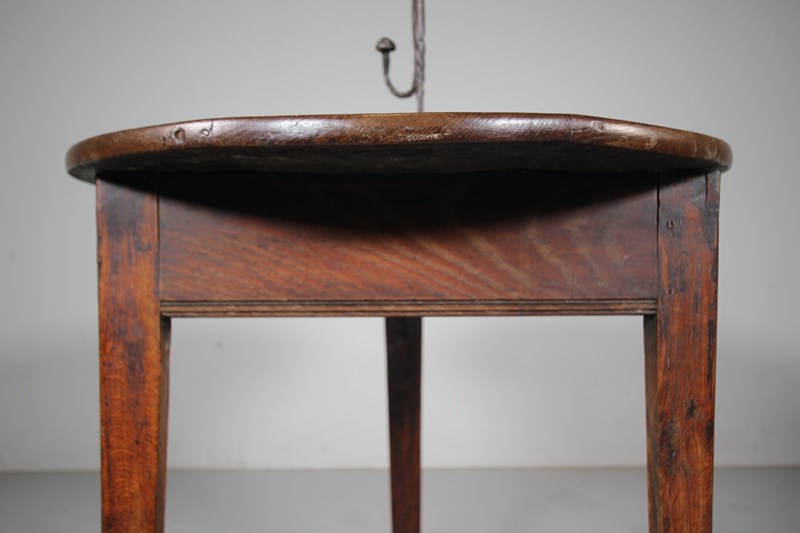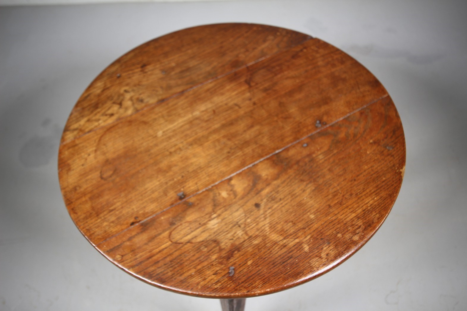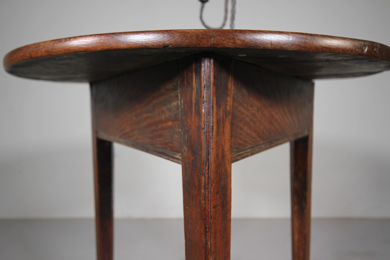 A lovely quality solid English oak Georgian antique cricket table that has a large round table top upon three tapering legs that have a simple moulding to the outer edges that match the moulding line to the bottom of the table friezes. A superb original colour and in excellent solid condition. English and dating to 1780.