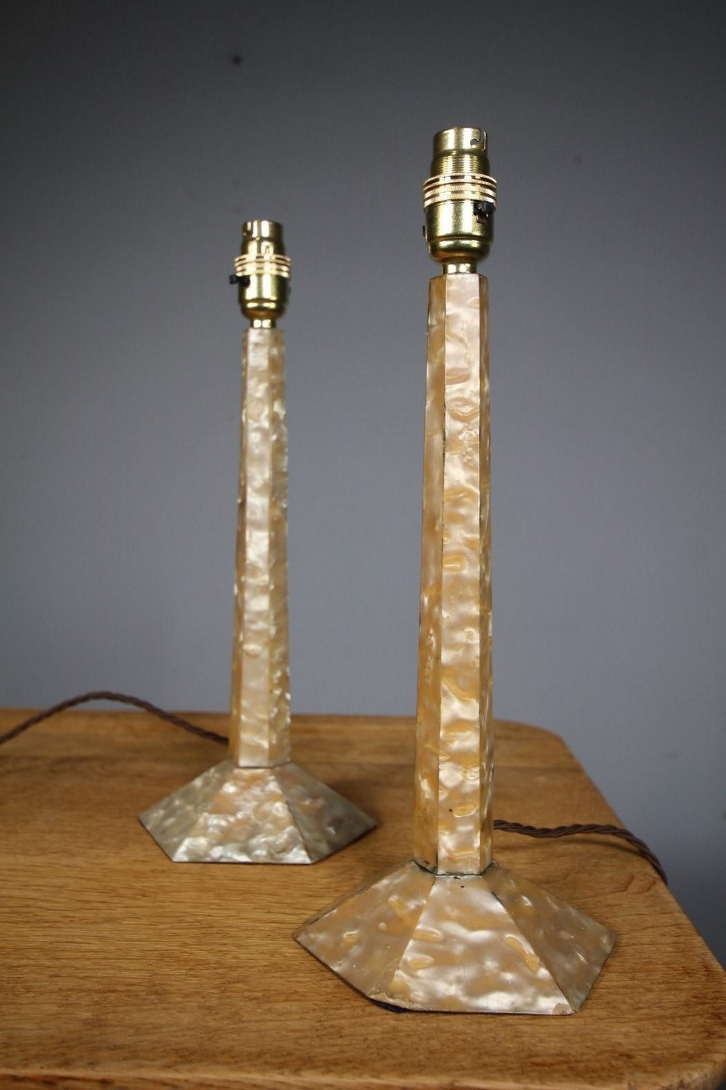 A beautiful pair of English antique table lamps very well made in faux mother of pearl. They are both in very good condition, newly rewired and tested. They each feature tapering hexagonal stems that finish on weighted hexagonal bases. A decorative pair of English antique table lamps. We also have a matching single table lamp.