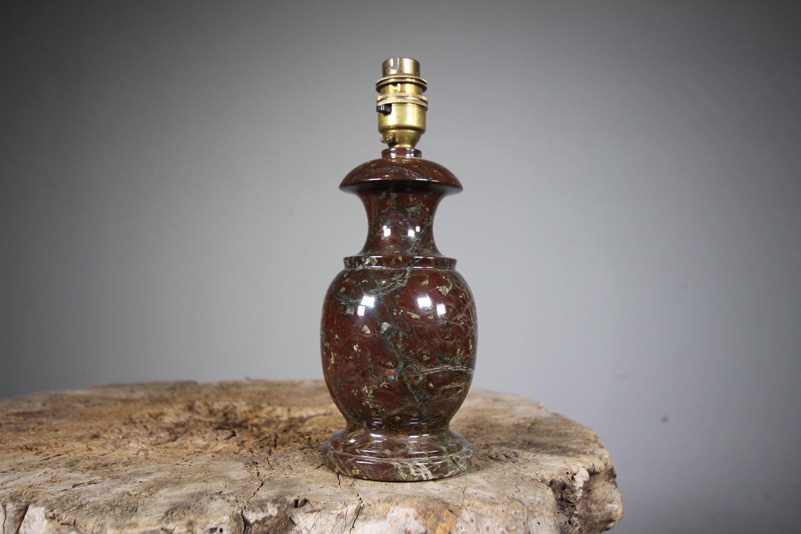 A beautifully shaped, English antique table lamp that is made in solid serpentine marble that has lovely multi – veins, colourations and surface within the red serpentine stone which is quite rare. In excellent condition, looks amazing when lit. Newly rewired and PAT tested. Dates to 1920.