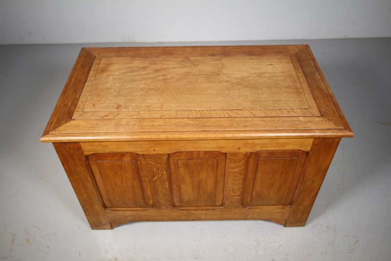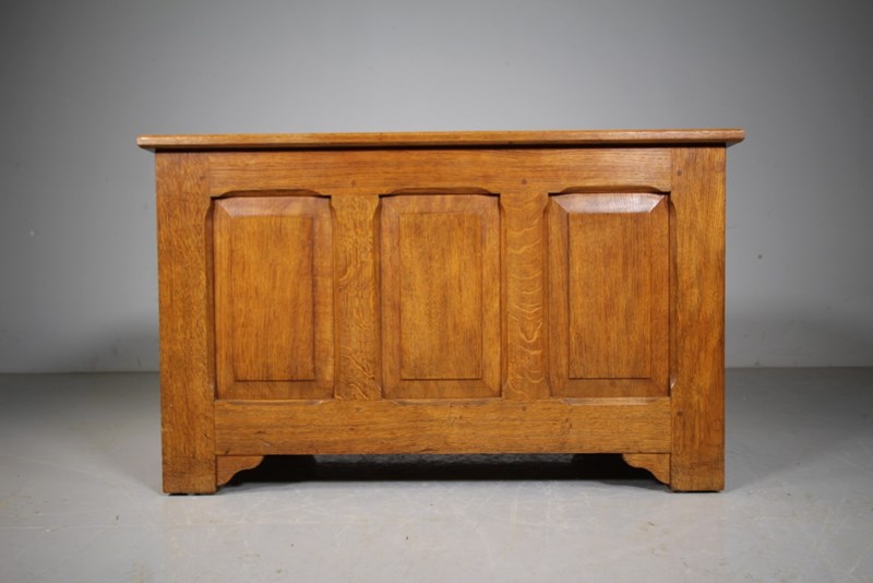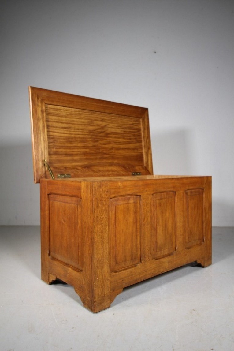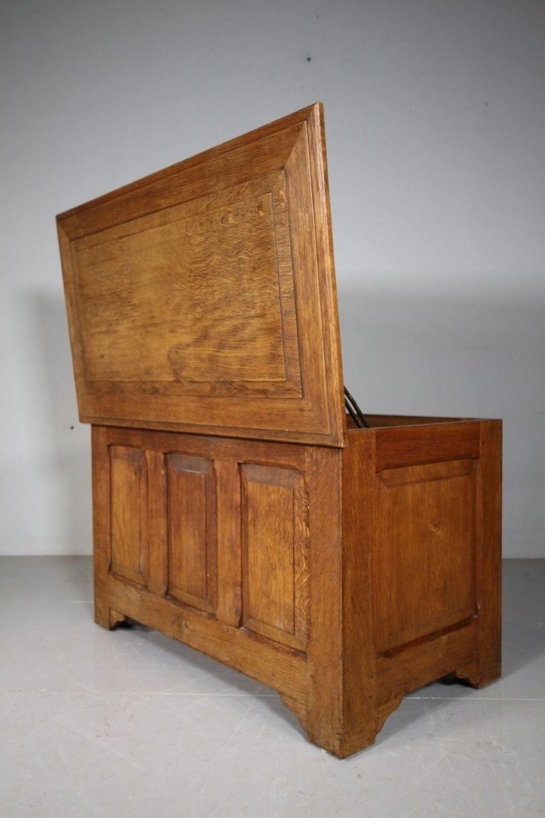 A very good quality, solid English oak blanket box made in the Cotswold School manner in the thirties. Beautifully hand made, designed to be able to be seen from the back too, as it is panelled on the back, sides and front. Stands on stile and bracket feet, in superb condition and a lovely original colour. Would make an ideal coffee table with storage inside, as well as at the end of a bed.