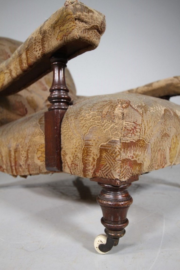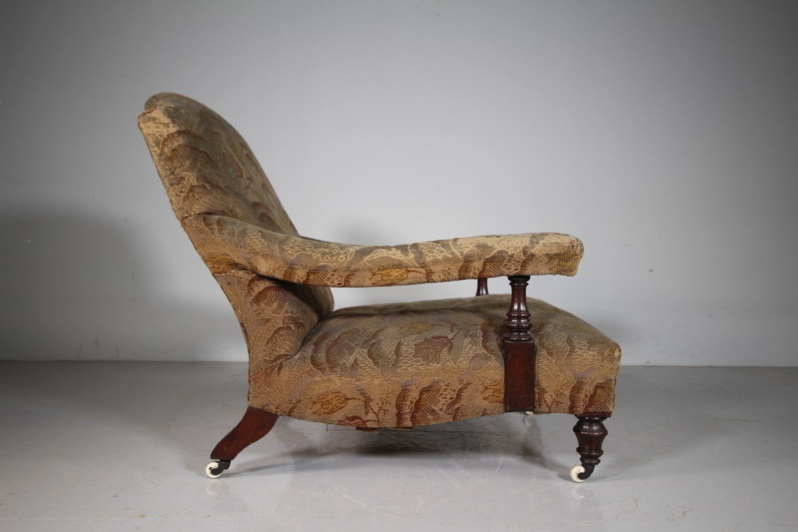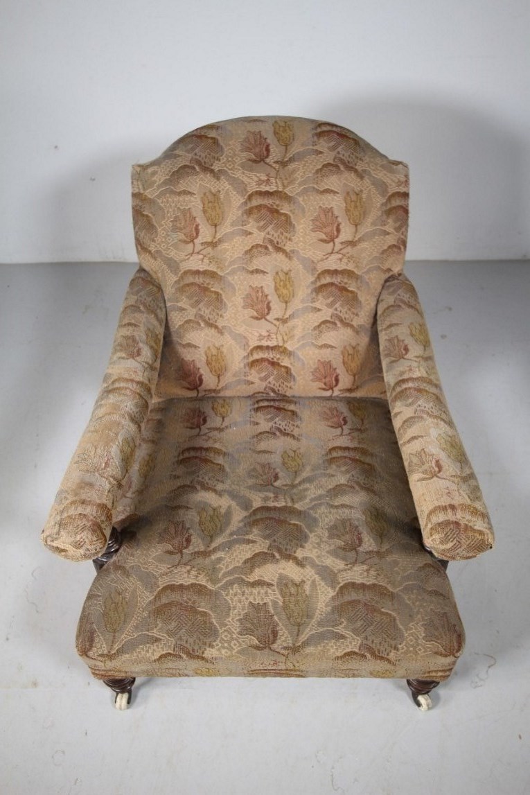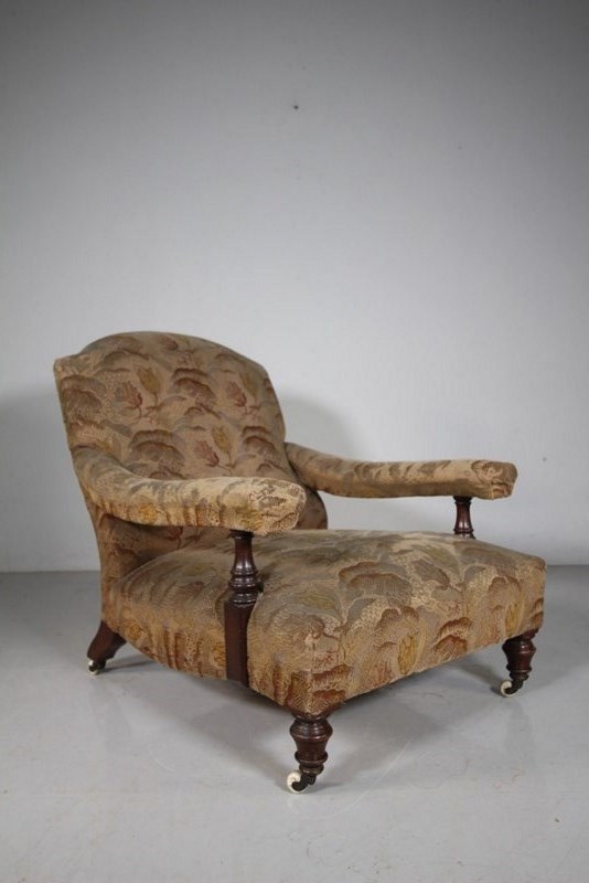 English 19th Century Ample Antique Open Armchair A very shapely, ample and comfortable English high quality antique upholstered armchair. In super condition, traditionally upholstered with all the innards intact and correct. Currently upholstered in a 1920’s lovely fabric which is worn, yet clean. Stands on quality mahogany turned legs to the front with matching arm supports, splayed legs to the back, one is stamped with model numbers. Large portions and comfortable. Dates to around 1870. DimensionsHeight: 84cm (33.33")Width: 77cm (30.56")Depth: 108cm (42.86")