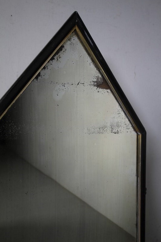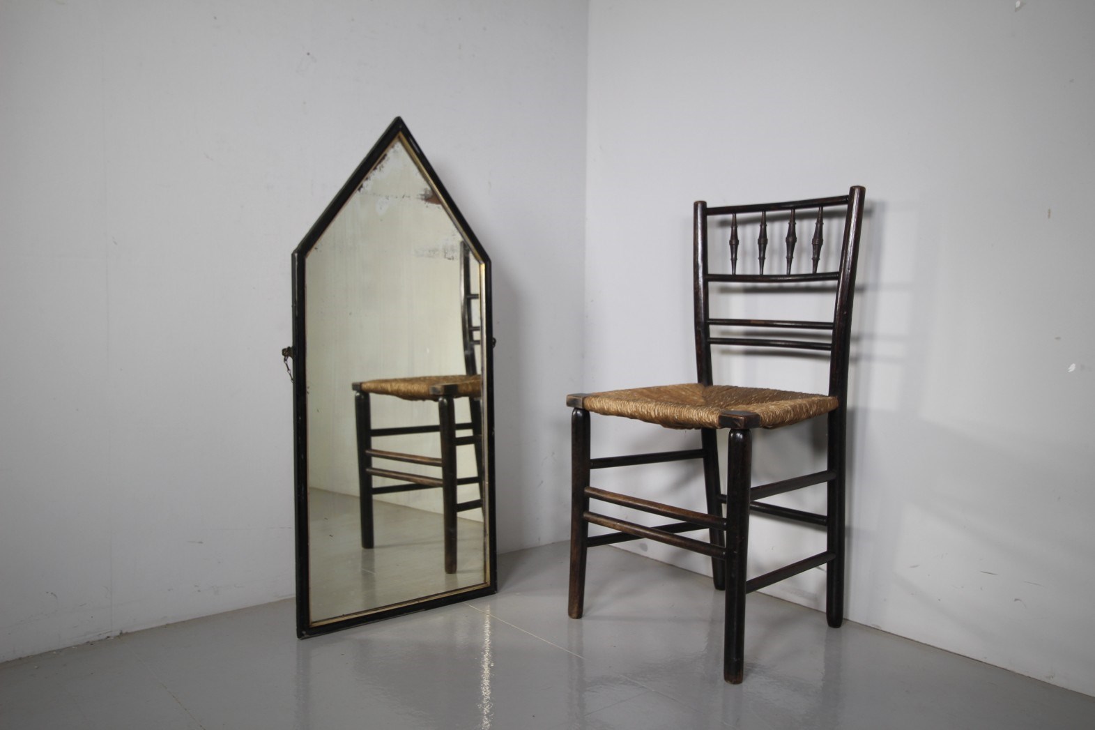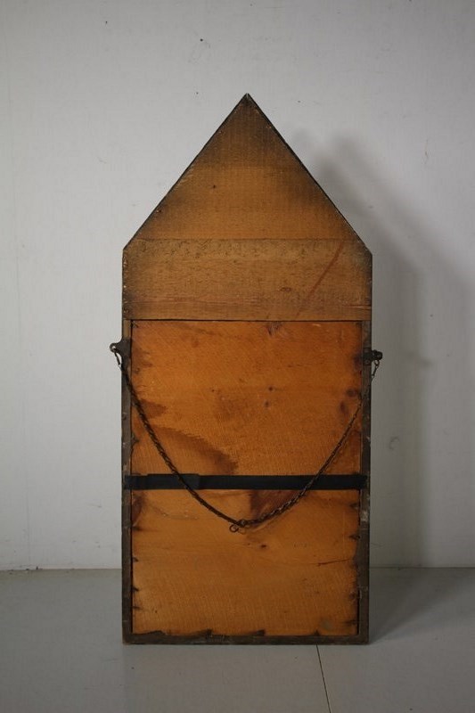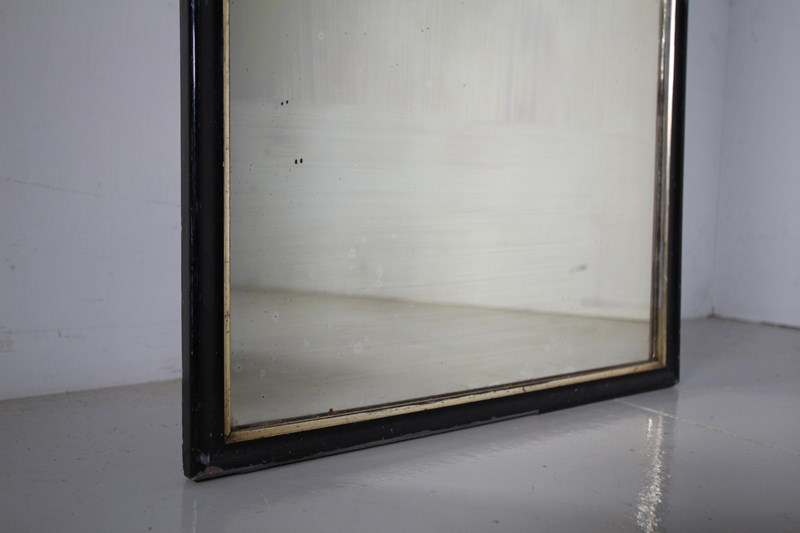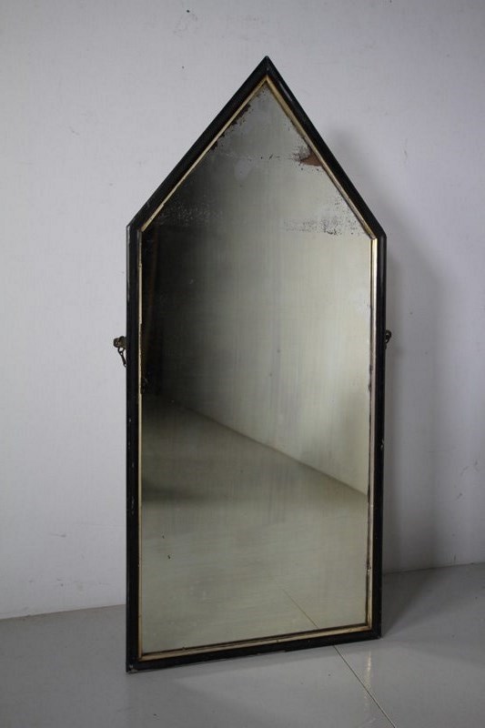 A very original English antique tall pointy wall mirror that dates to around 1850. Featuring a original ebonised mirror frame with a gilt inner slip. In very good condition, original mirror plate and pine backboards along with the original hanging chain.
