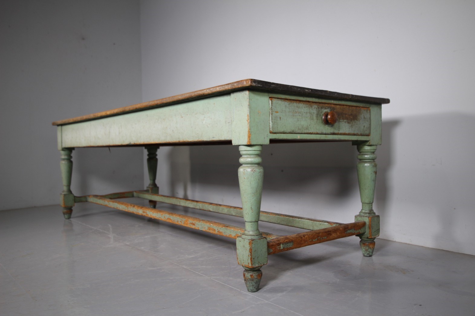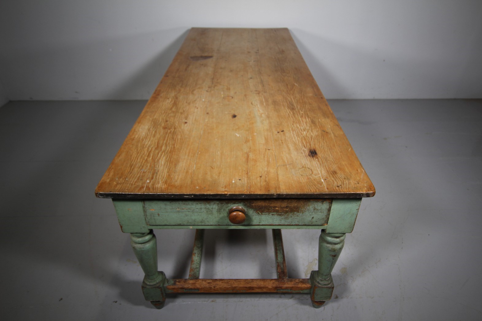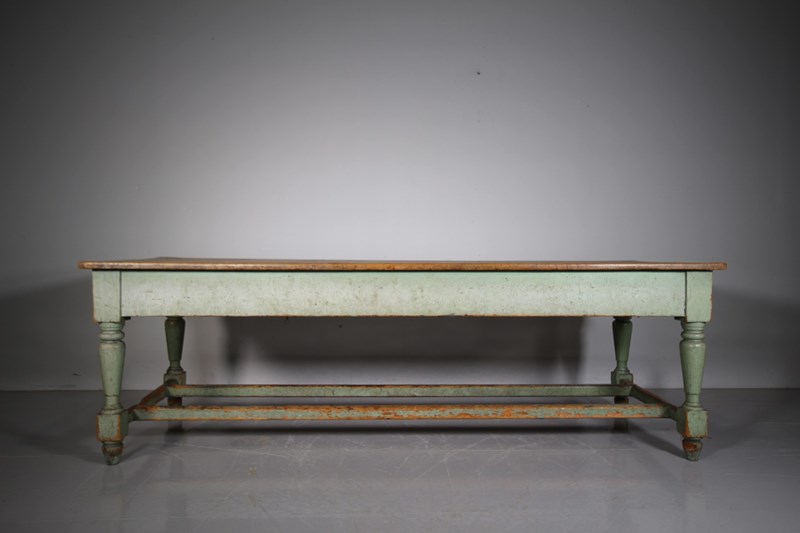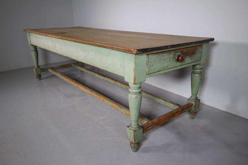 We actually purchased this wonderful large scale original painted pine antique table from the Worcestershire country house kitchen that it was originally made for around 1840, it had been there ever since. It is a fabulous model and still in the lovely original green antique pant finish. Featuring a wide scrubbed pine boarded table top which is all very original and has a historic small iron burn, proving the servants used the table top for ironing too! The turned leg table base has a deep drawer to each end, both have the original knob handles. The sturdy table legs are connected by twin stretchers that have lovely wear to the paint finish by feet over the years. All in superb, solid and totally original condition, a fabulous large scale piece of English original painted pine kitchen furniture.