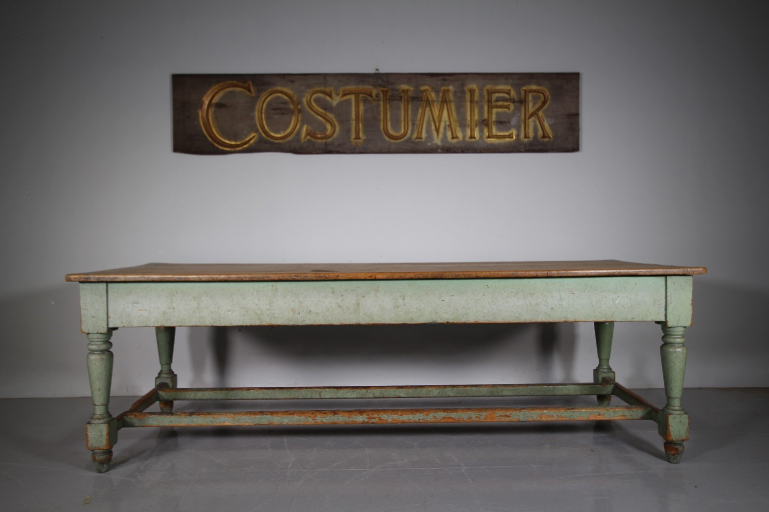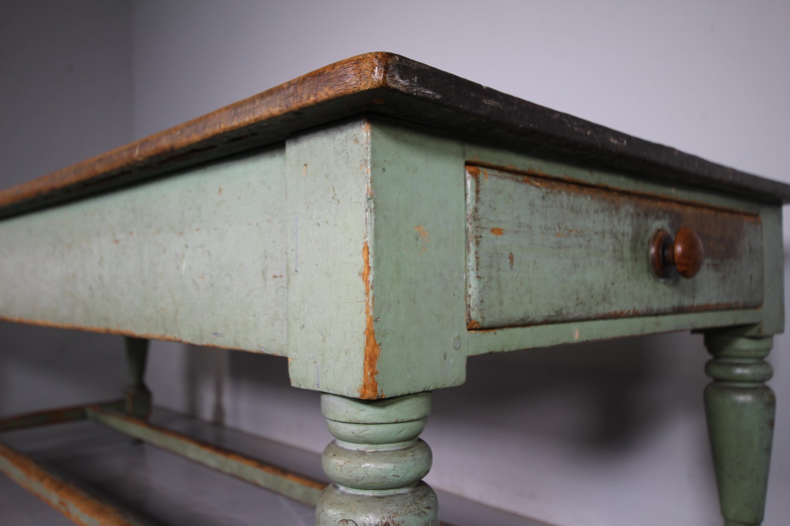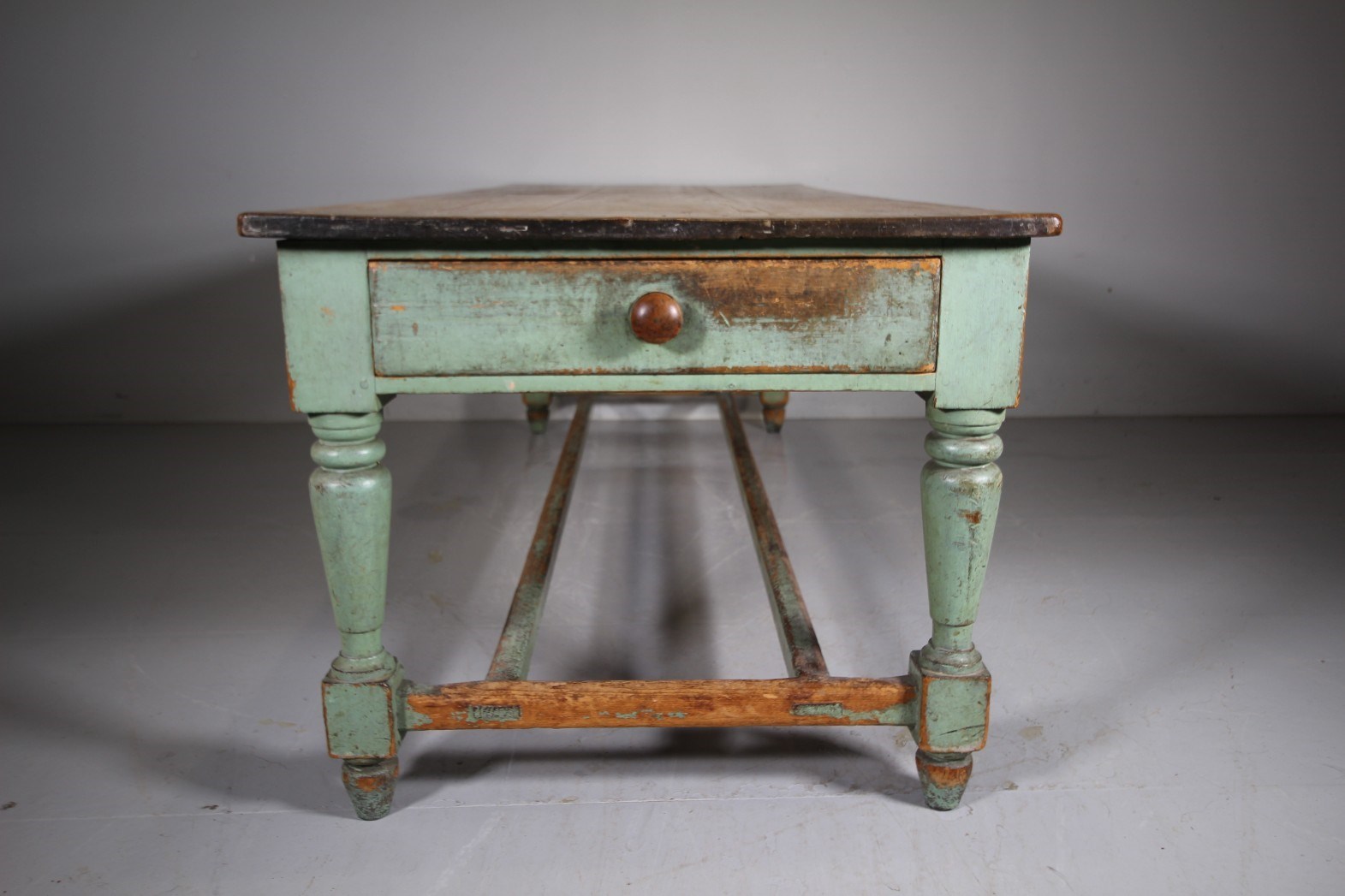 We actually purchased this wonderful large scale original painted pine antique table from the Worcestershire country house kitchen that it was originally made for around 1840, it had been there ever since. It is a fabulous model and still in the lovely original green antique pant finish. Featuring a wide scrubbed pine boarded table top which is all very original and has a historic small iron burn, proving the servants used the table top for ironing too! The turned leg table base has a deep drawer to each end, both have the original knob handles. The sturdy table legs are connected by twin stretchers that have lovely wear to the paint finish by feet over the years. All in superb, solid and totally original condition, a fabulous large scale piece of English original painted pine kitchen furniture.