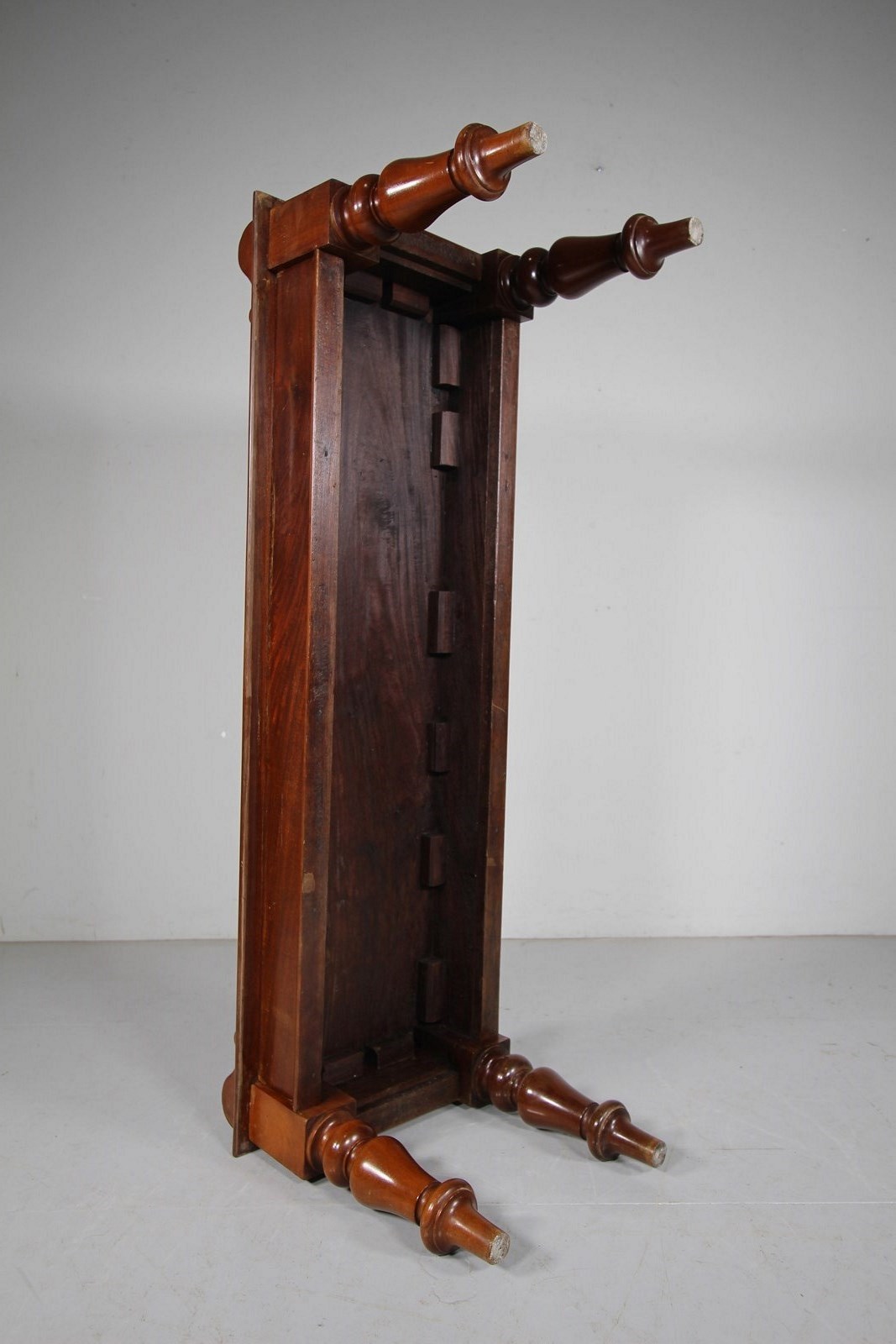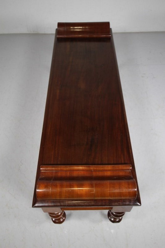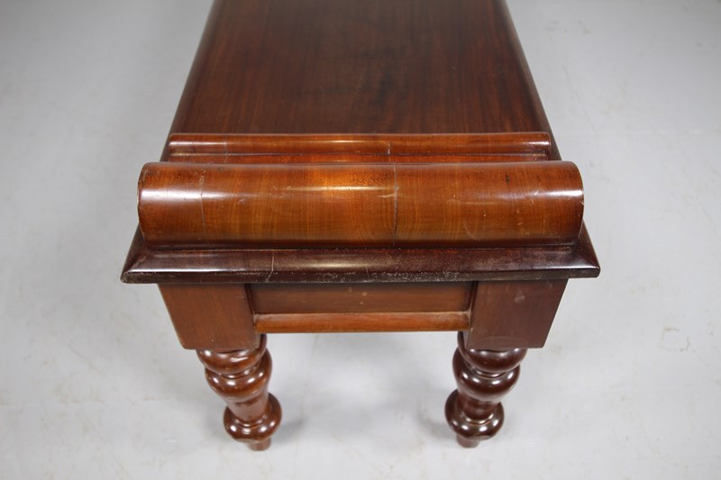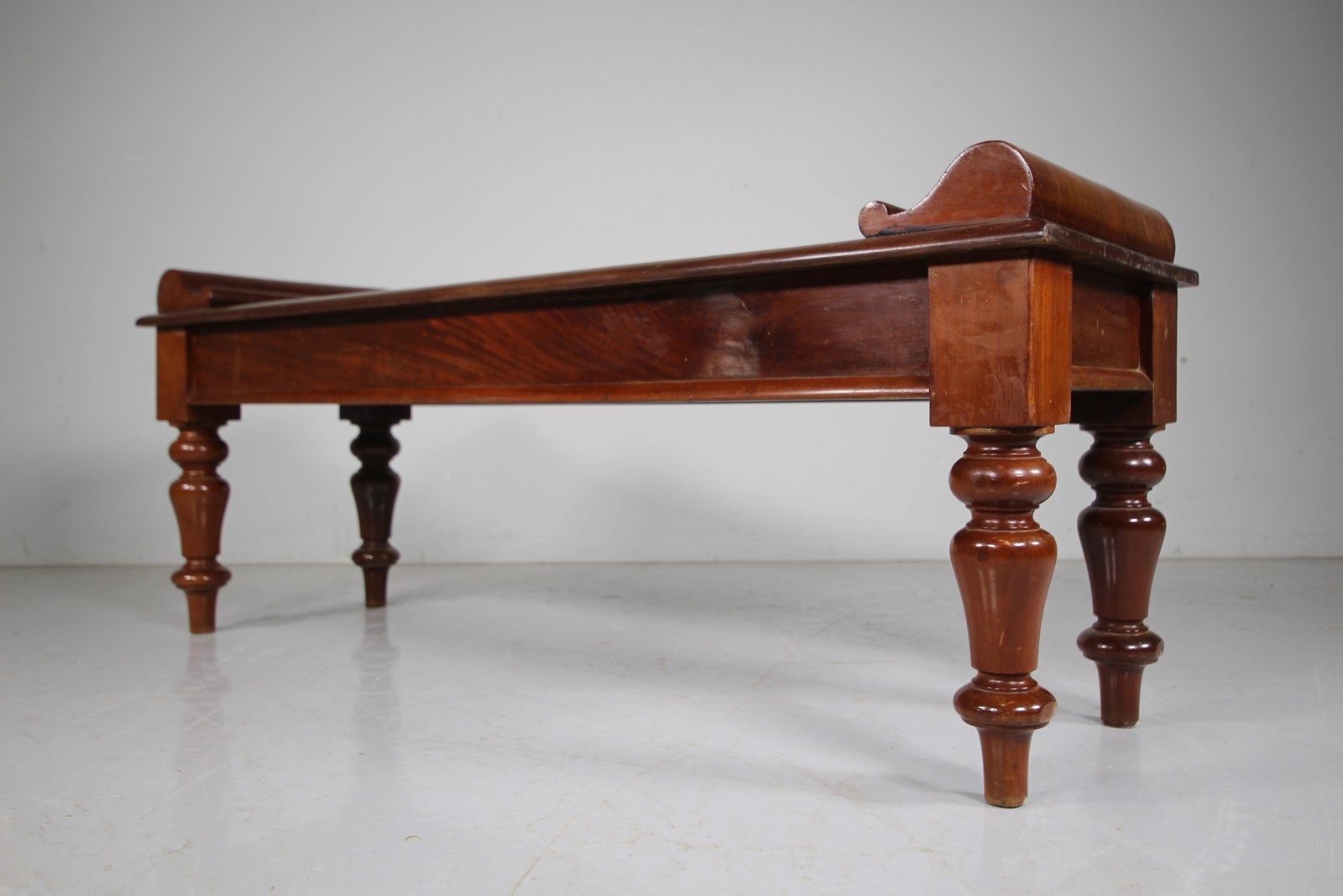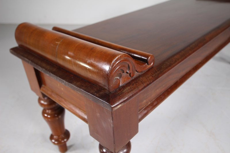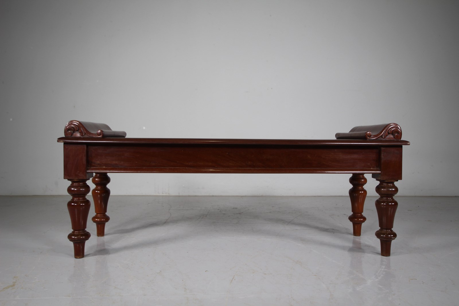 A very good quality, solid English antique mahogany window seat that stands on four, well turned legs with a single piece mahogany seat with decorative shaped ends which have carved scrolls to the front and plain behind. In superb, strong condition and all a very lovely original rich colour and finish. To the actual seat it is 43cm high. English and dating to around 1840.