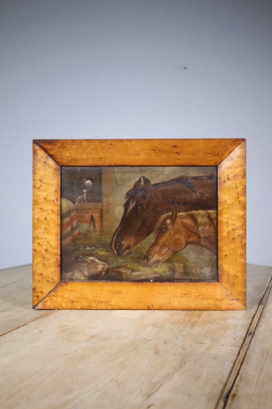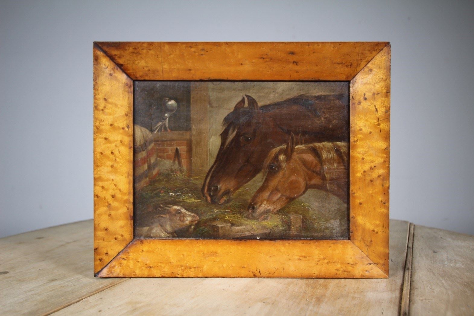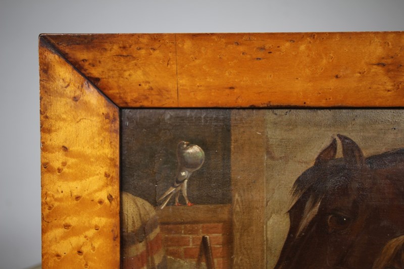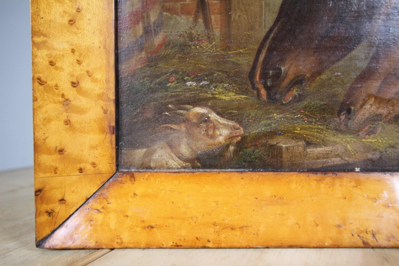 A beautifully painted English horse racing yard scene of two racehorses eating from the hay manger with a lovely pigeon in the background, puffing out his chest along with a goat trying to steal some hay in the foreground. The horses race rugs hang over the wall. In excellent condition, oil paint on canvas and mounted in a period antique maple wood frame. English and dates to around 1880.