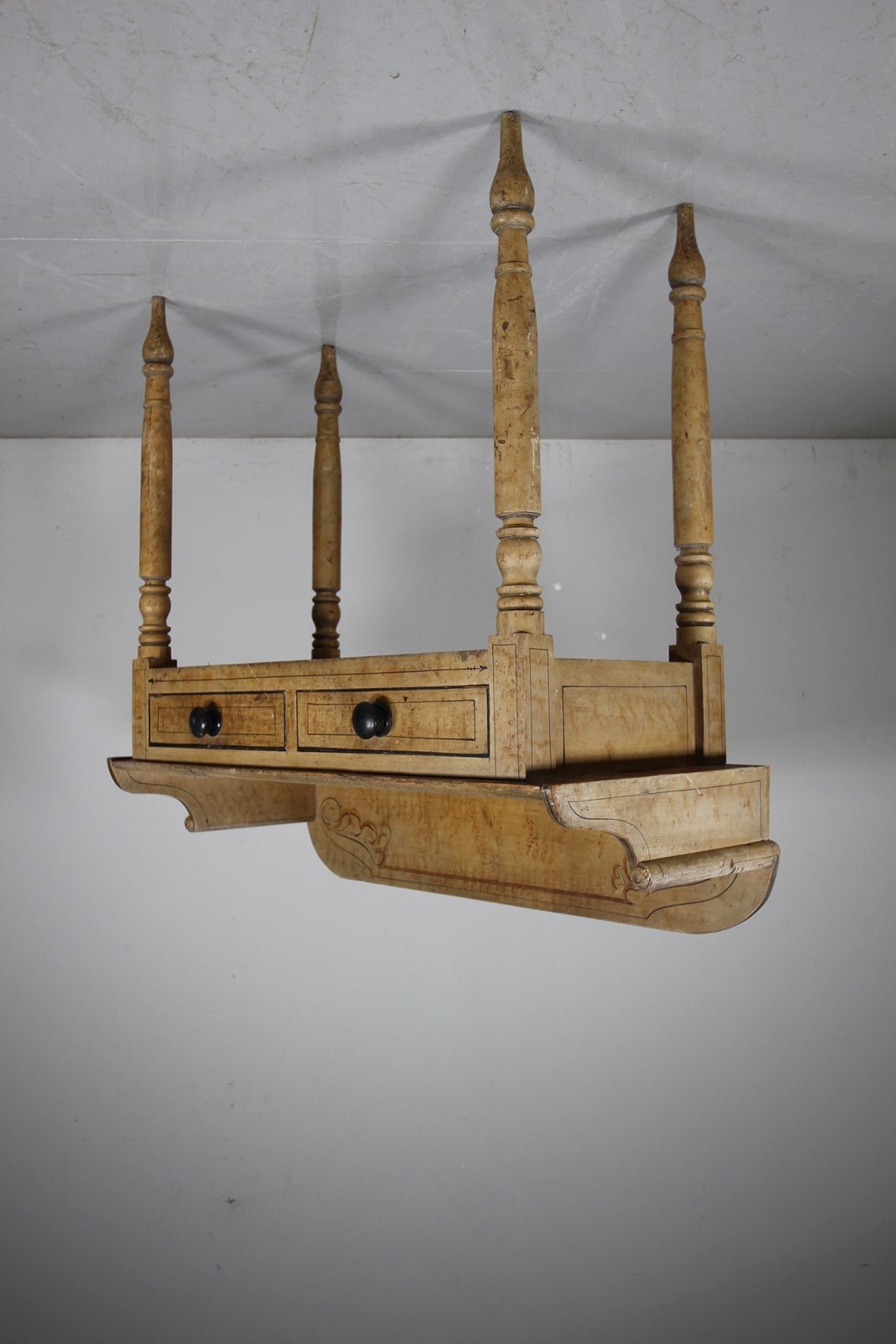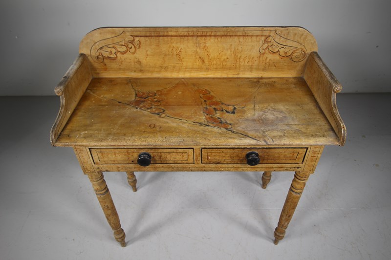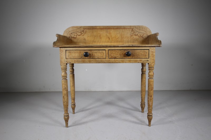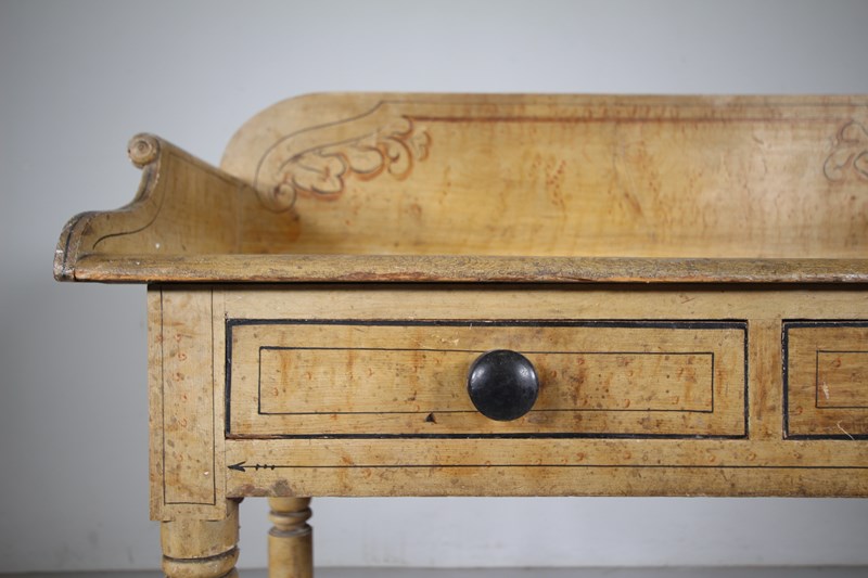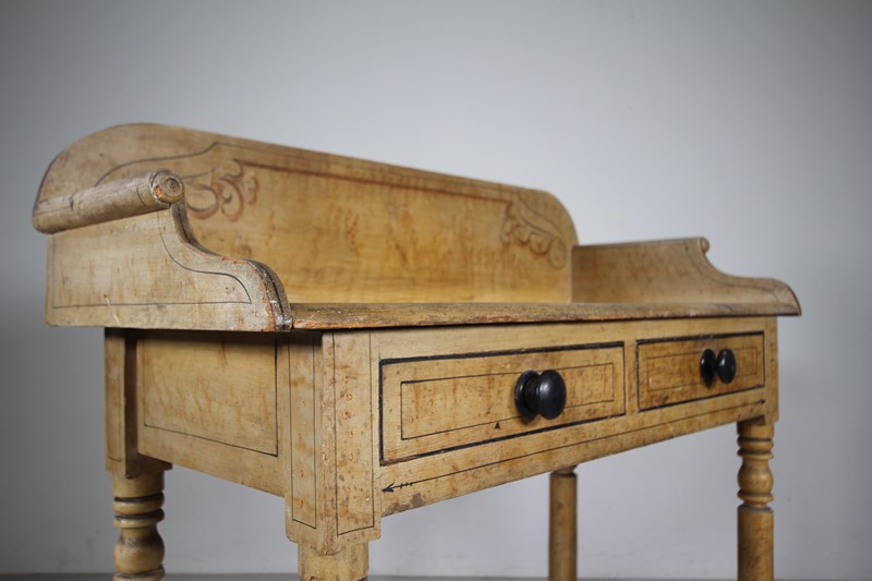 A lovely original painted pine English antique side table that is in very good condition, all sold and with a beautiful faux marble hand painted table top along with line work decorations. Dating to around 1840, this antique painted side table has a shaped up stand with scrolling sides, two drawers to the front that open freely and have the original ebonised handles. A decorative piece of English original painted pine furniture.
