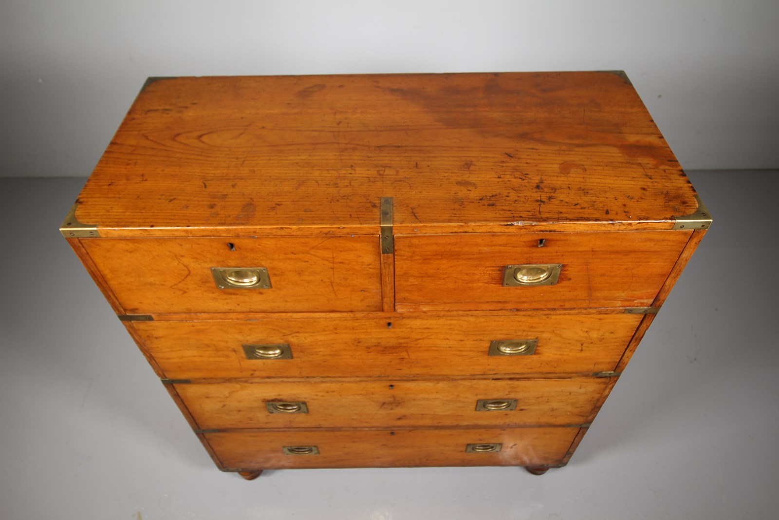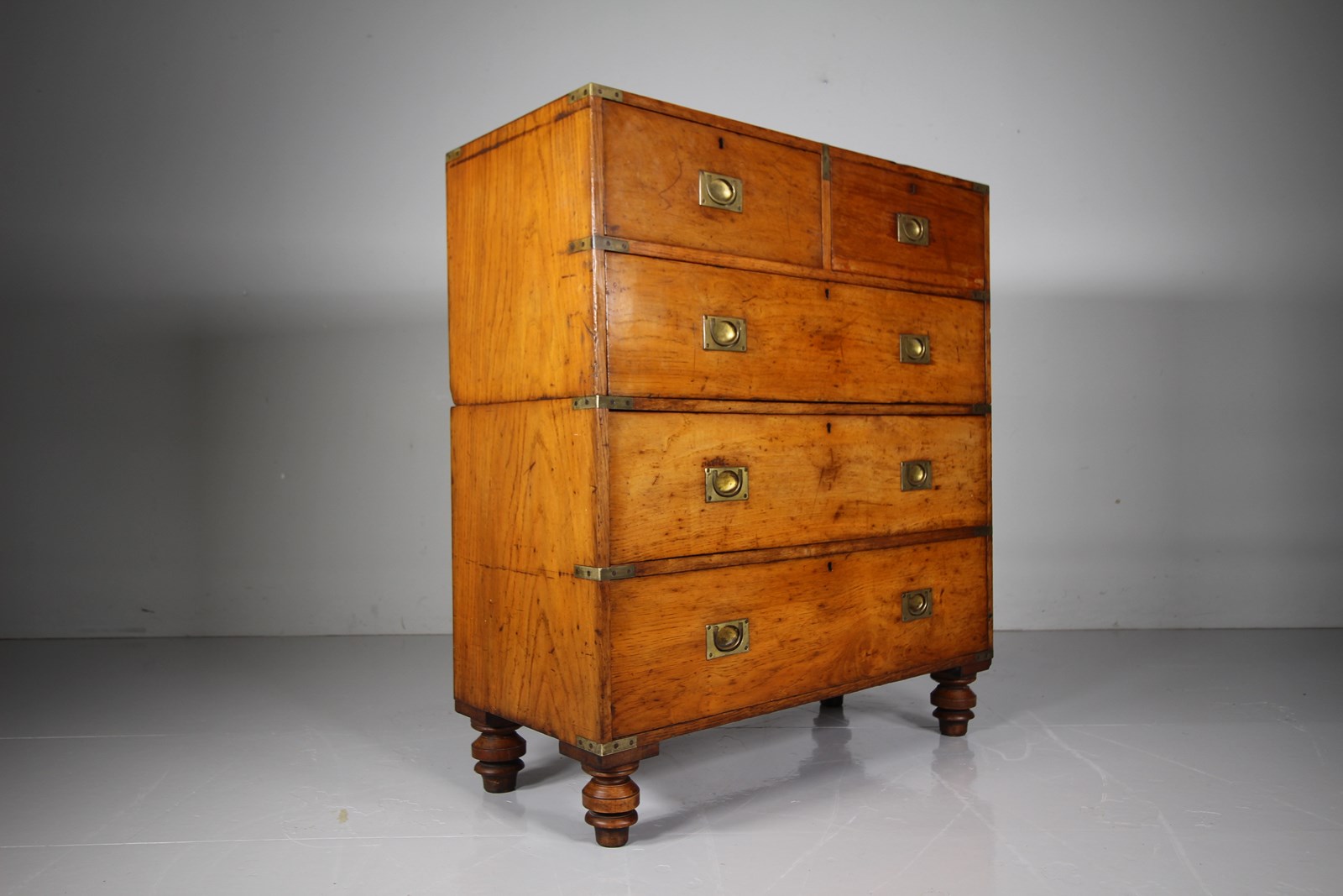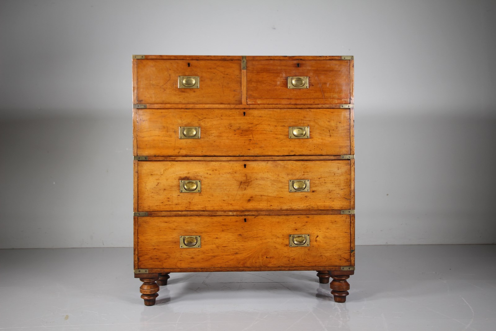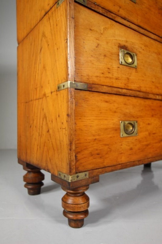 A proper, true 19th century antique campaign chest of drawers, designed to be moved along the campaign trail, comes apart in two sections at the waist, along with four original screw off turned bun feet. Made entirely in an unusual choice of timber being chestnut which is a fabulous colour. This English antique military chest of drawers has brass bound corners to protect from knocks whilst moving and flush fit brass handles to the two short drawers over three long drawers. All five drawers run well and are clean inside. Lovely proportions and in very good original condition throughout. English and dating to around 1840.