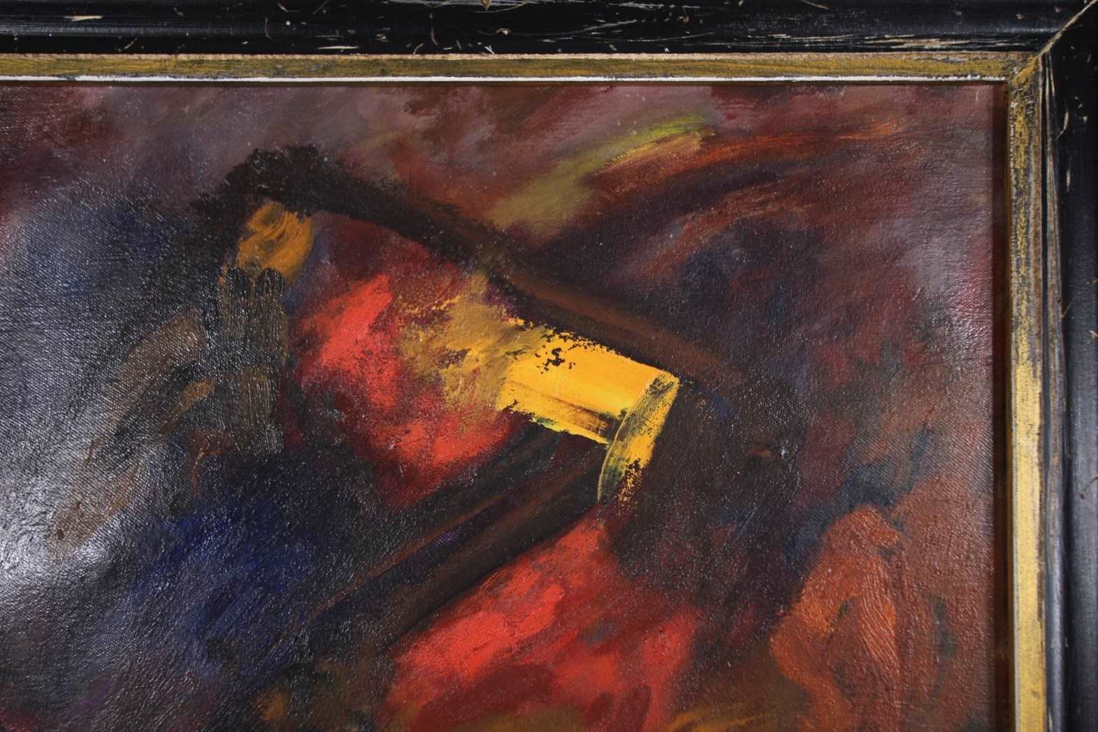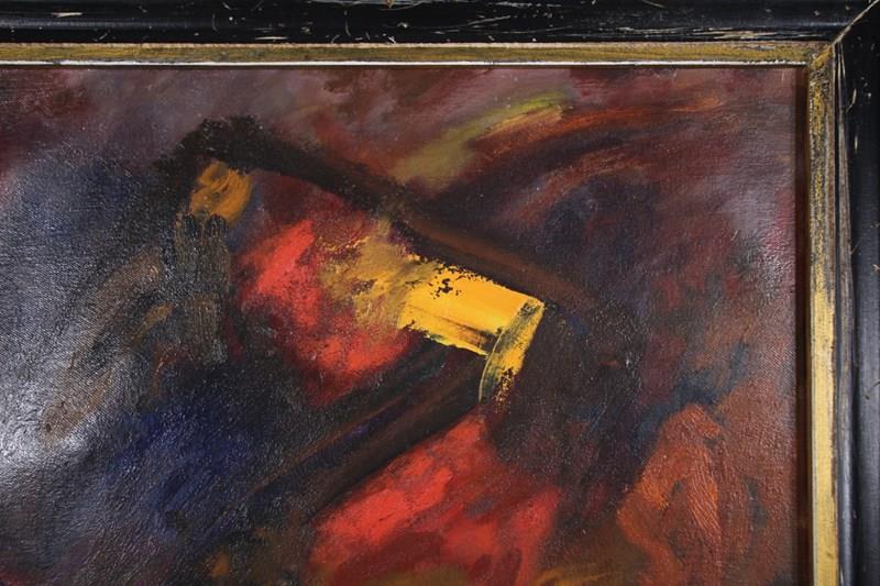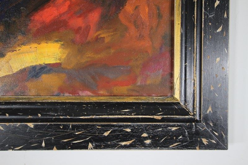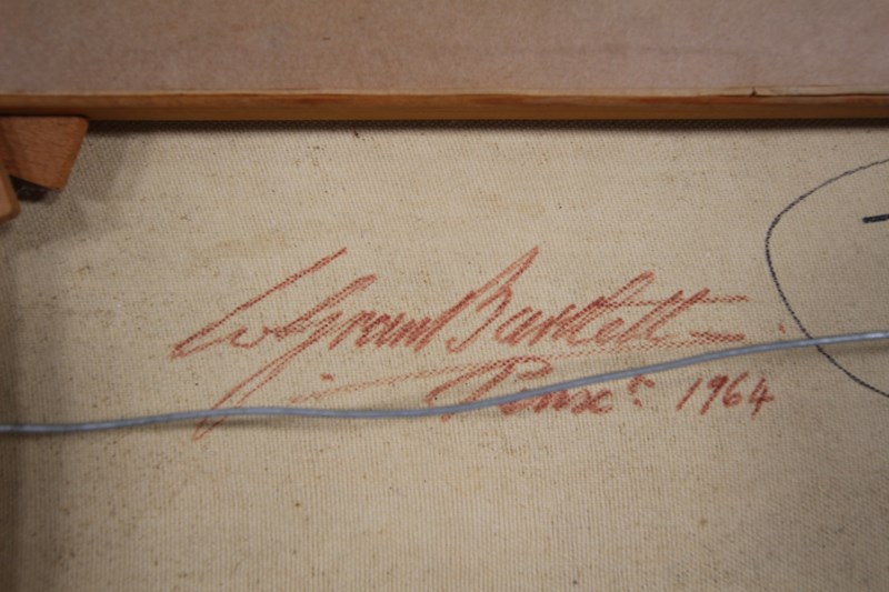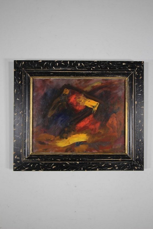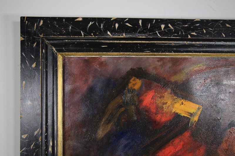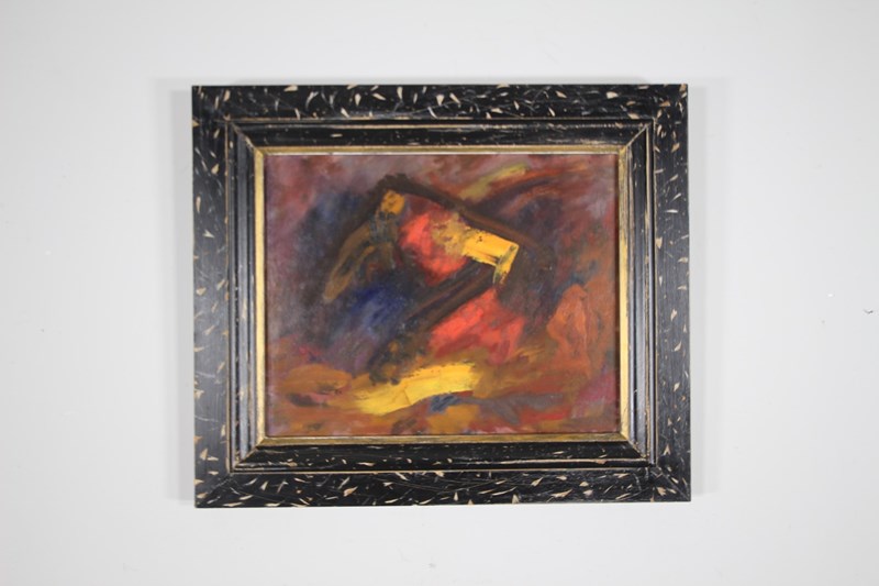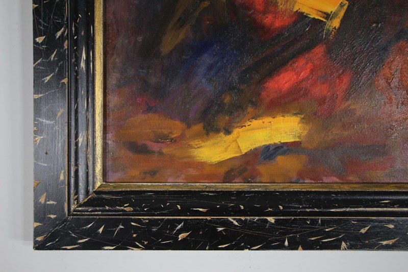 A stunning English mid 20th century abstract oil painting on canvas and mounted in the original interesting frame that is in the original ebonised and gilt finish. In superb condition, the oil paints are nice and bright still, sign on the back by the artist Grant Bartlett and dated 1964.
