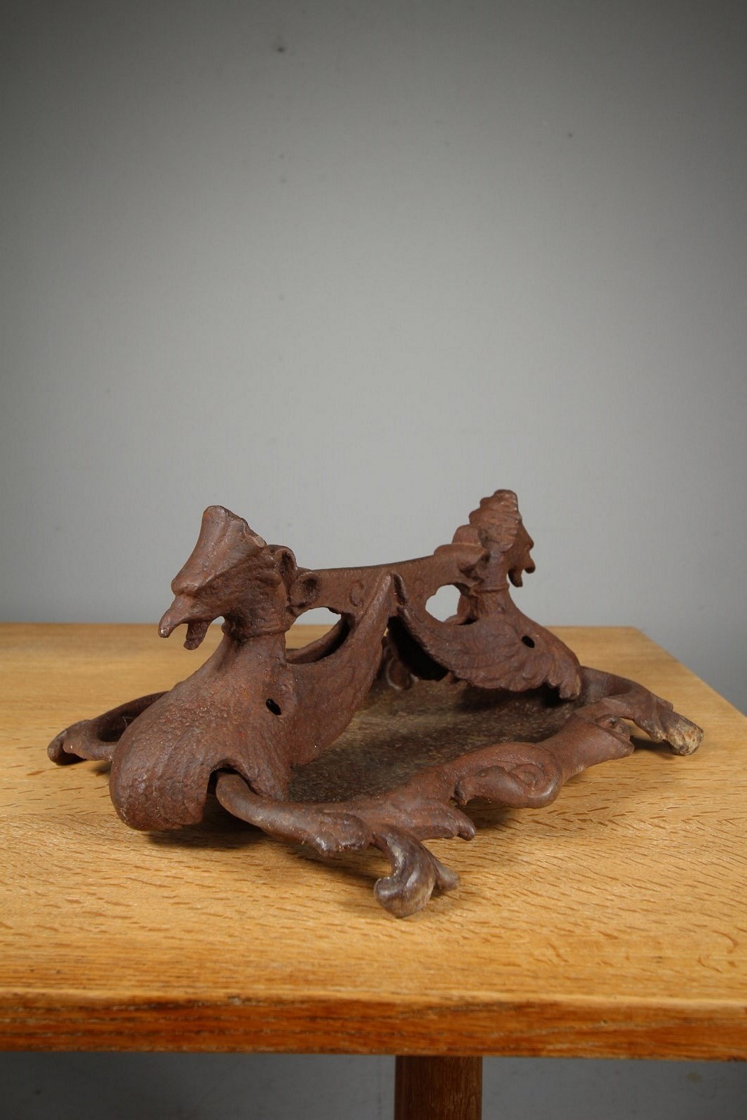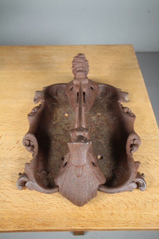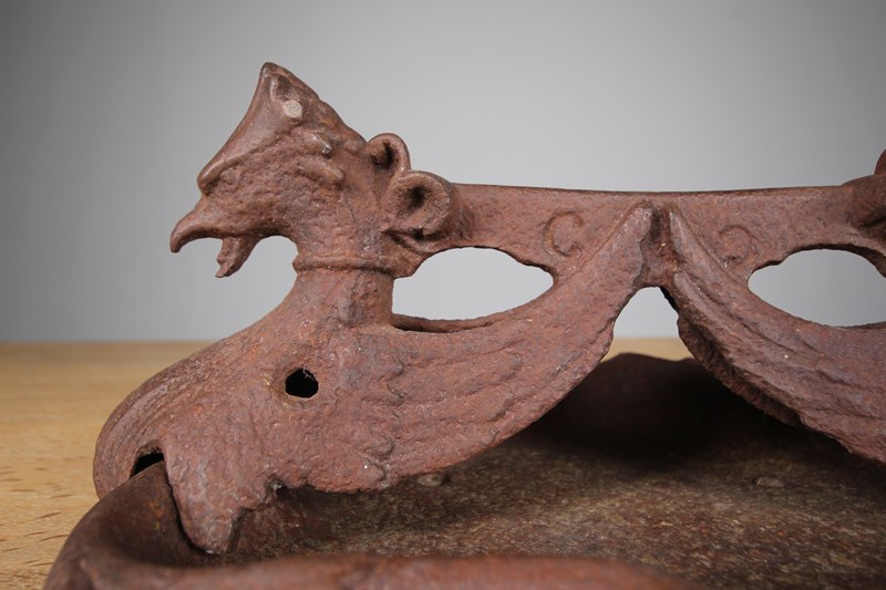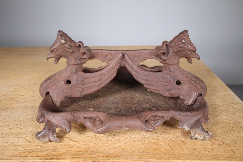 A lovely mid 19th century antique Coalbrookdale antique boot scraper modelled as twin winged Phoenix heads with a scraper and tray beneath. The boot scraper actually lifts out of the tray to empty/ clean. In excellent condition with no damage. Dates to 1850.