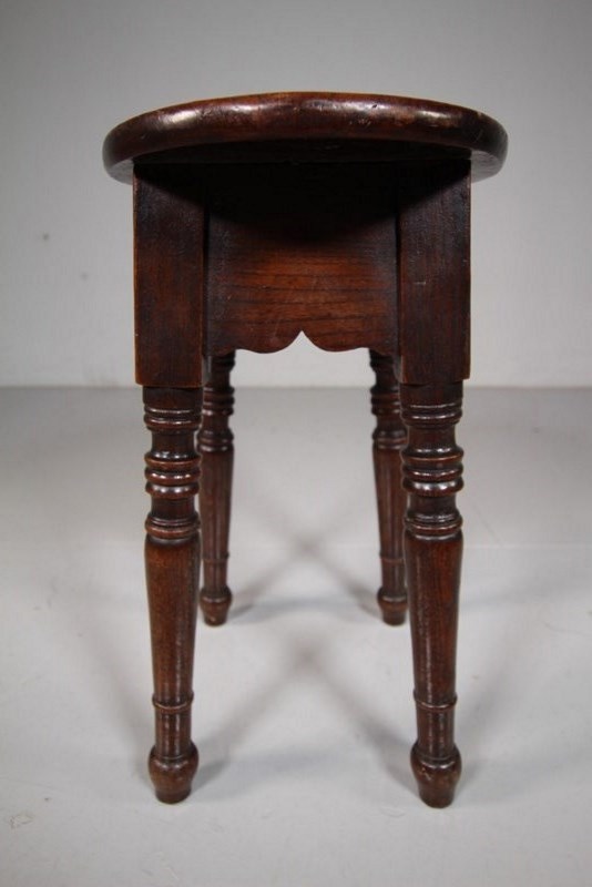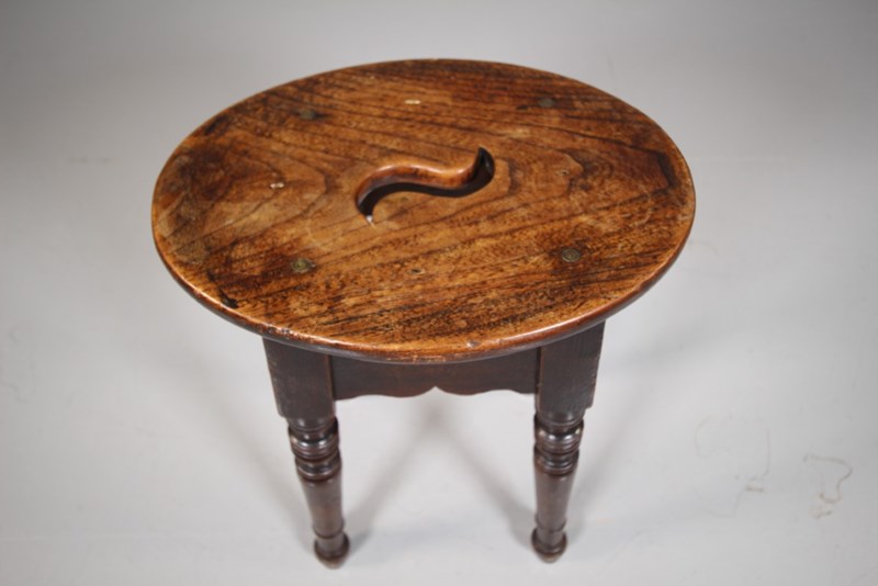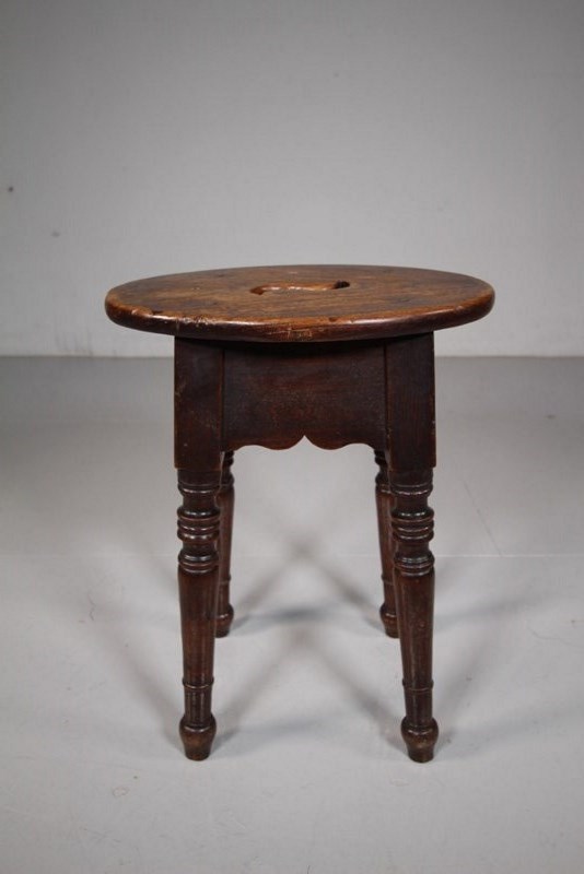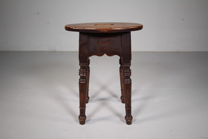 A beautiful solid antique elm 19th century stool, this model was only ever made in the East Anglia region. It is in superb condition, all very solid and a wonderful original colour. Stands well on four turned legs with a shaped frieze to all four sides and with an original pierced hand hold to the oval seat. Dates to around 1840.