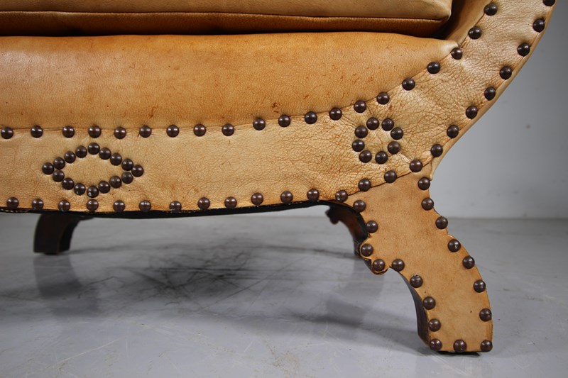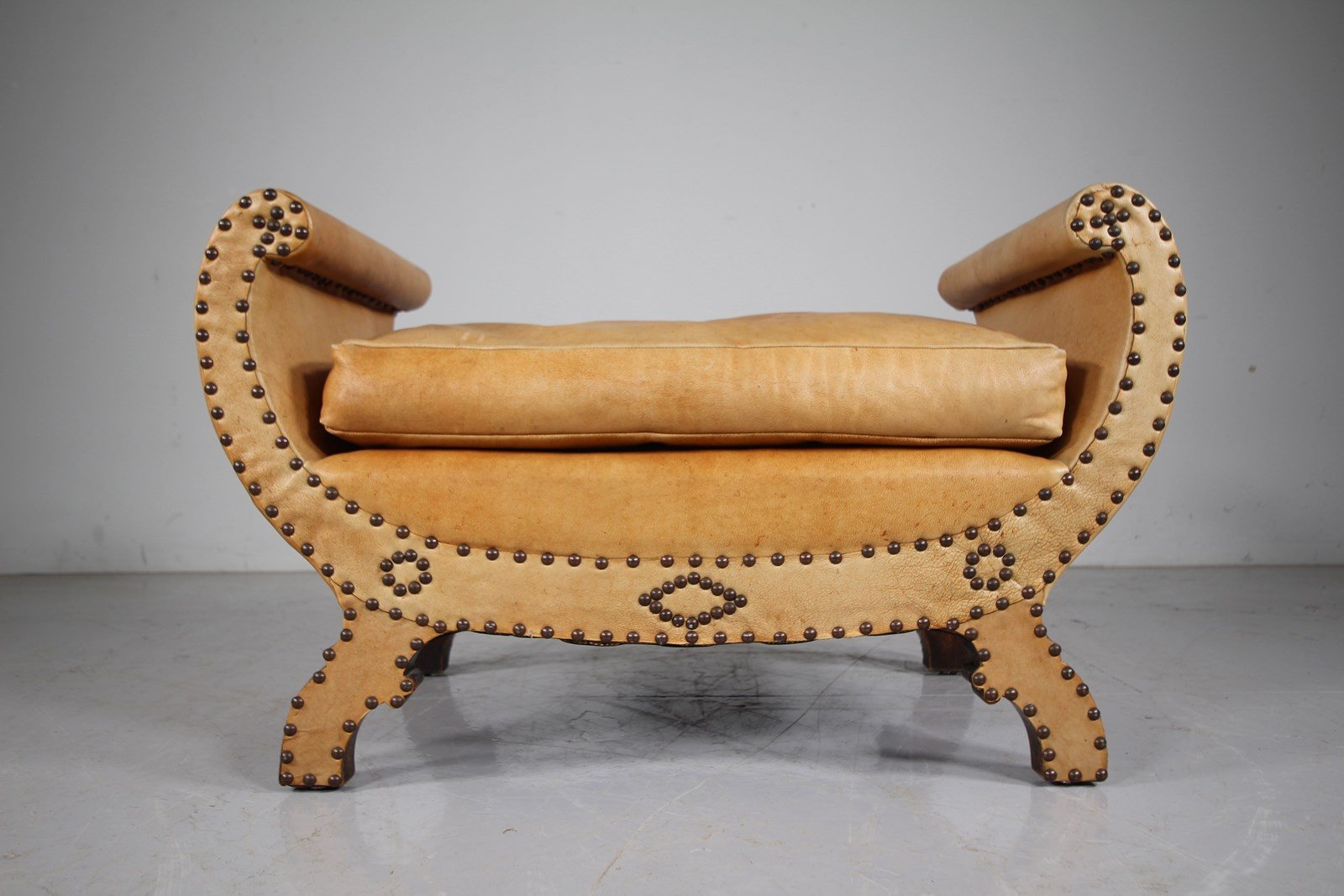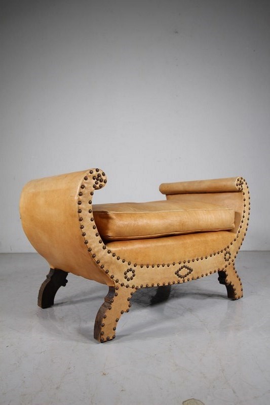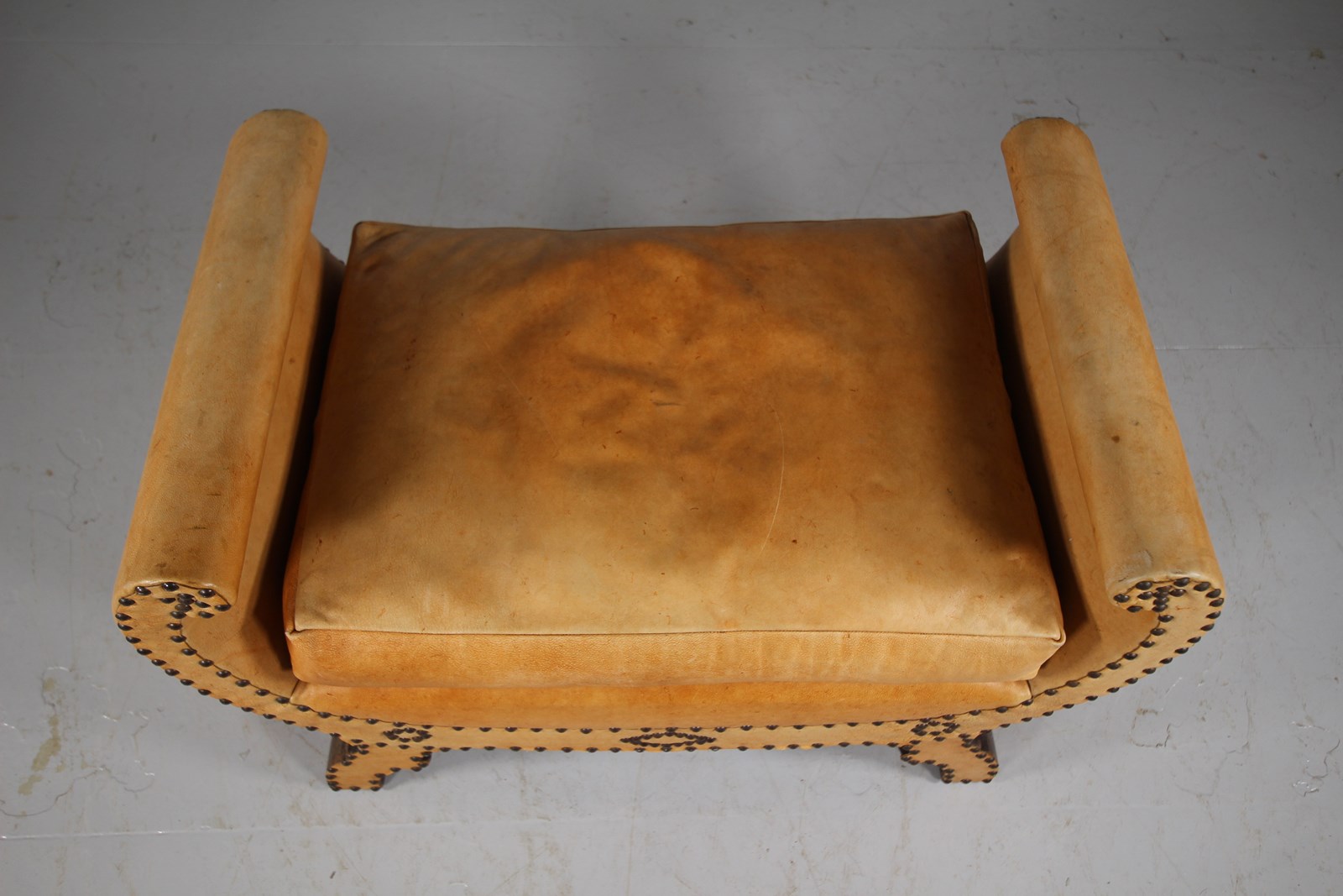 A lovely pale tan leather original upholstered shaped antique footstool or seat in excellent condition. Complete with a feather filled lift off seat cushion on the shaped stool frame which is leather upholstered on both sides with the exact same brass stud work design to both sides, so it can free stand within a room away from a wall. The leather is in superb condition and a lovely colour. English and dating to around 1910-20. The seat height is 40cm.