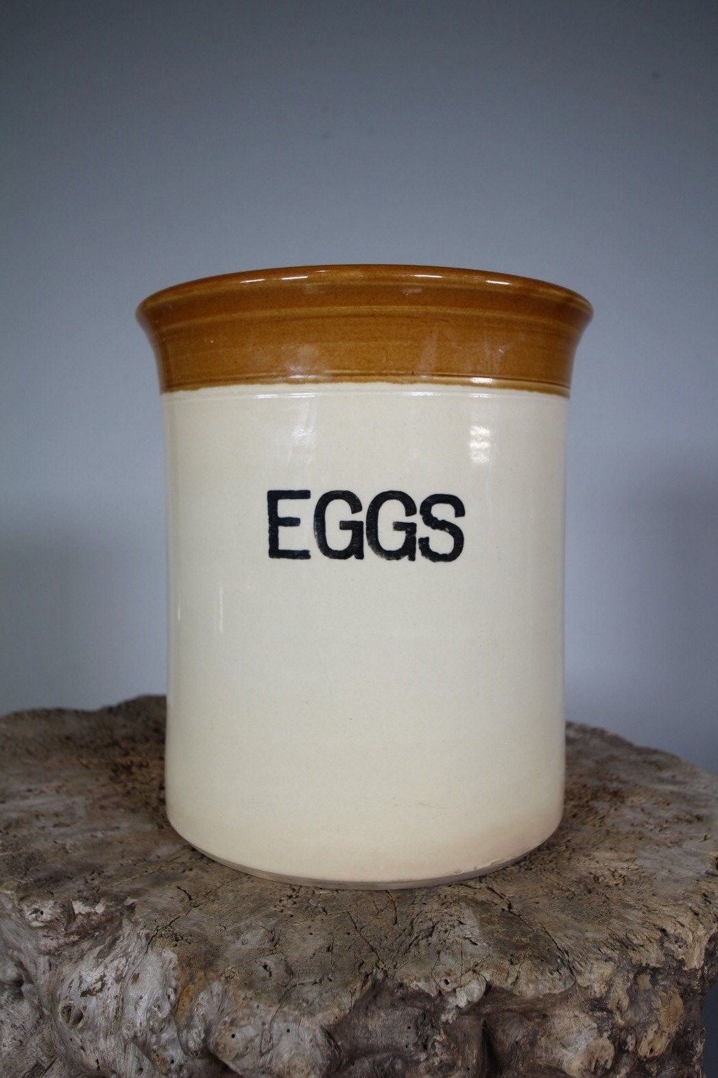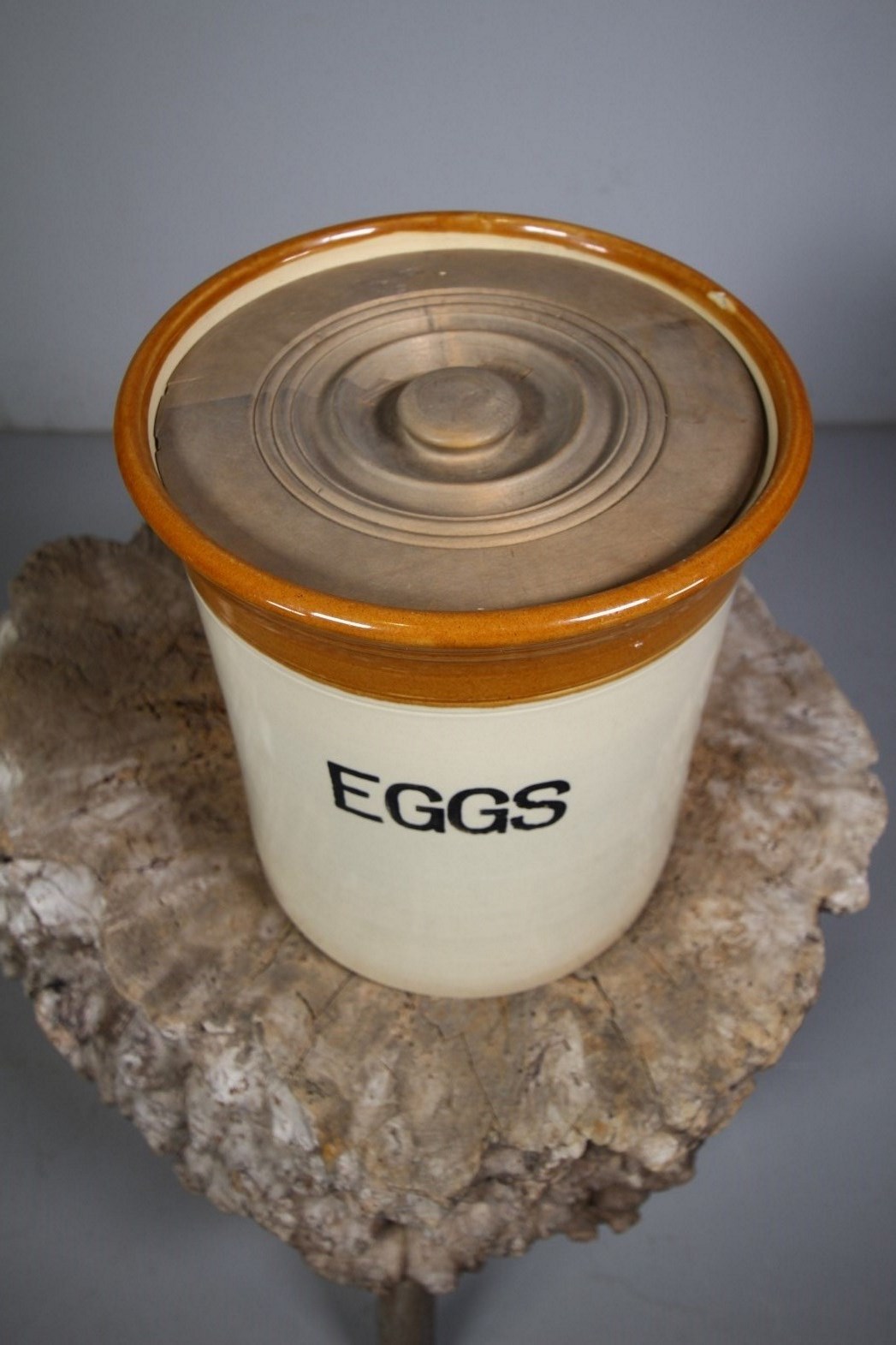 A large English antique buff pottery antique two tone egg crock with a lovely turned wooden lid. In excellent condition with no cracks. The Eggs lettering to the front is under a clear glaze. Dates to around 1910, a lovely piece of English antique country kitchen storage pottery.