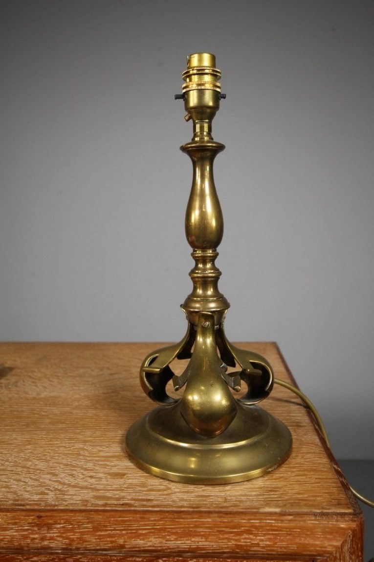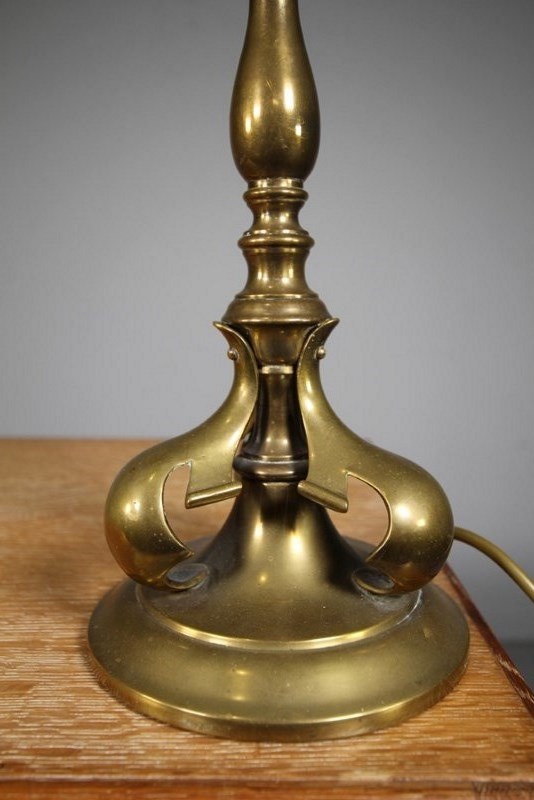 A good quality English antique table lamp well cast in brass and with a weighted iron base for stability. Very much like a General Electric Company design. It is a lovely colour and is newly rewired and tested. Dates to around 1900.