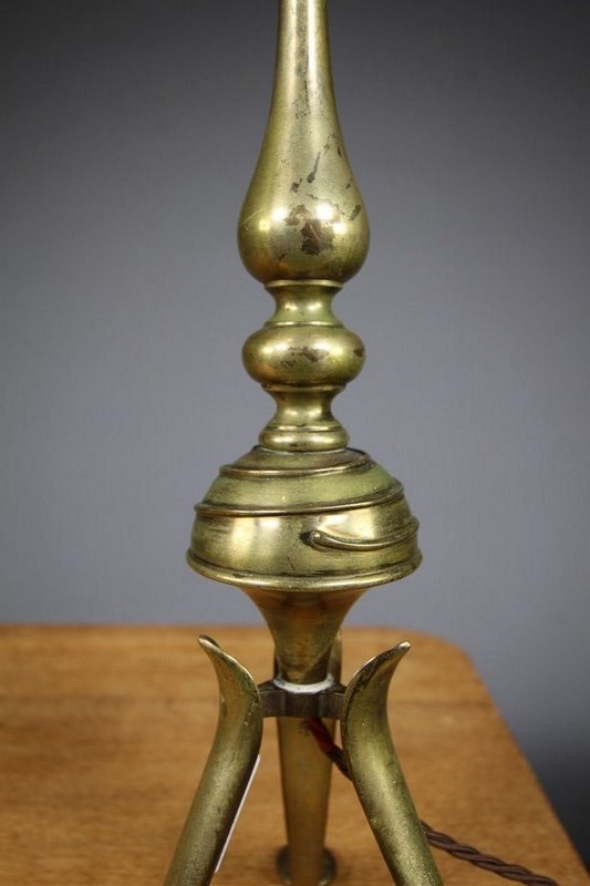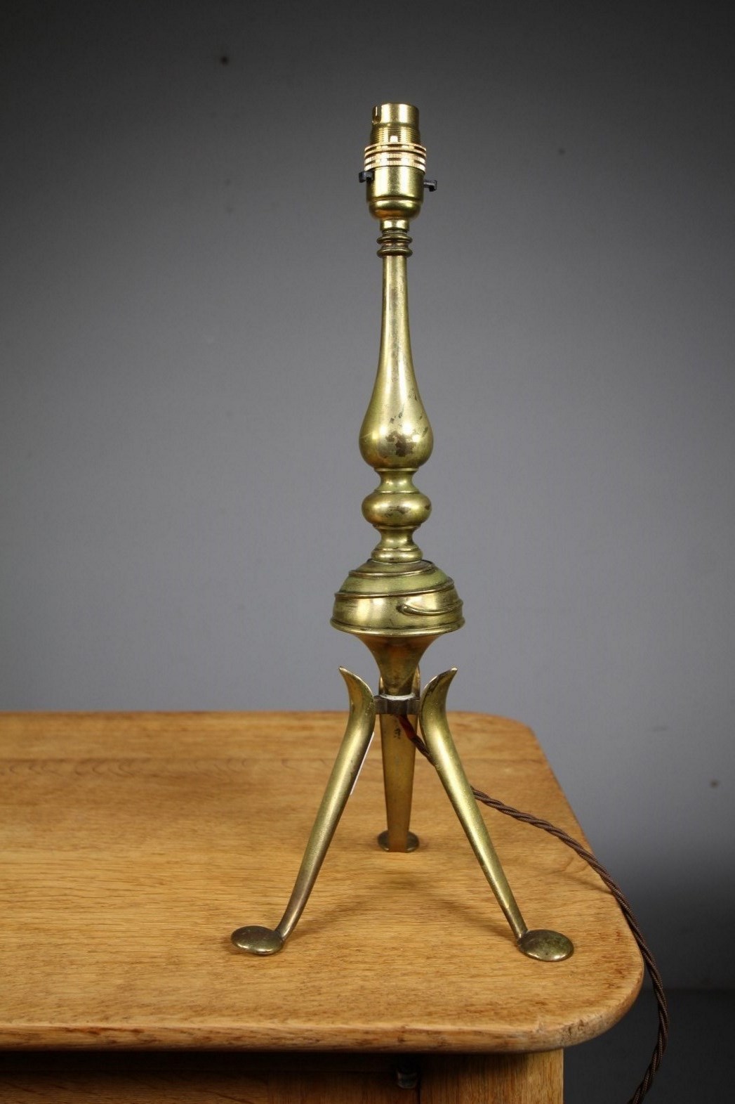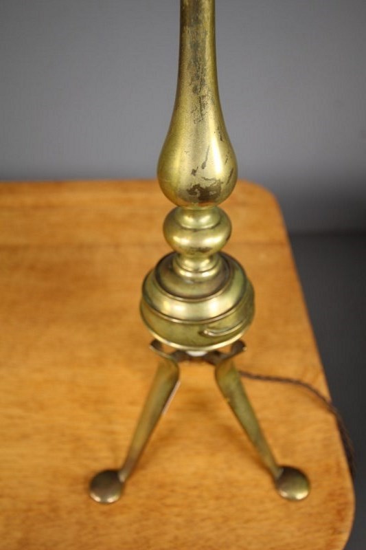 A super quality tall antique table lamp, very much in the W.A.S. Benson manner, stands on tripod legs with a turned stem and an unusual swirl decoration to the central knop. In excellent condition and newly rewired and tested. English and dating to 1900.