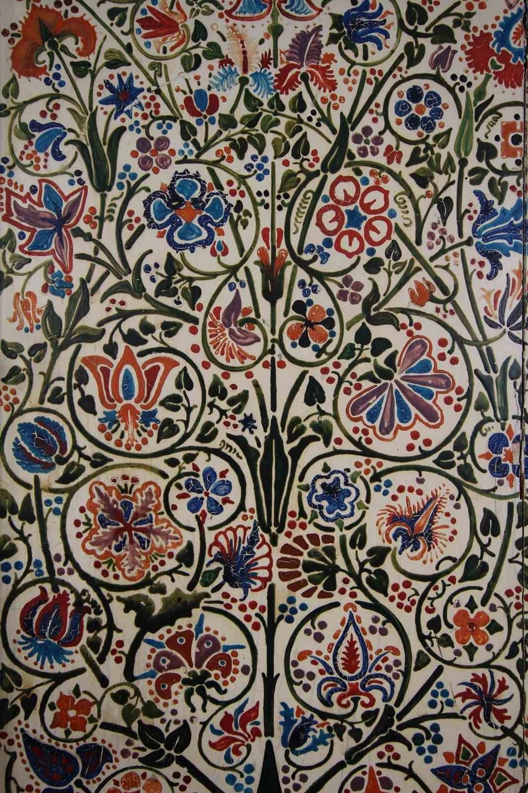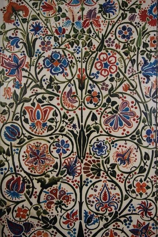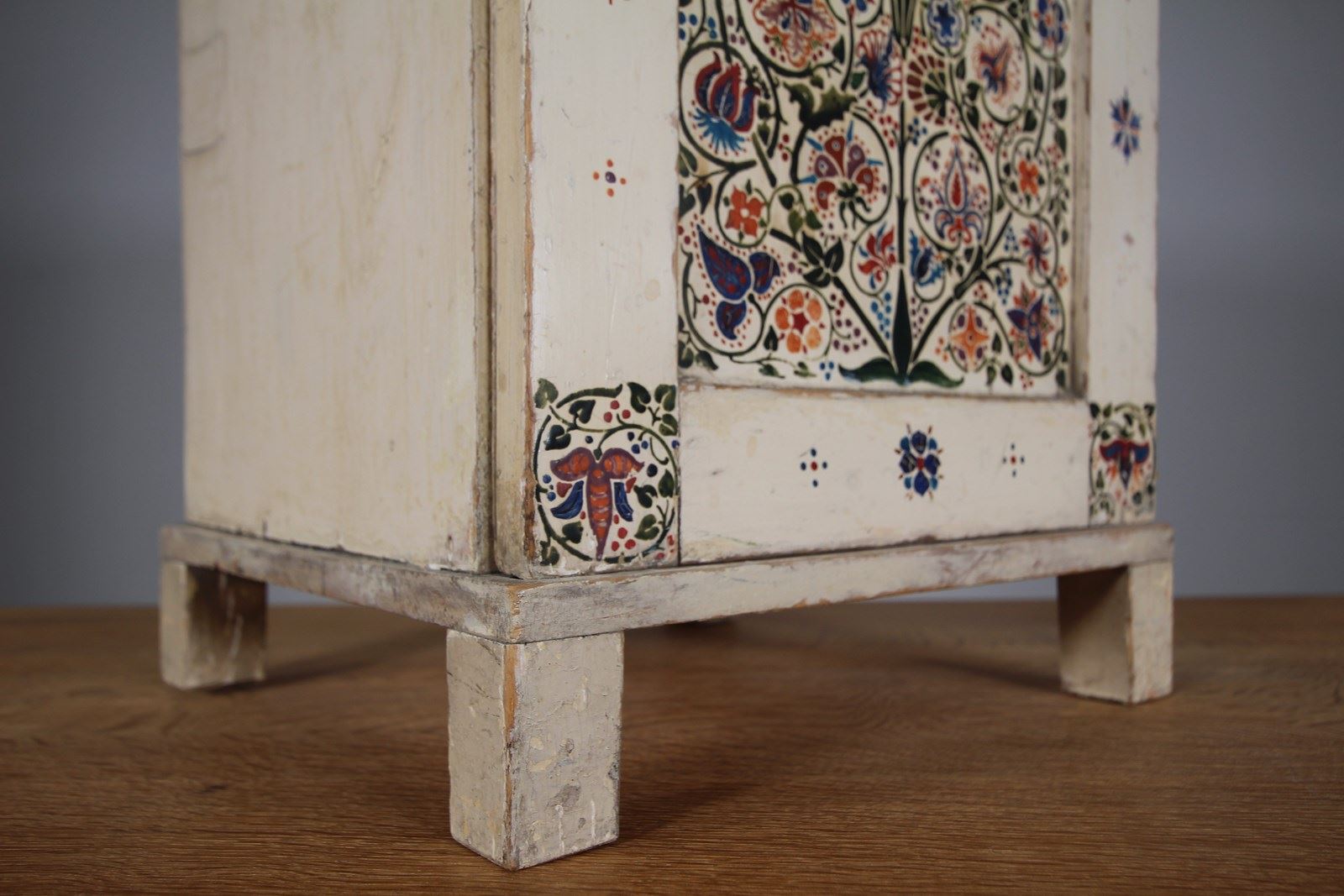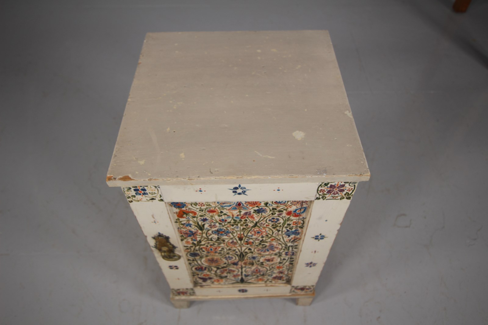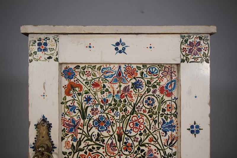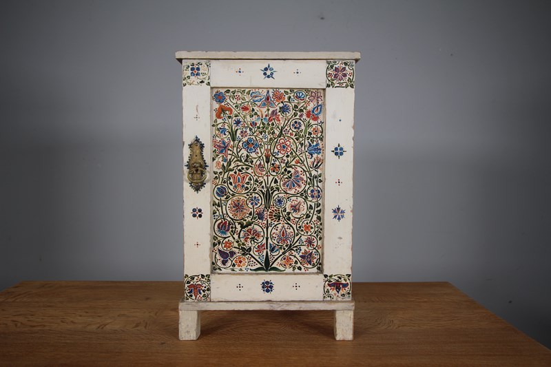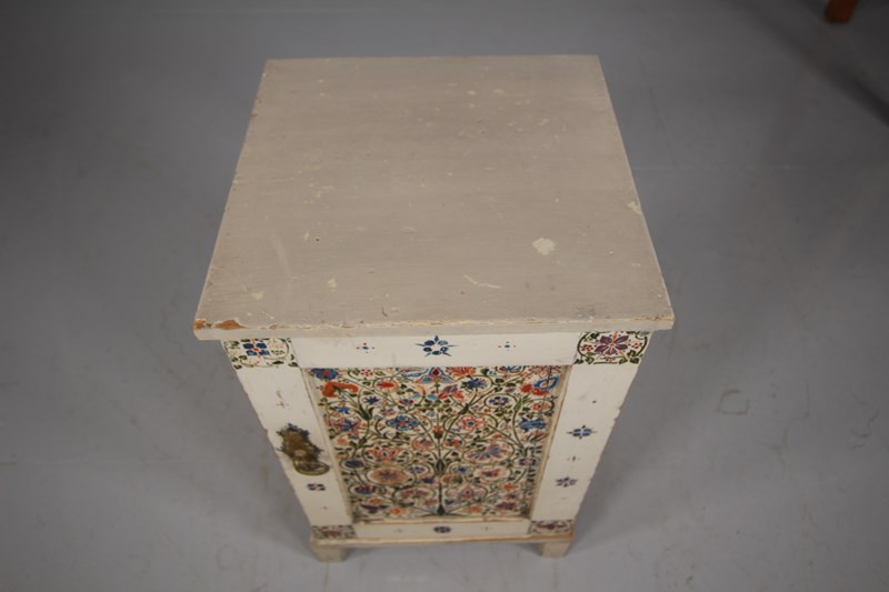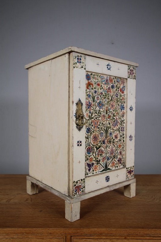 A beautiful late 19th century English Arts & crafts antique bedside cabinet that is in the original painted finish and decorated with original wonderful hand painted floral motif to the central panel and surround. In very good original condition, has a single decorated and panelled door with the lovely original brass ware handle and this antique bedside cabinet stands on square feet. English and dating to around 1875-85.