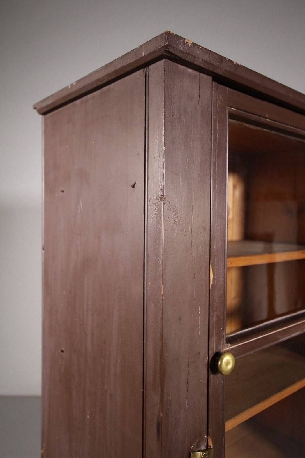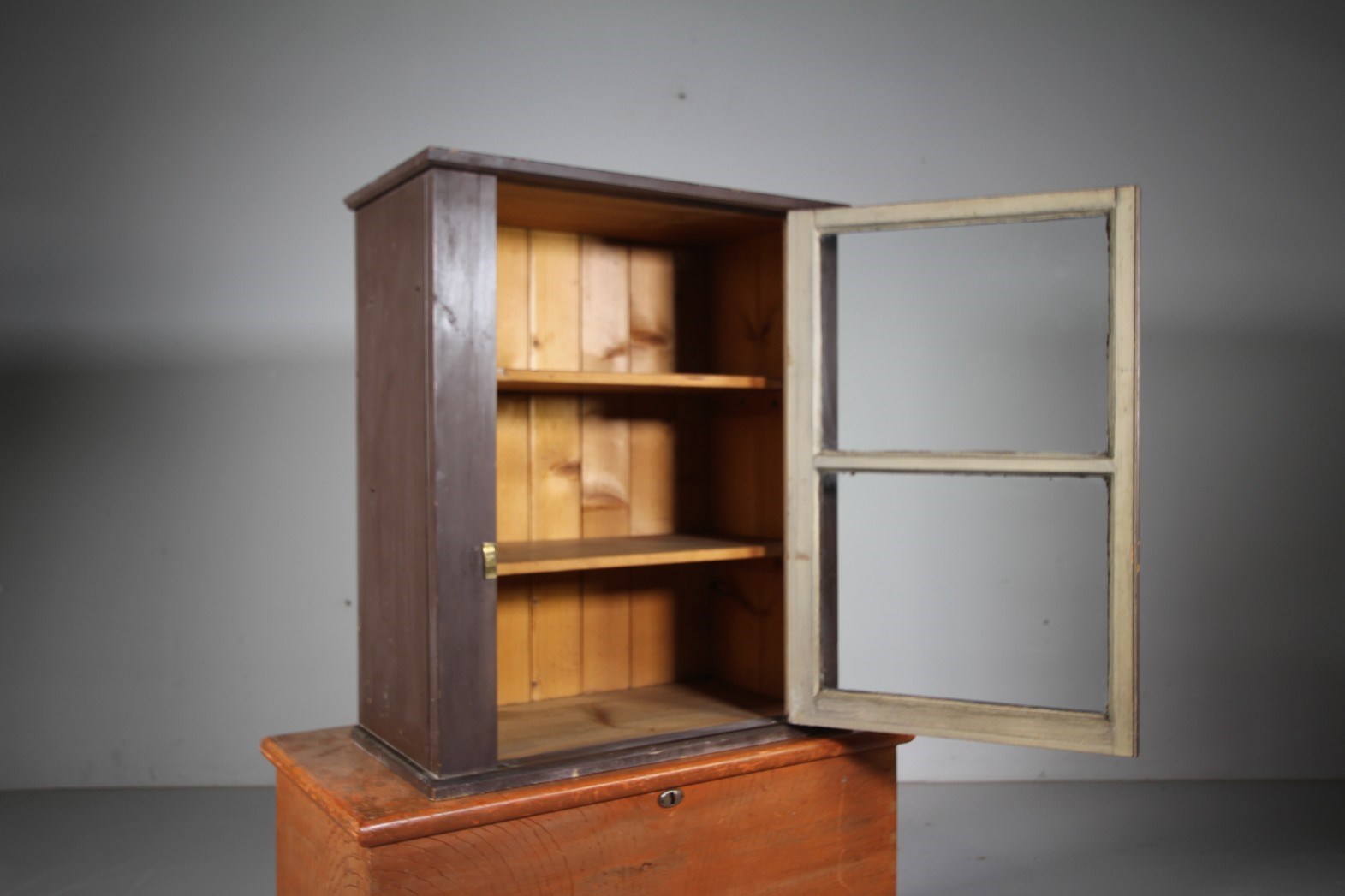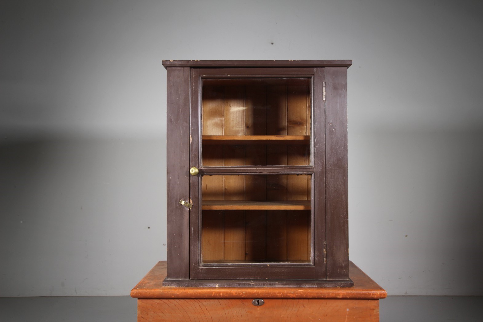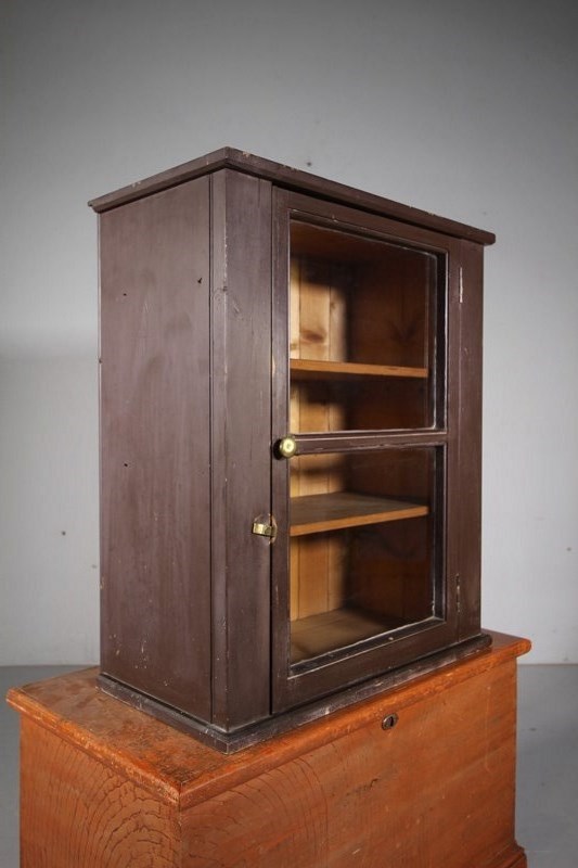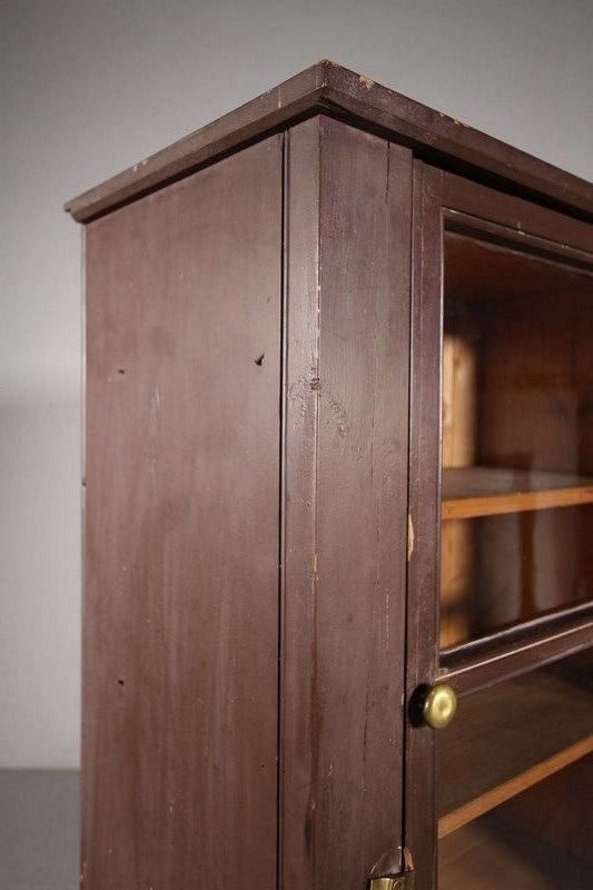 A lovely original painted pine early 19th century antique wall cabinet that has a single glazed door with the original brass knob handle. In very good, original condition, shelved inside and with metal hangers on the back. A large size, perfect for a country kitchen or bathroom. Made in solid pine with the lovely original brown paint finish. English and dating to around 1830.