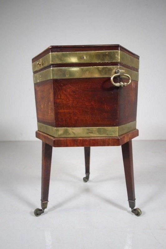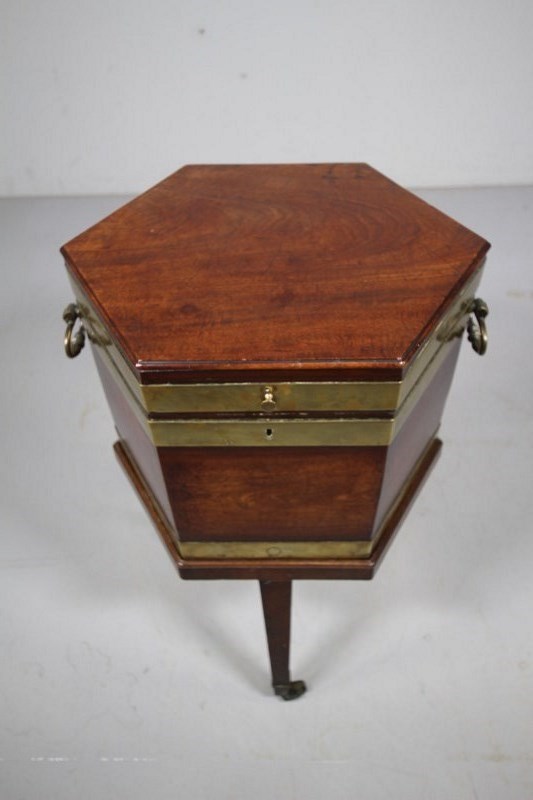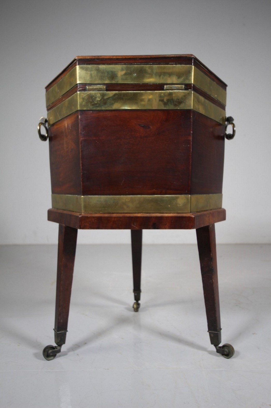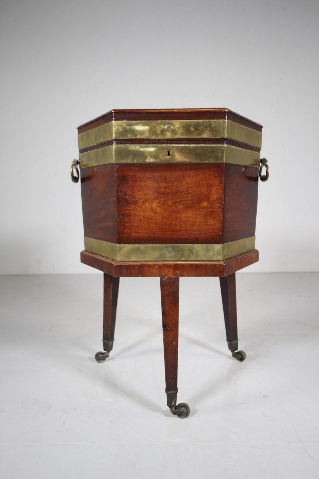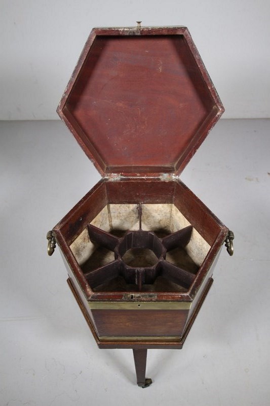 A superb quality and very original English late 18th century country house antique mahogany cellarette for up to seven bottles of wine. In such fabulous original condition, being brass bound and with original brass carrying handles to the sides. The antique cellarette is on a separate stand that features three tapering legs that finish on quality original brass cup castors. Inside the antique collarette are seven segmented compartments made in mahogany. A quintessentially British piece of Country House dining room furniture that dates to 1790. A design that the top section can be taken to the dining table.
