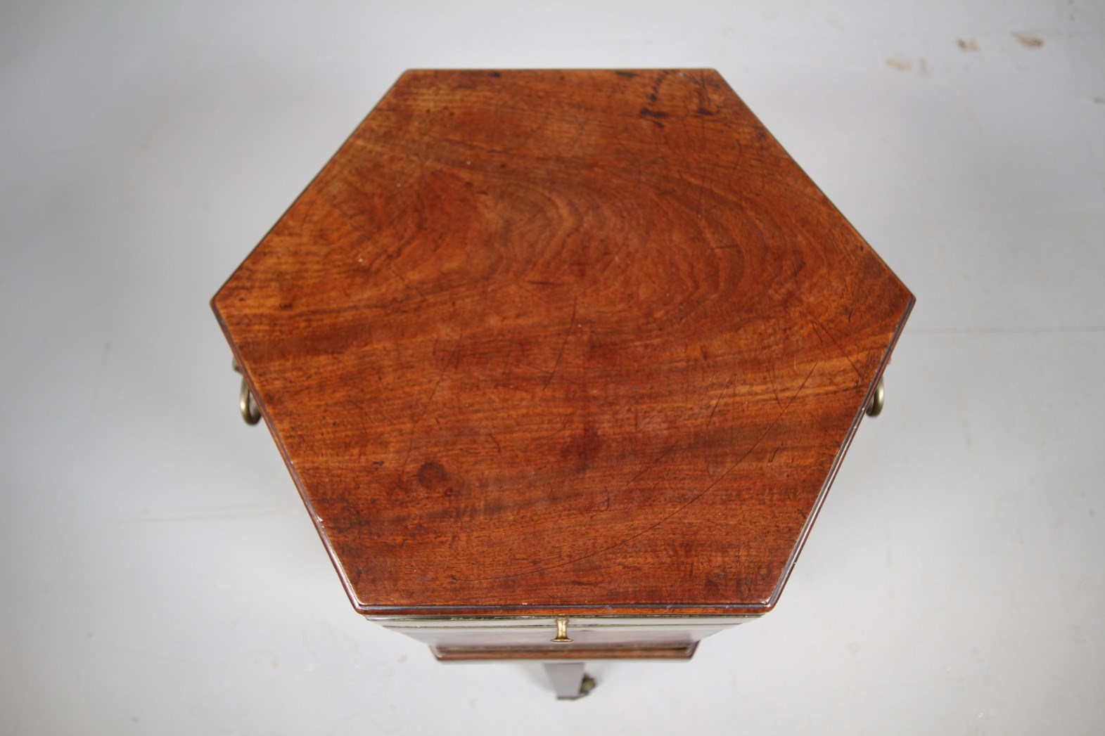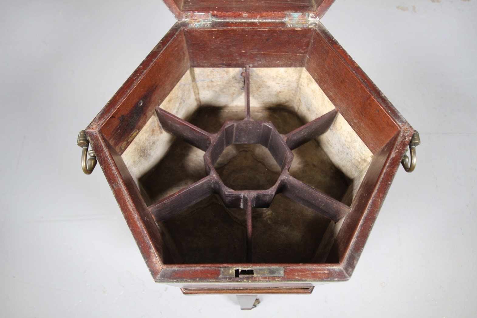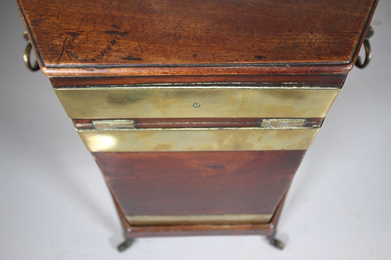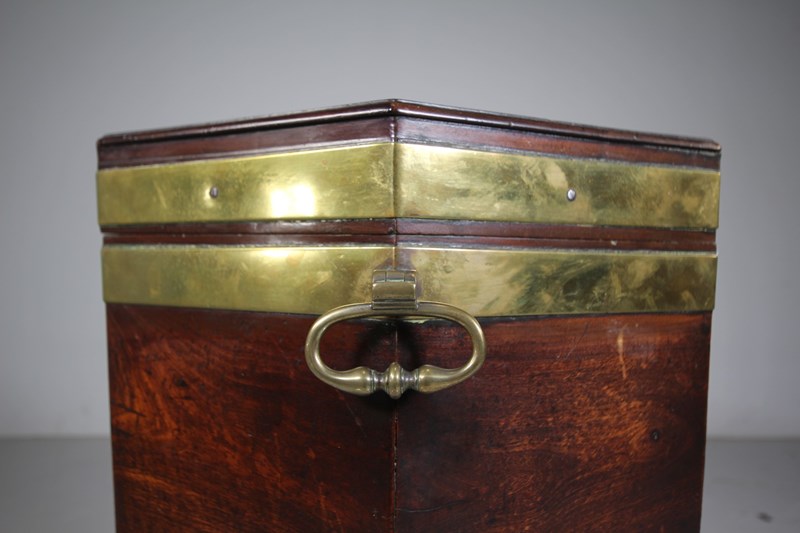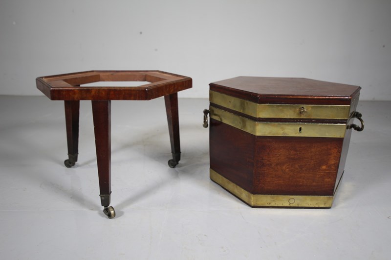 A superb quality and very original English late 18th century country house antique mahogany cellarette for up to seven bottles of wine. In such fabulous original condition, being brass bound and with original brass carrying handles to the sides. The antique cellarette is on a separate stand that features three tapering legs that finish on quality original brass cup castors. Inside the antique collarette are seven segmented compartments made in mahogany. A quintessentially British piece of Country House dining room furniture that dates to 1790. A design that the top section can be taken to the dining table.
