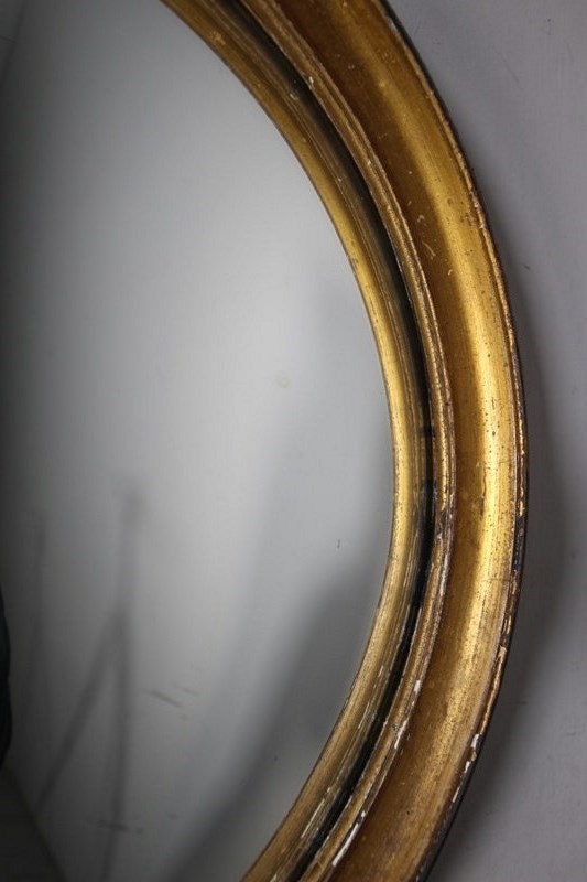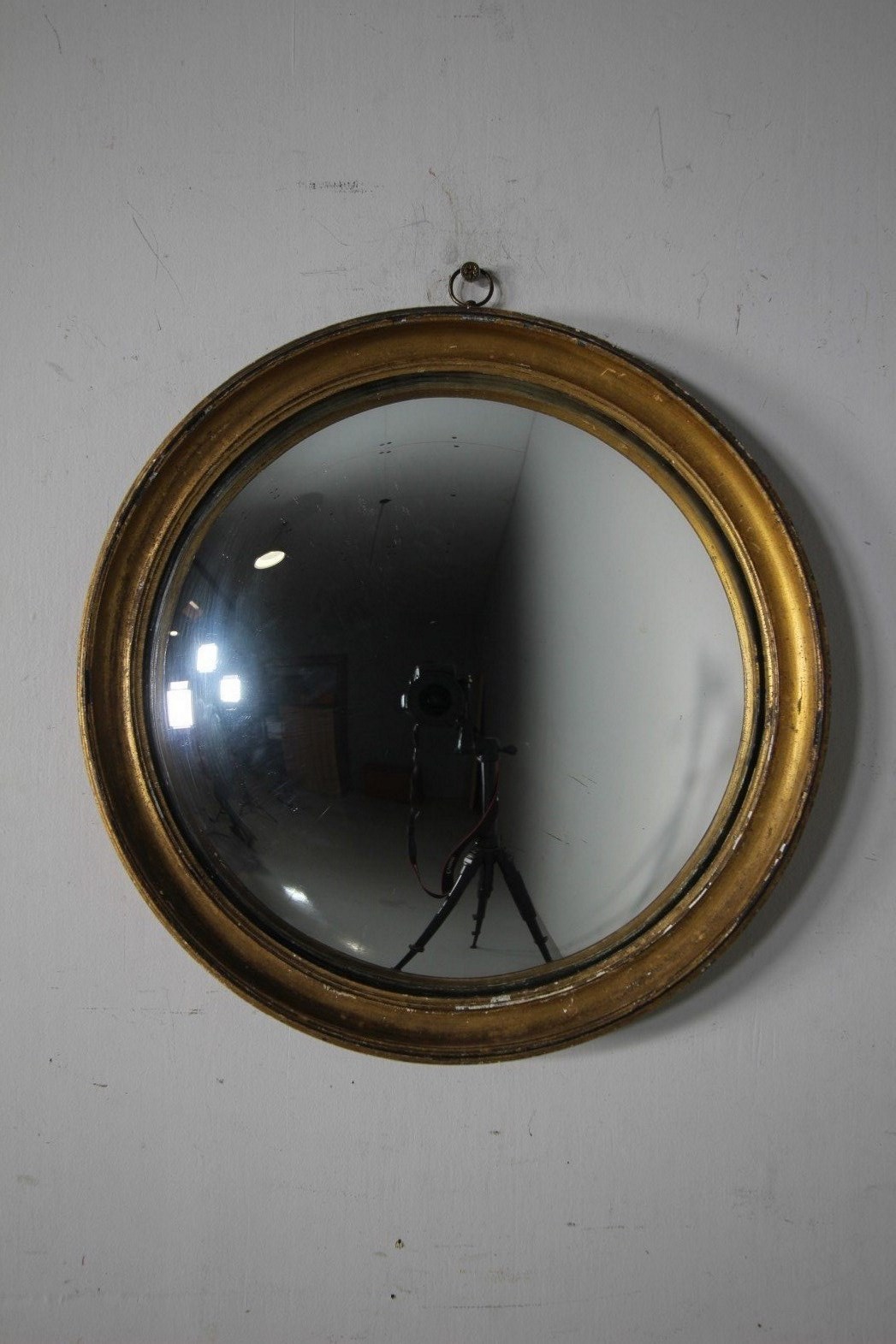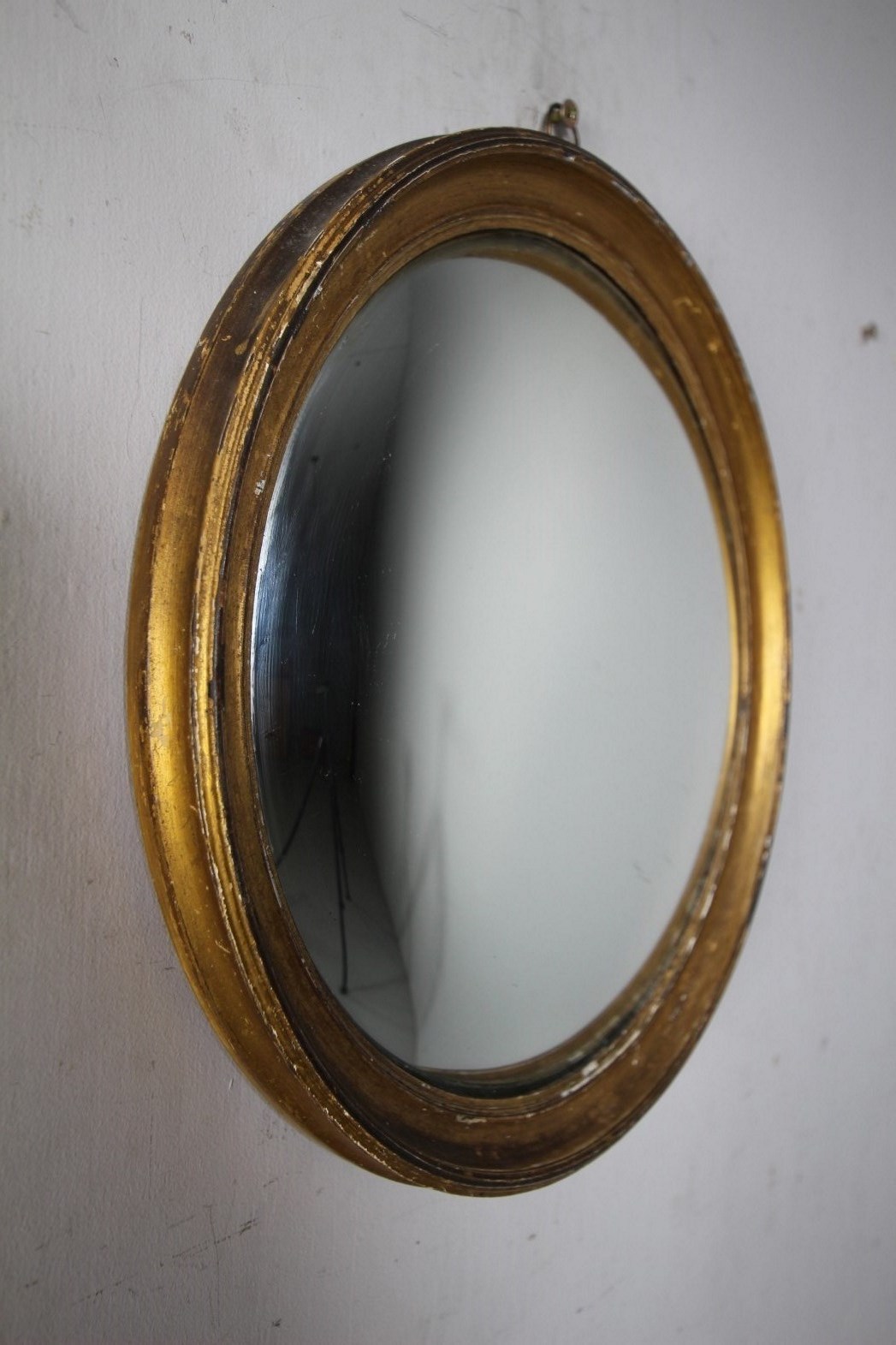 A simple, quality made English early 19th century antique convex wall mirror in the original gilt finish. A lovely size, complete with the original convex mirror plate, backboards and brass ring hanger to the top. In very good condition with great reflection on the convex. Dates to 1815.