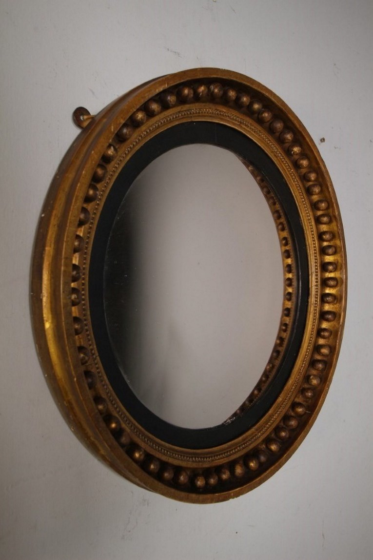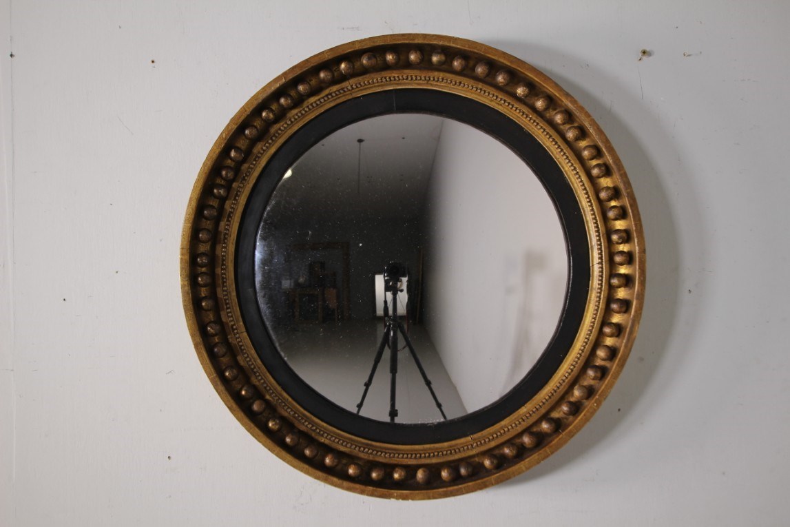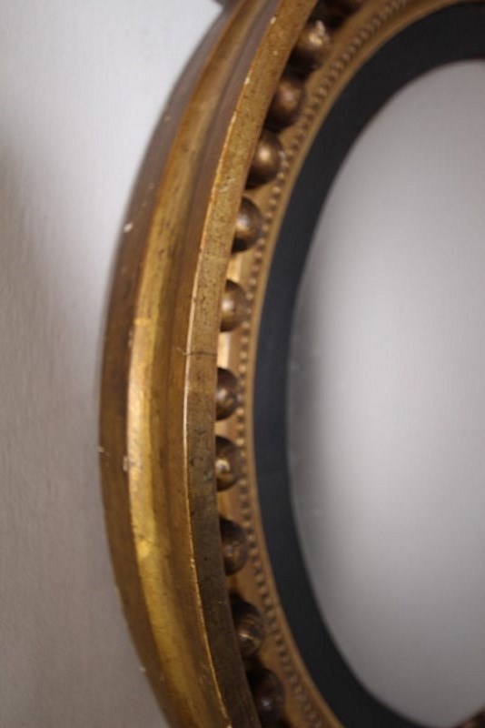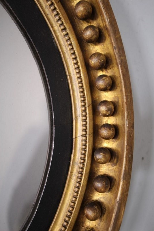 A very good quality, large sized English early 19th century antique circular convex wall mirror that has masses of decorative gilt balls, many more than usual. This is a very original example having the original mercury glass convex mirror plate and pine back boards. Still in the original Regency gilt finish which is in very good condition. English and dating to around 1815.
