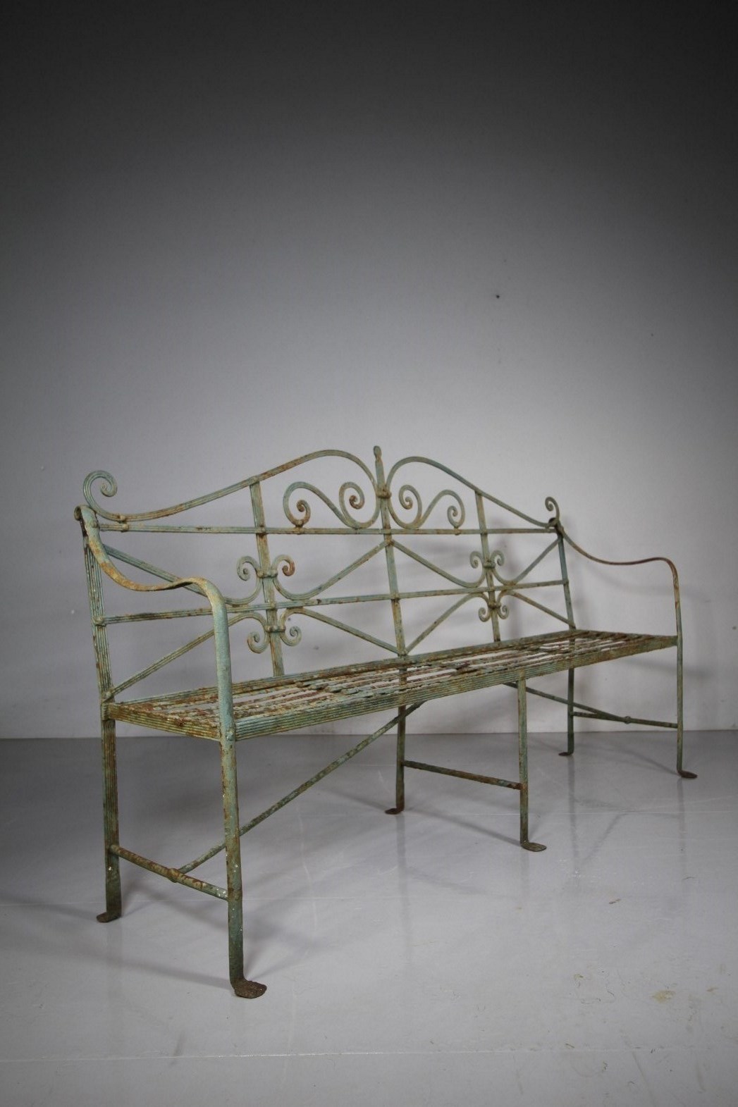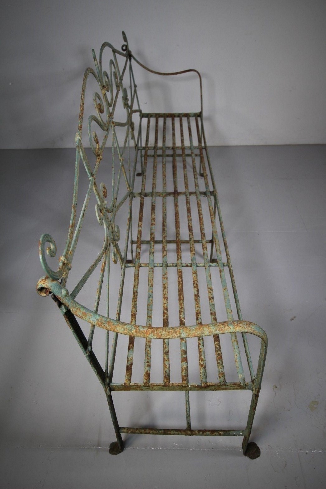 This is a wonderful, early 19th century English country house antique garden bench seat that dates to 1815. The best Regency model and in amazing, very original and complete condition. Large, impressive scale with a tall ornate back rest, lovely shaped open arms, a slatted iron seat and standing on six legs that finish on original iron lion’s paw feet. Still in a lovely old green paint finish. A wonderful, impressive English Regency country house antique wrought iron garden bench. A superb design in fabulous condition.