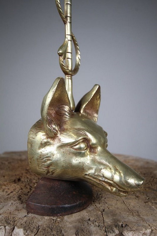 A well cast brass English 19th century antique door porter in the form of a fox head with a whip handle to move thee door stop around. In excellent condition, stamped by the maker and holds doors firmly as it is mounted on a weighted iron stand. Dates to around 1860-70.