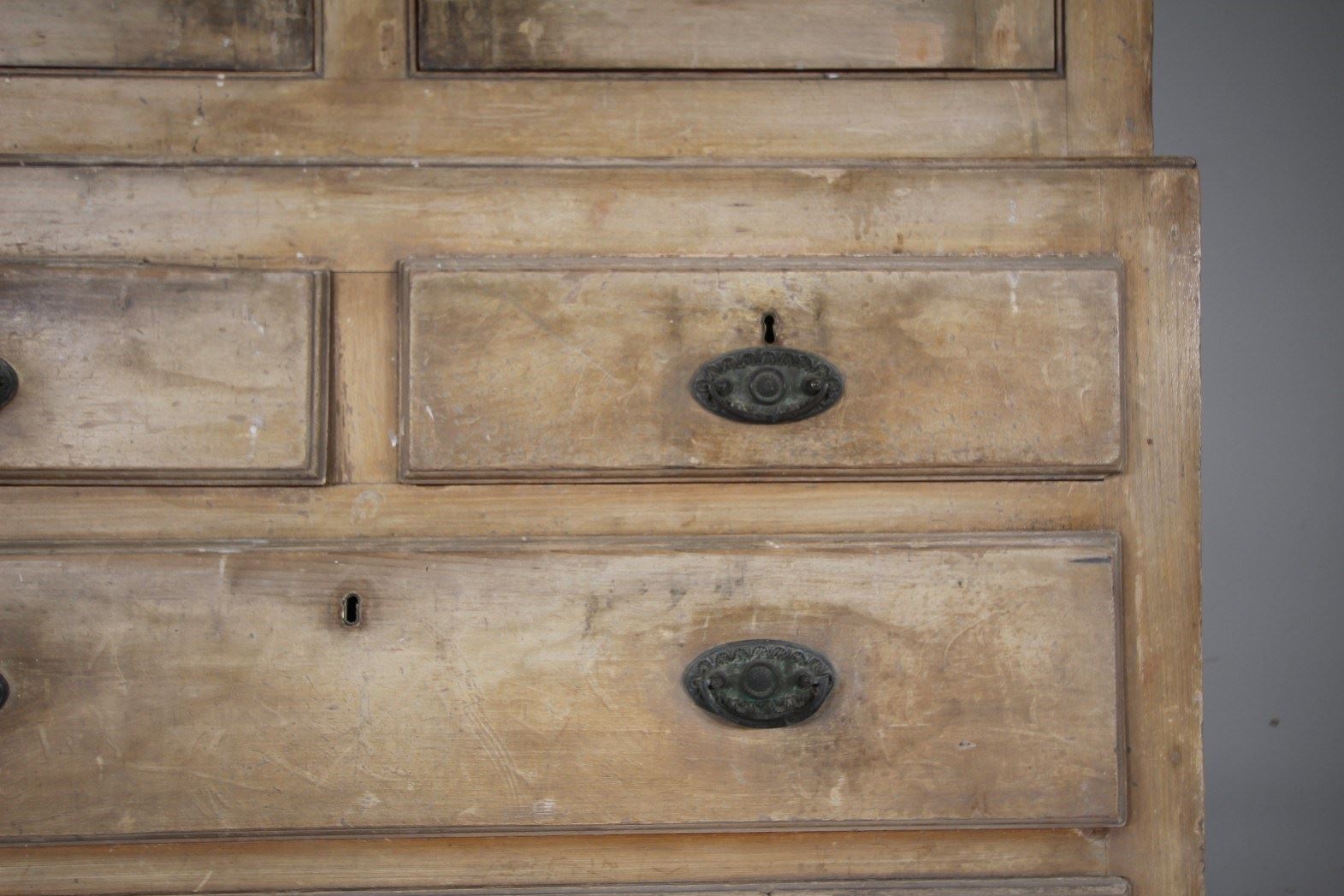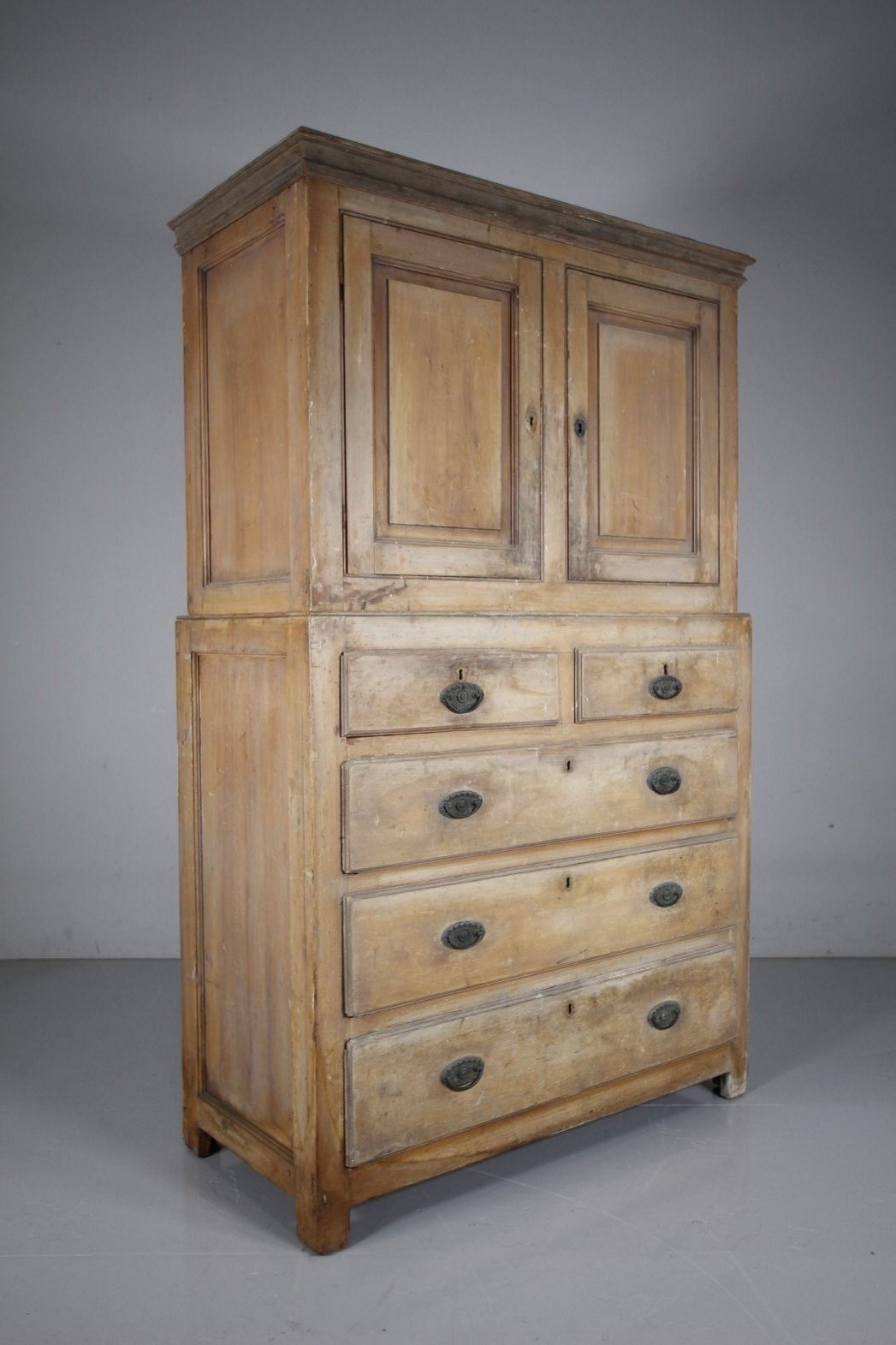 A wonderful English 18th century antique linen press cupboard, originally from Cumbria / Lake District around 1770. Splits into two sections, the top having two fielded cupboards doors along with a moulded cornice, inside is a single boarded shelf. The sides of this Georgian antique cupboard are panelled too with the base having two short drawers over three long drawers, they all have the original Georgian brass ware handles. A fabulous original paint colour, never been overpainted, all in excellent original condition, stands on original stile feet. Perfect as an antique linen press cupboard or would work well in a country kitchen for storage. A lovely honest example of English original painted pine antique furniture.
