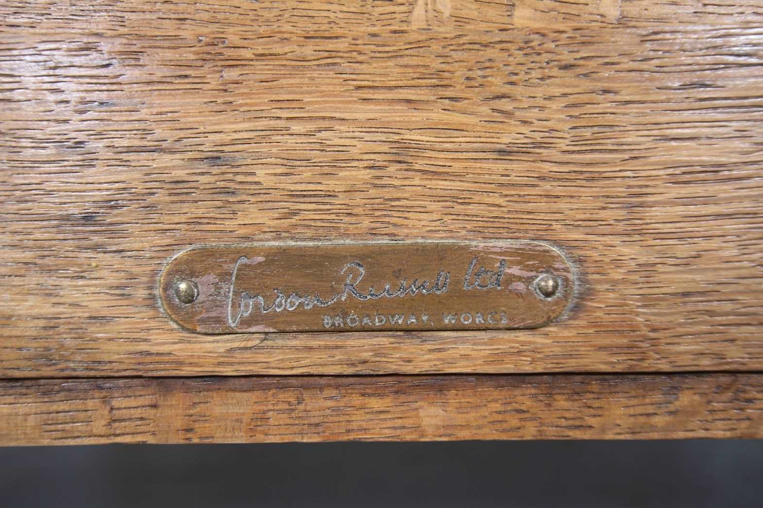 A very good quality, English solid oak dresser base by Gordon Russell in the thirties, part of their Enstone range of furniture. Features a central bank of three drawers which are flanked by a pair of cupboards, the doors have raised panels and they all have the lovely original long oak handles. Stands well on hexagonal oak legs, the sides are well panelled, as is the back of the dresser base. All in excellent clean condition throughout, the top has rounded corners, shelved inside the cupboards and complete with the original copper Gordon Russell makers label.