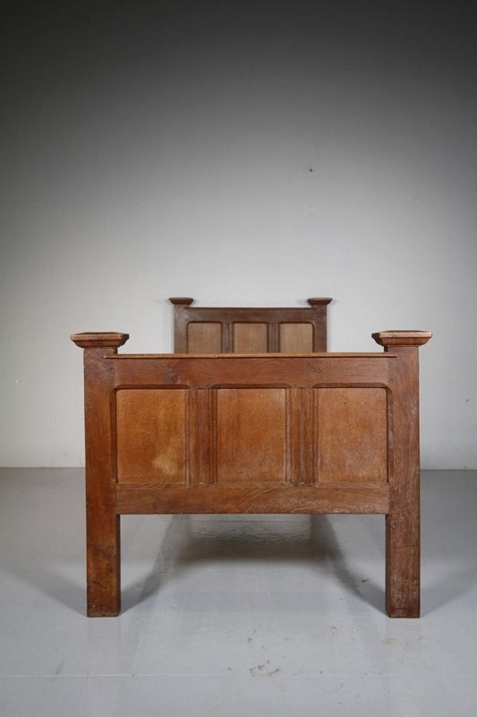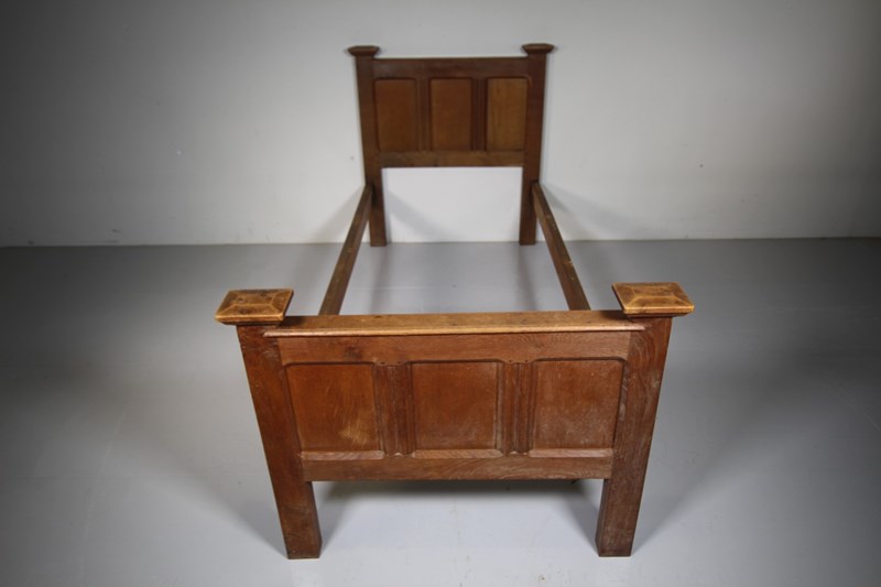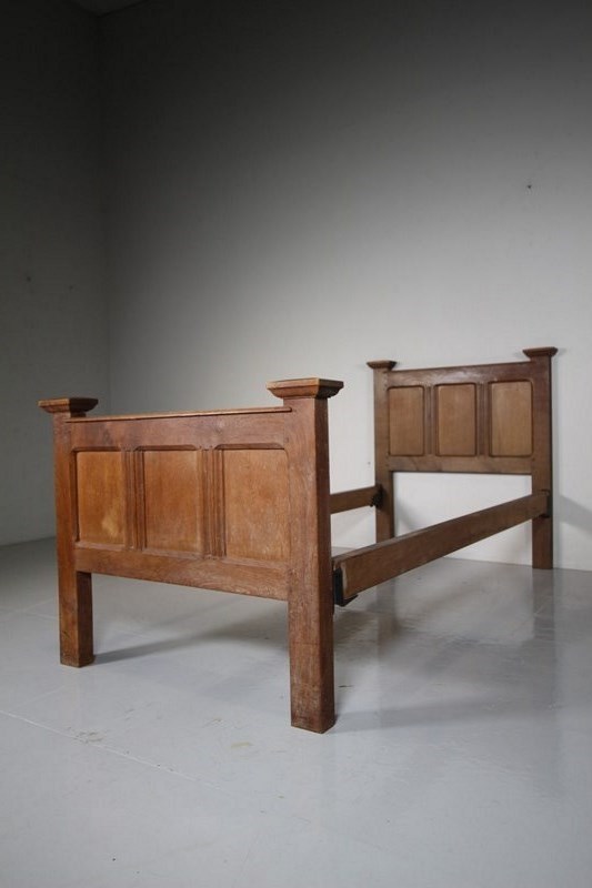 A super quality antique oak single bed by Gordon Rissell in 1910, designed exclusively for the Cotswold hotel, The Lygon Arms. A rare model, made in solid English oak, in the original finish and featuring well panelled head board and matching foot board, all pegged construction and made using fabulous oak timbers. Complete with the original oak side rails. We can have made bespoke wooden base to fit, please enquire. . A rare chance to have a real Cotswold School Gordon Russell antique oak bed with great provenance. Standard Uk single bed size.